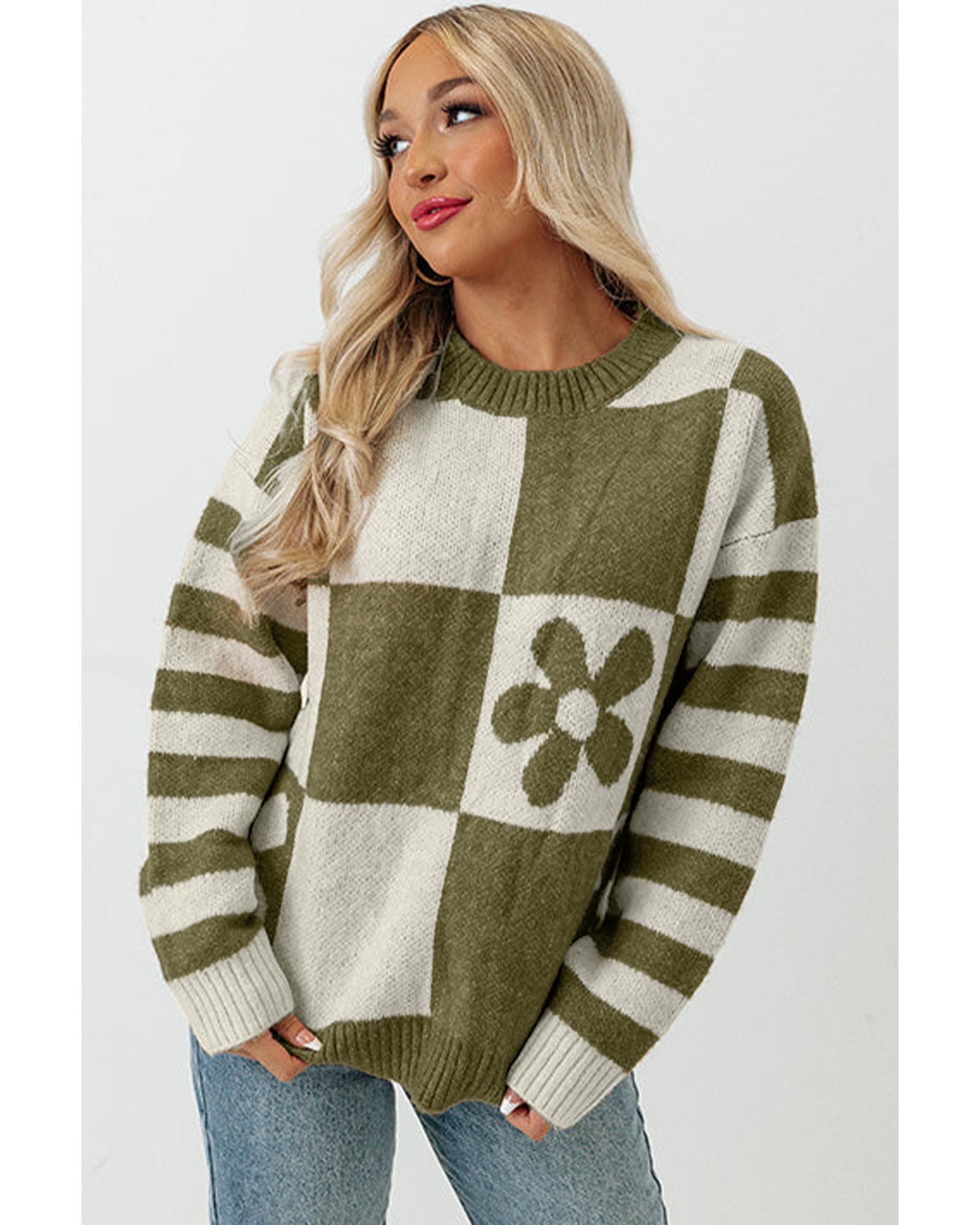• Trendy and warm Green Checkered Floral Print Striped Sleeve Sweater