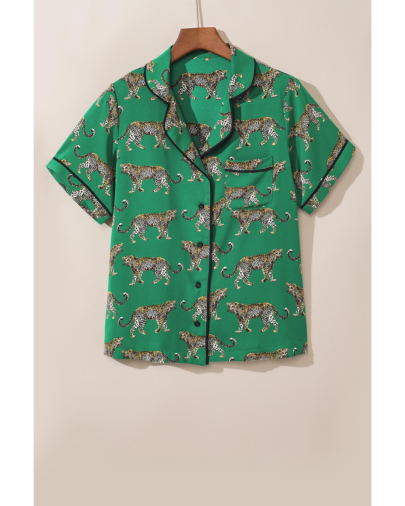 Green Cheetah Print Short Sleeve Shirt and Pants Pajama Set – L