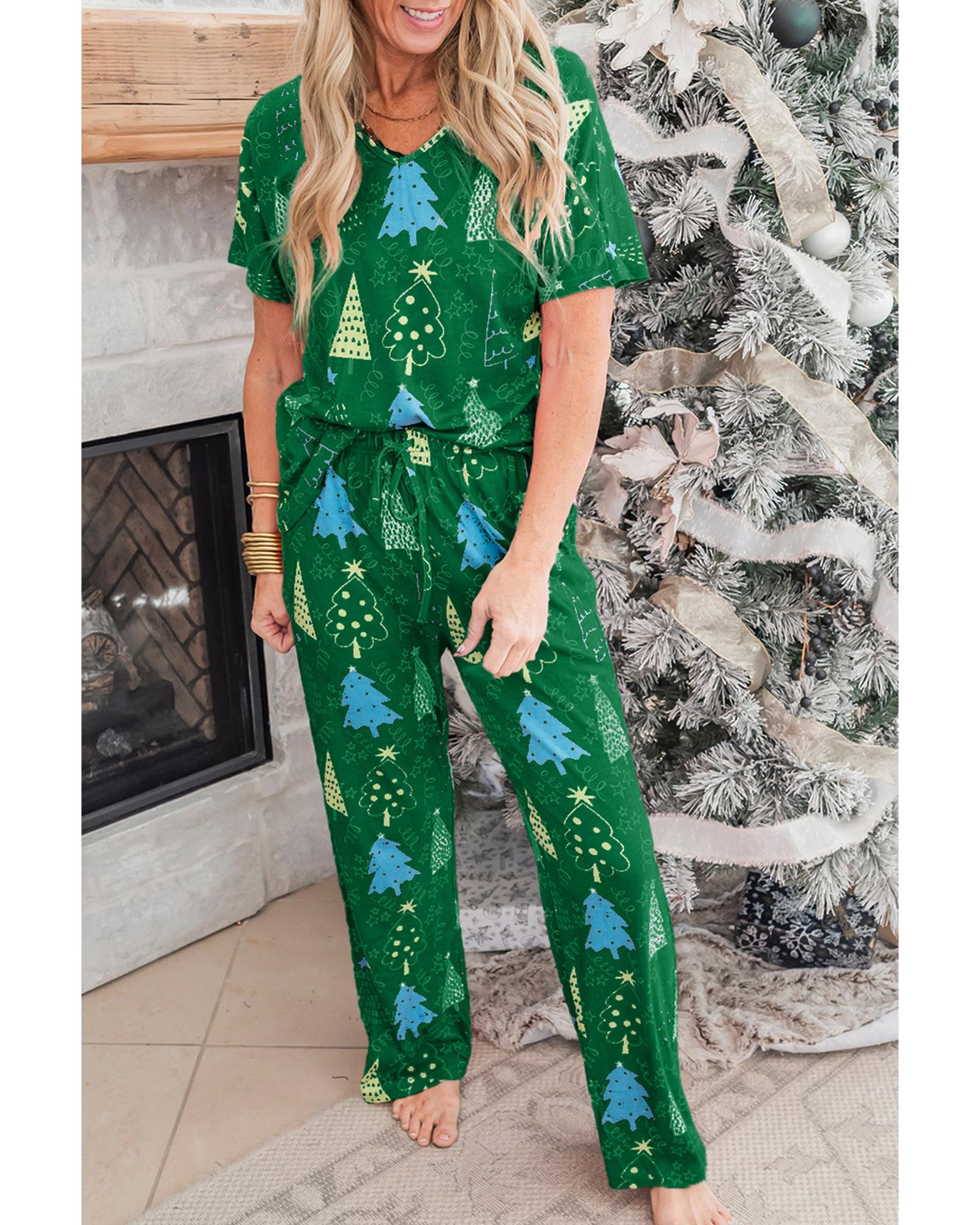 - Stylish Green Christmas Tree Print V Neck Tee and Pants Lounge Set