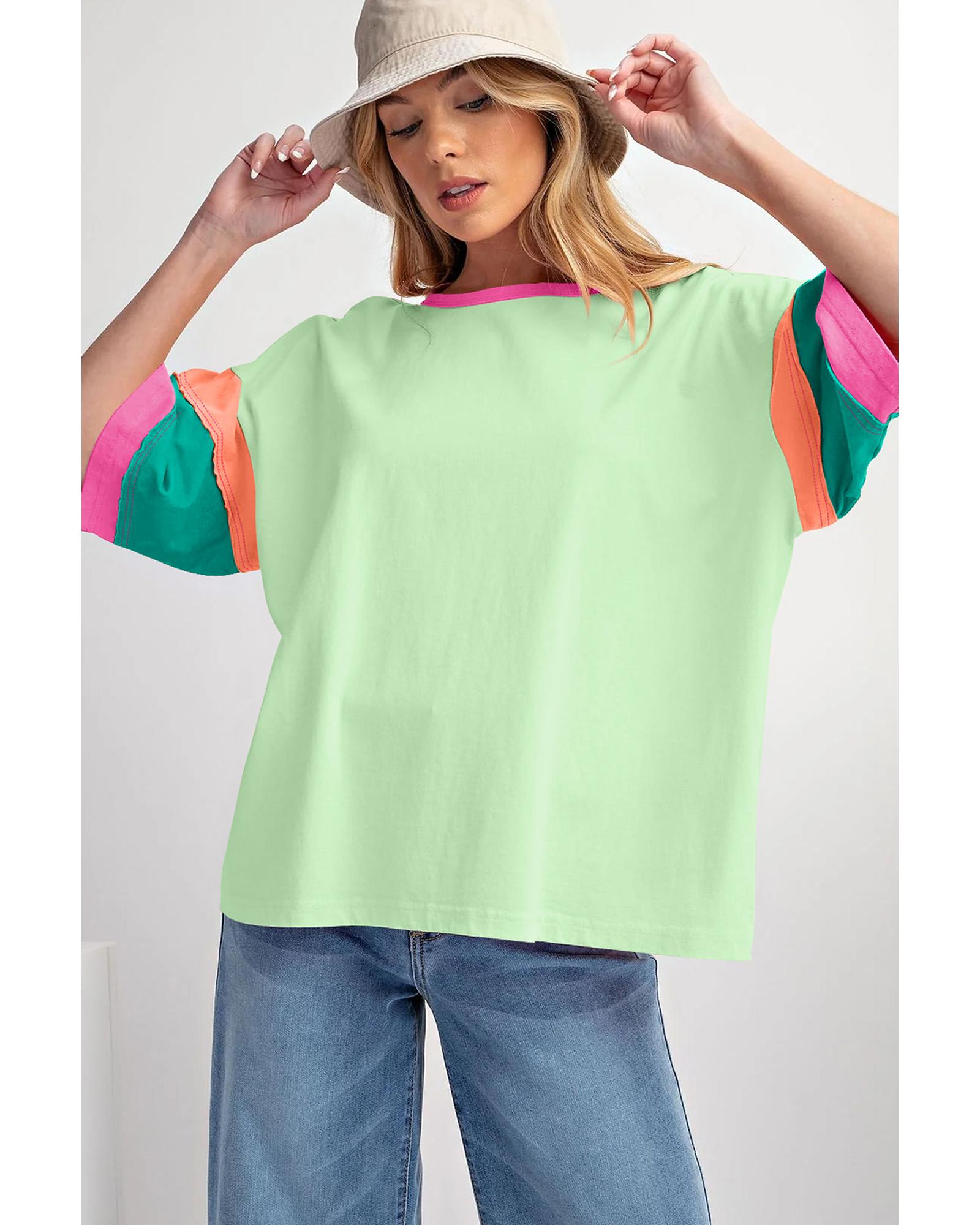 Green Color Block Stitching Sleeve Round Neck Oversize Top – S