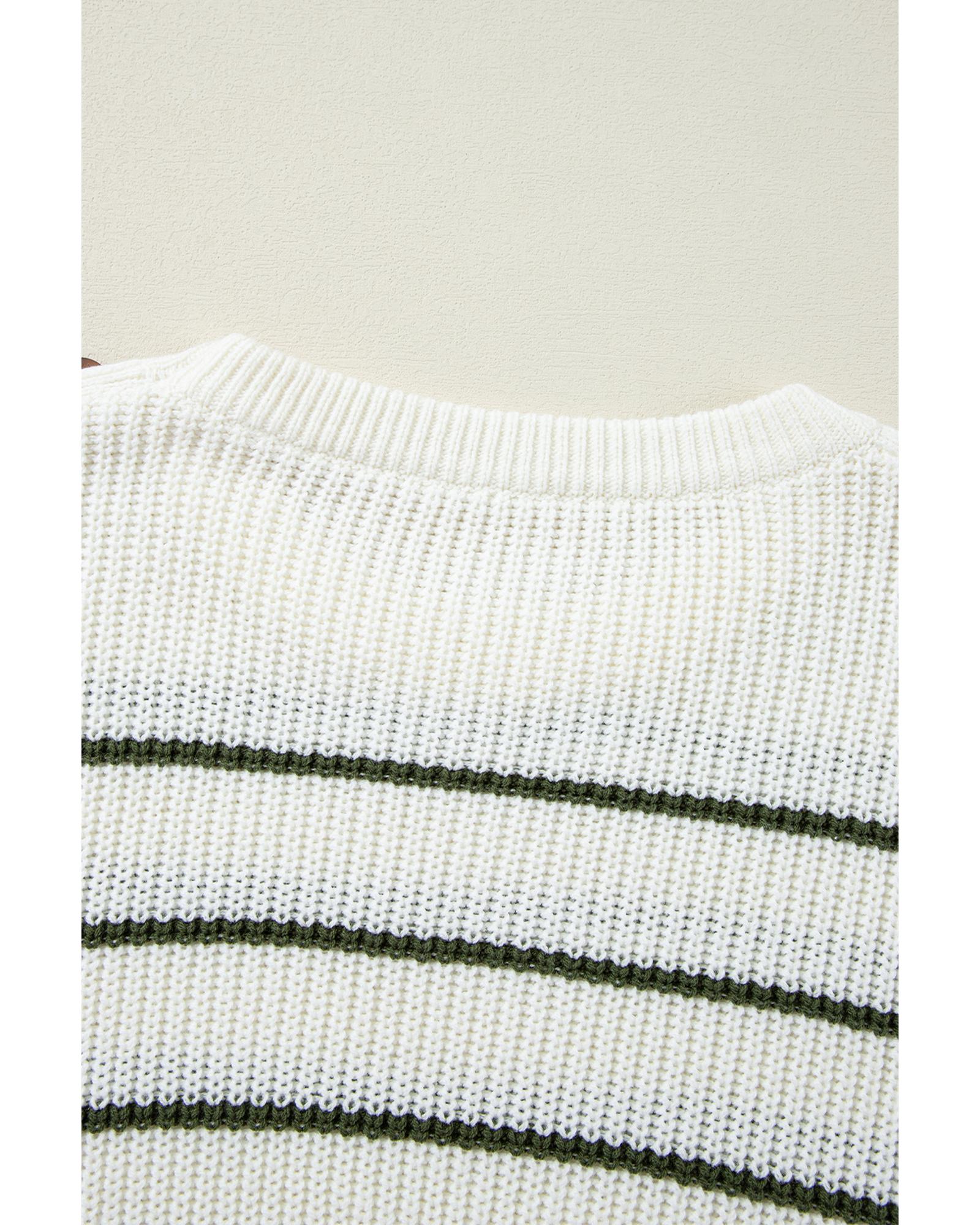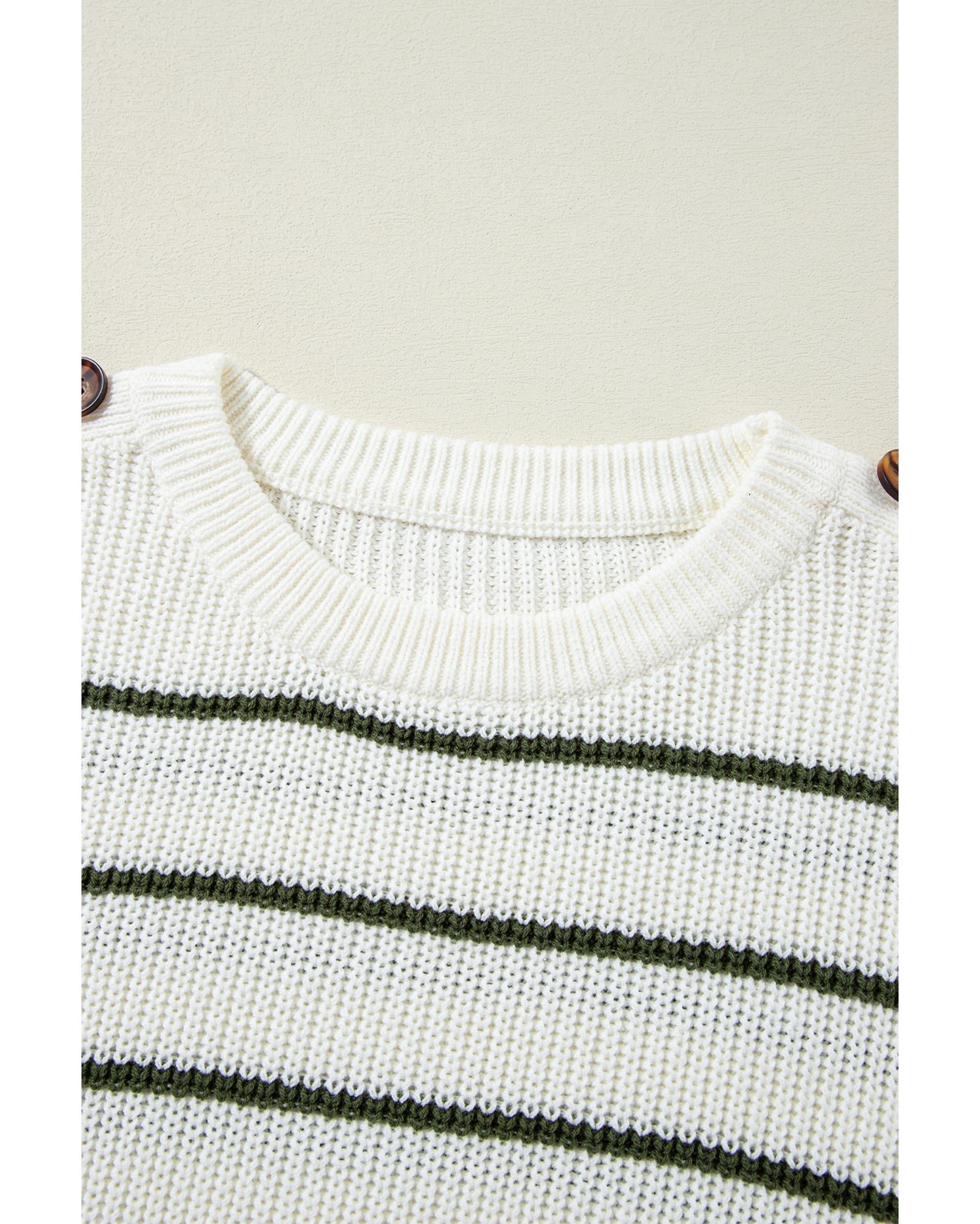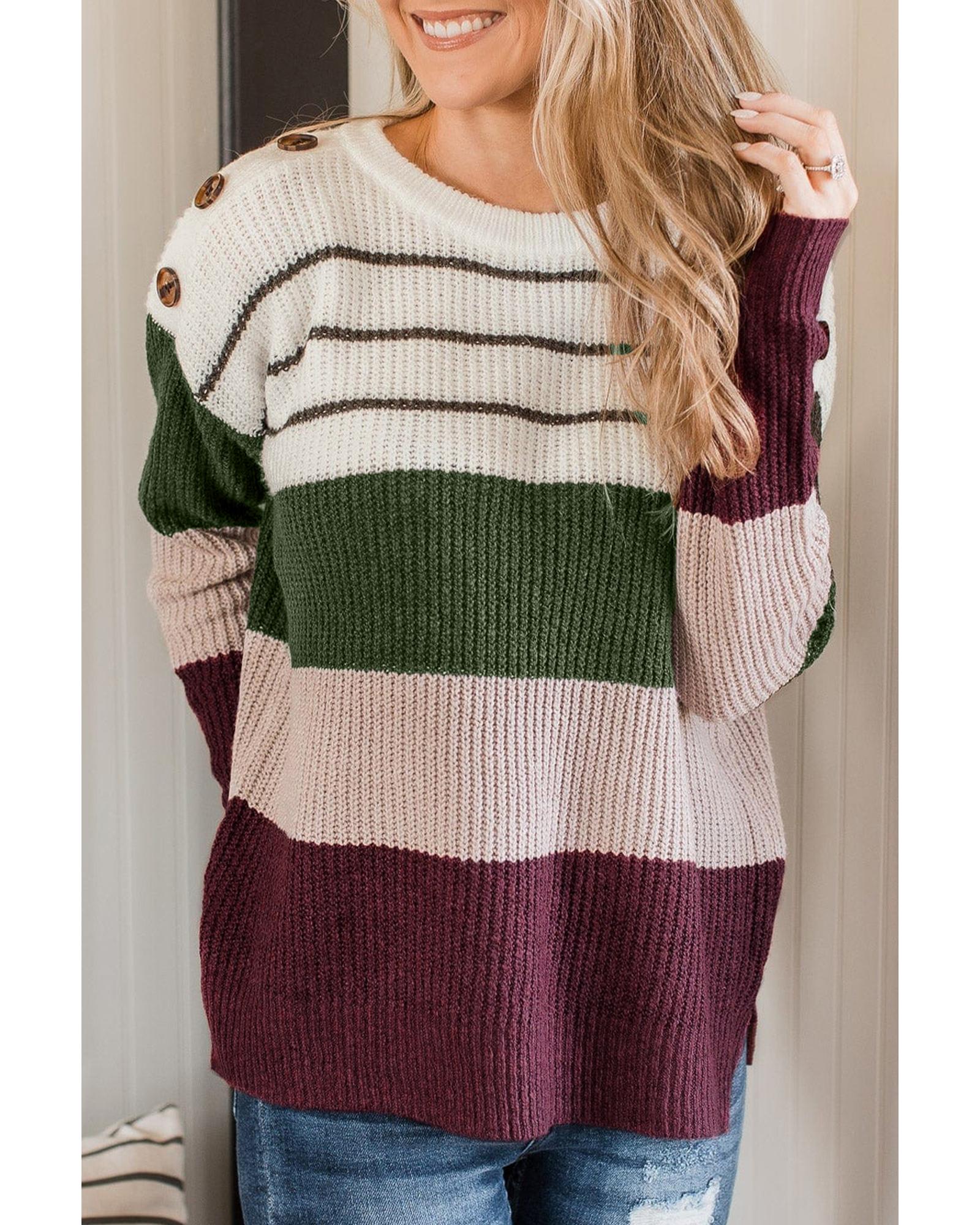 Green Color Block Striped Buttoned Shoulder Split Sweater – M