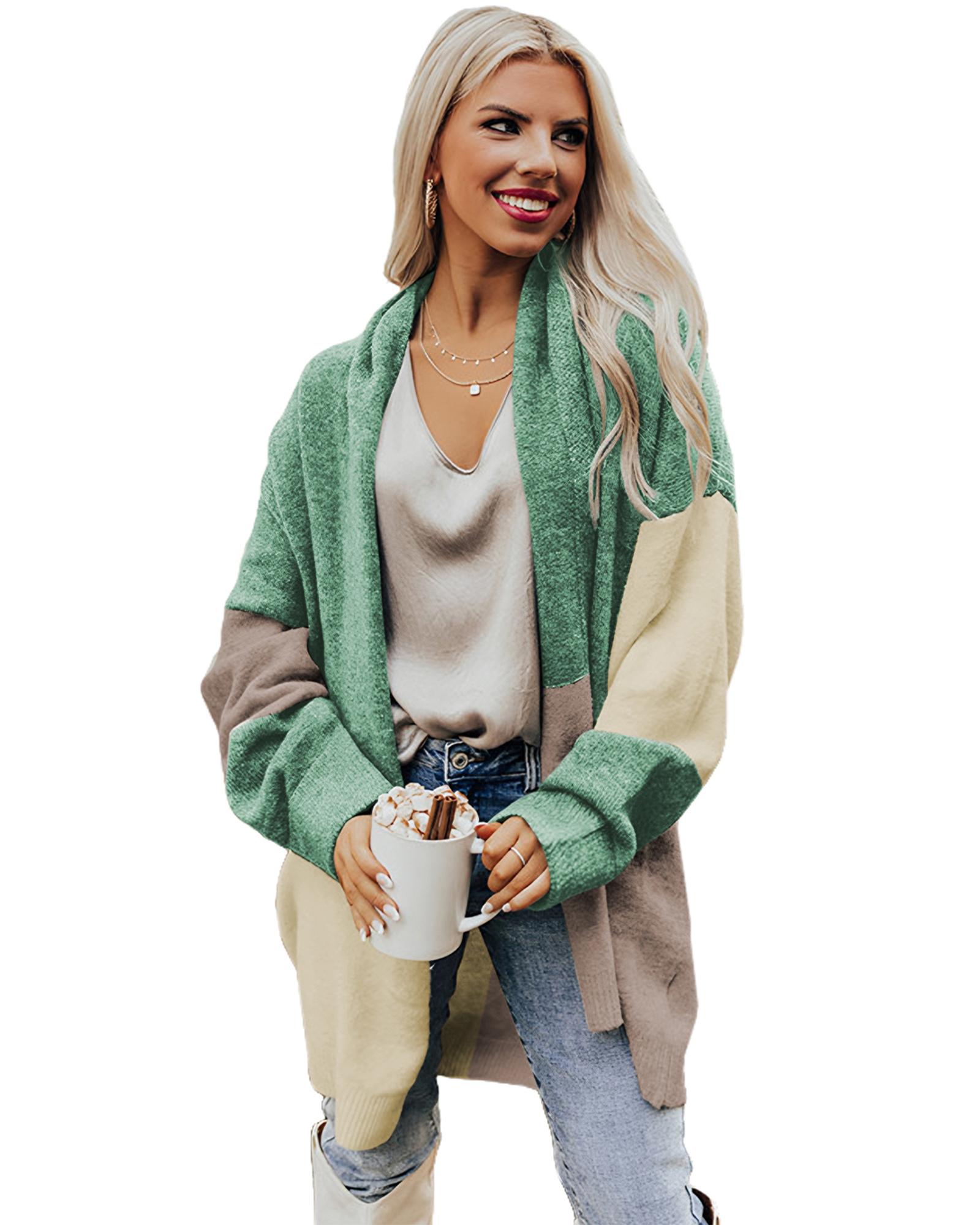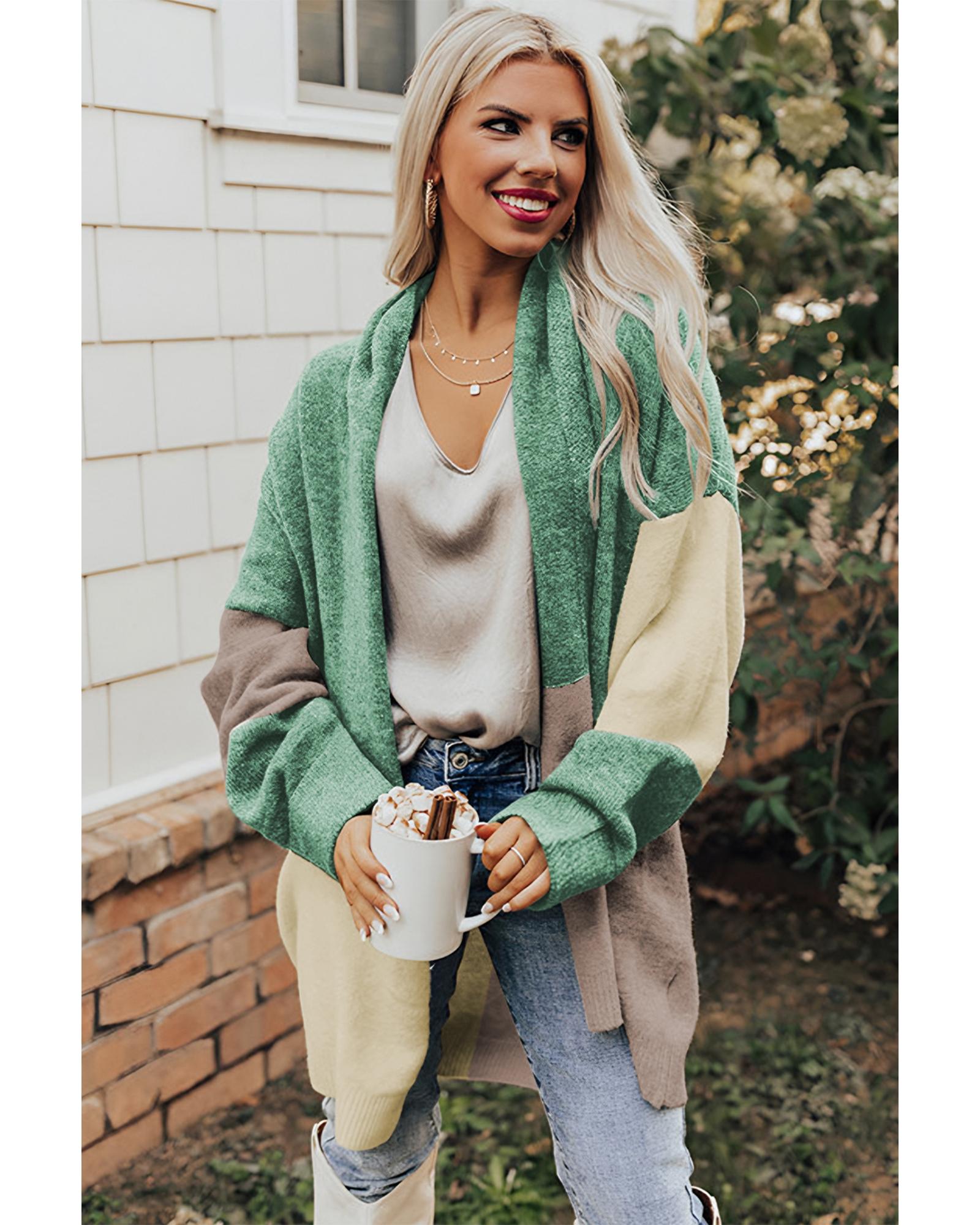Green Colorblock Draped Open Front Chunky Cardigan – L