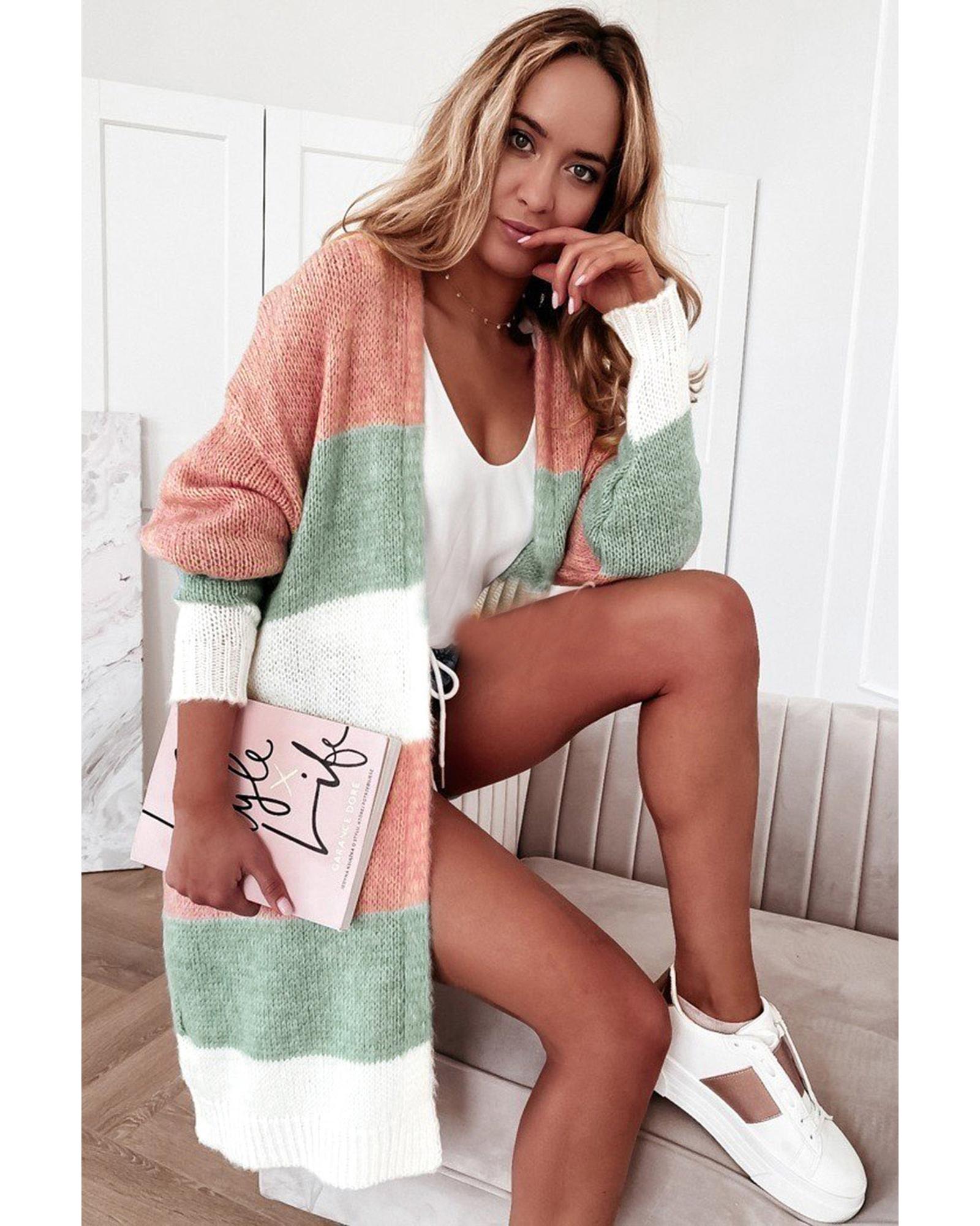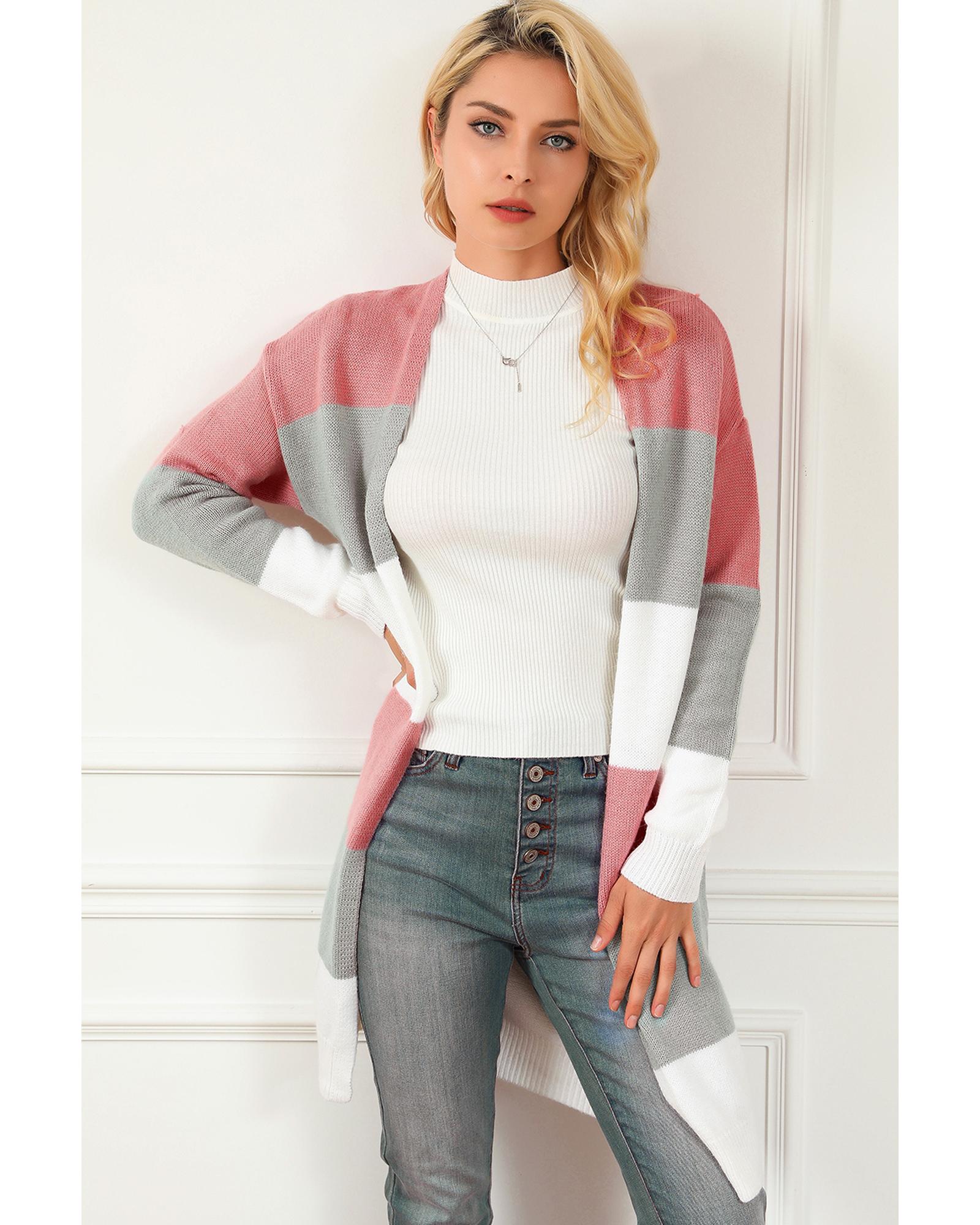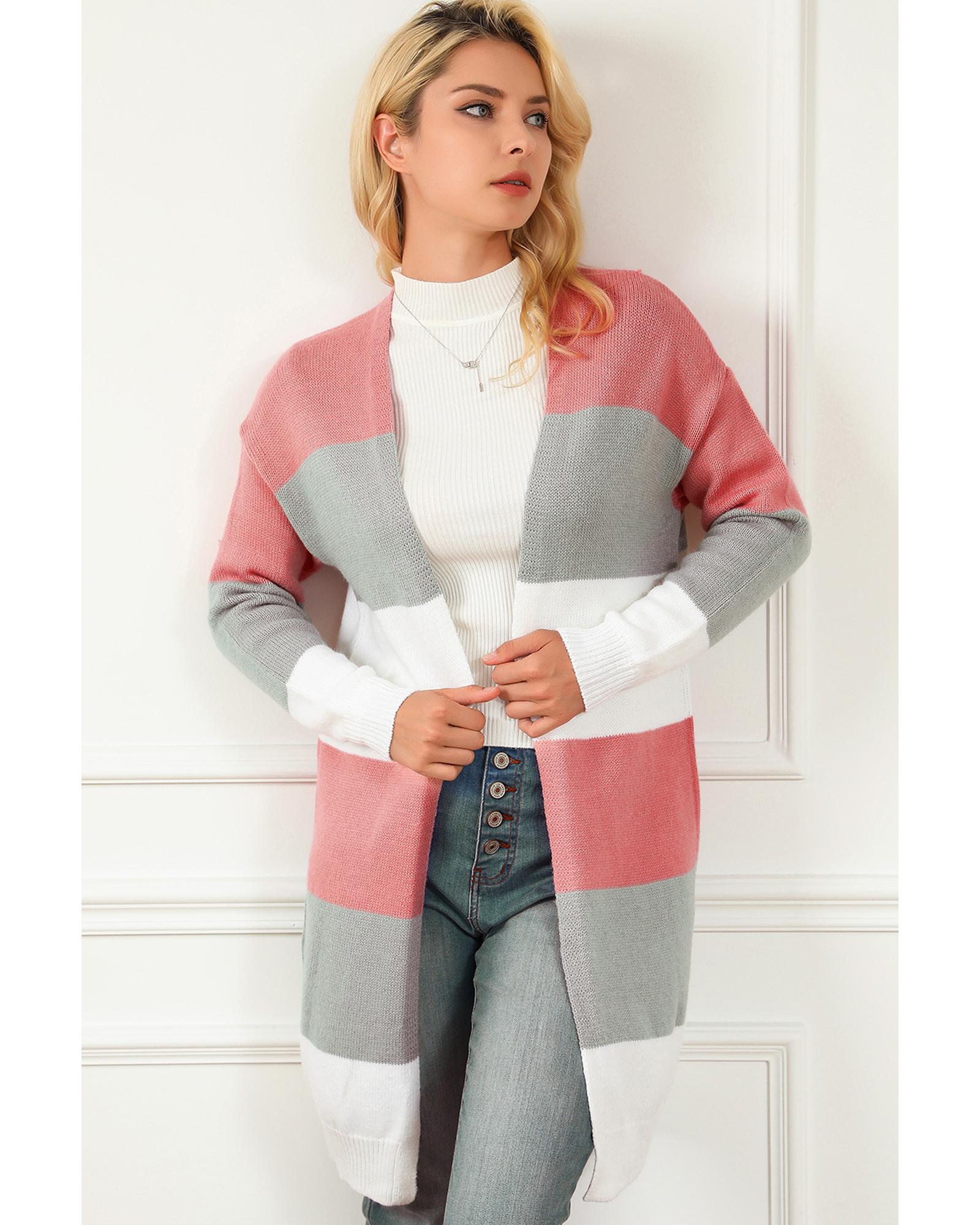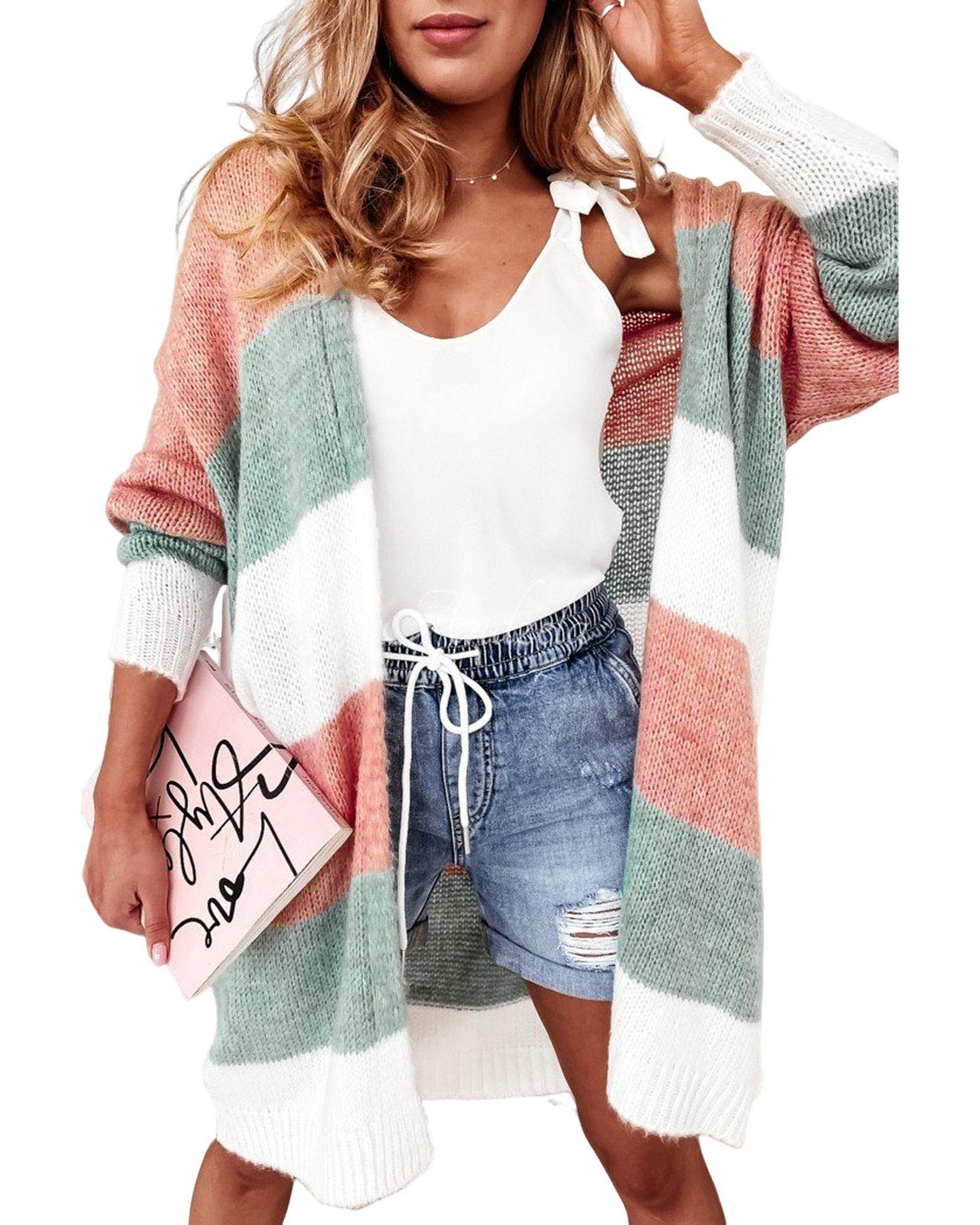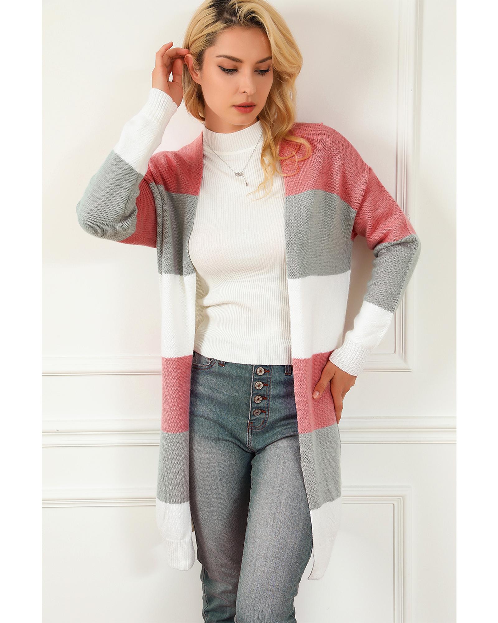 Super cute sweater with colorblock stripes Open - front design with dropped shoulder for a casual look Long relaxed silhouette for easy pairing with fall and winter outfits Made from soft woolen knit for comfort and warmth Available in various sizes