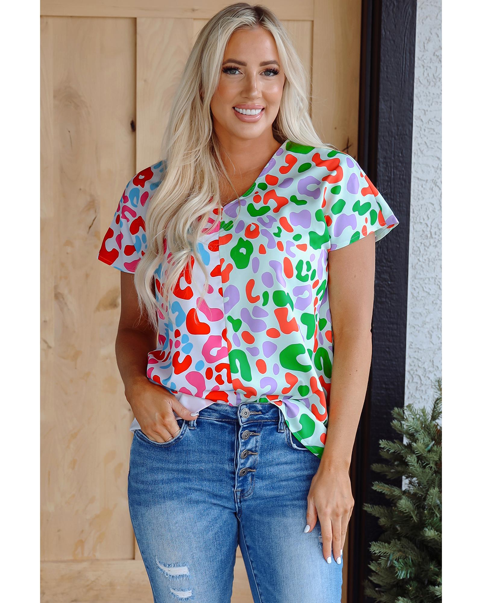 Green Contrast Leopard Print V Neck Short Sleeve Blouse – L