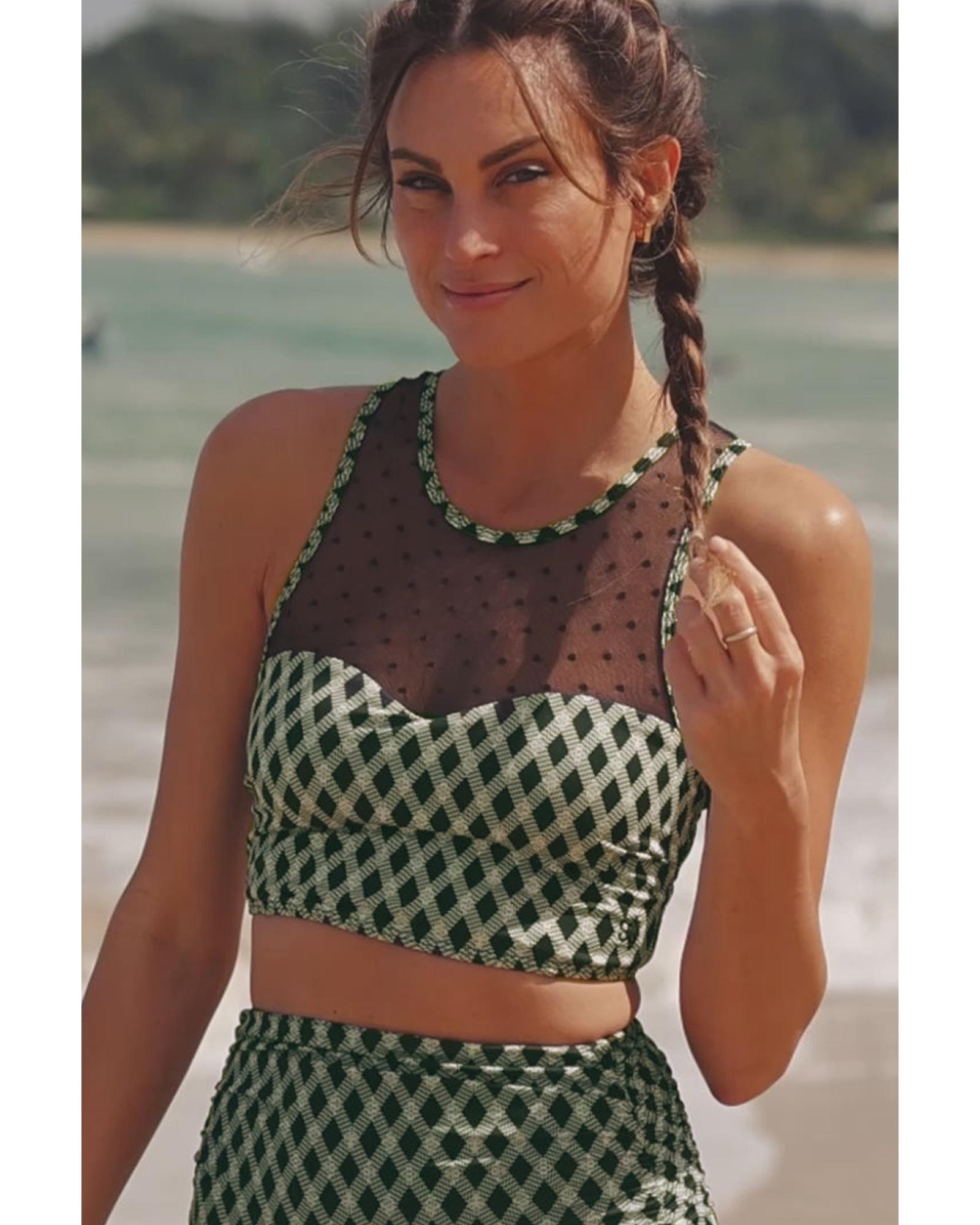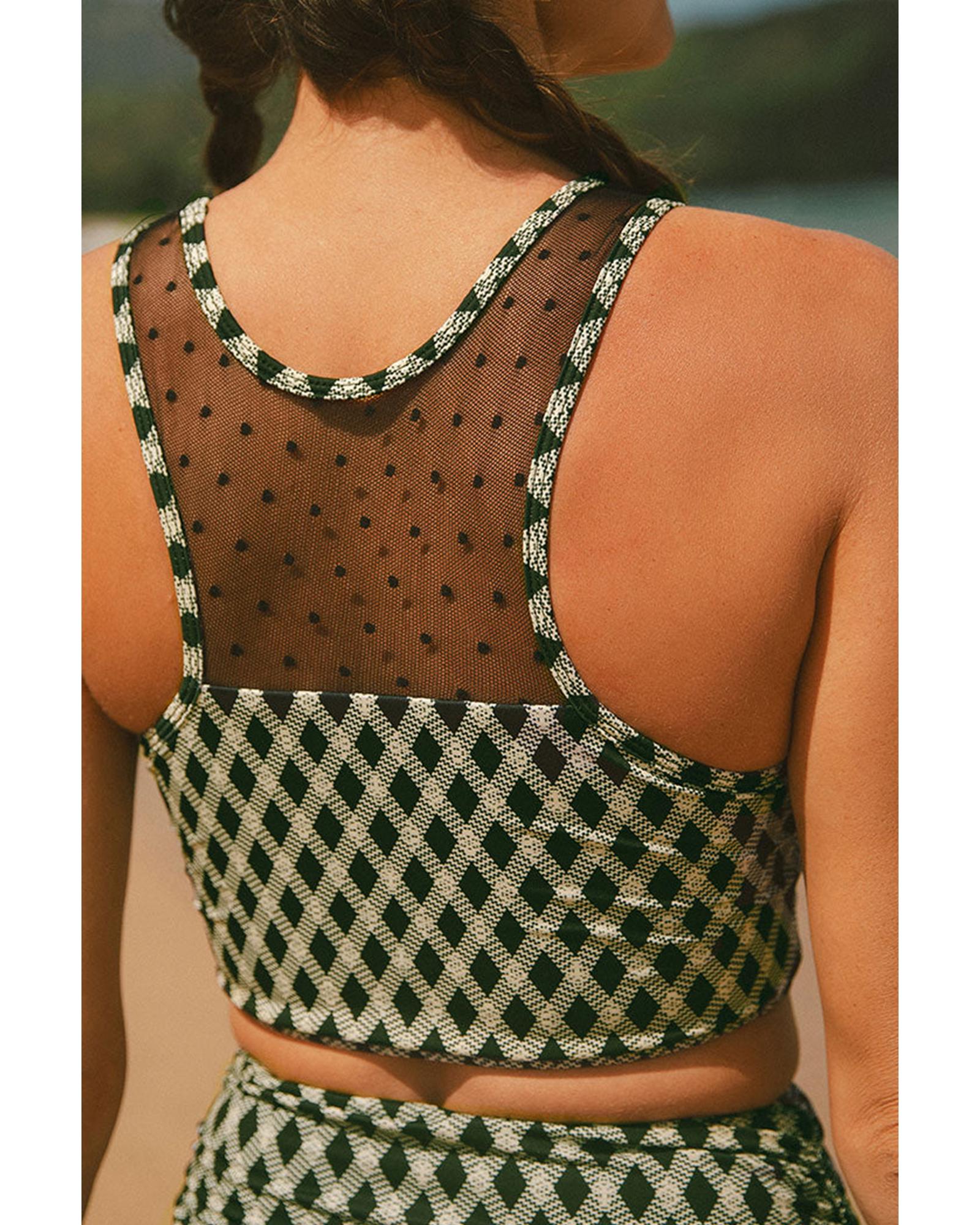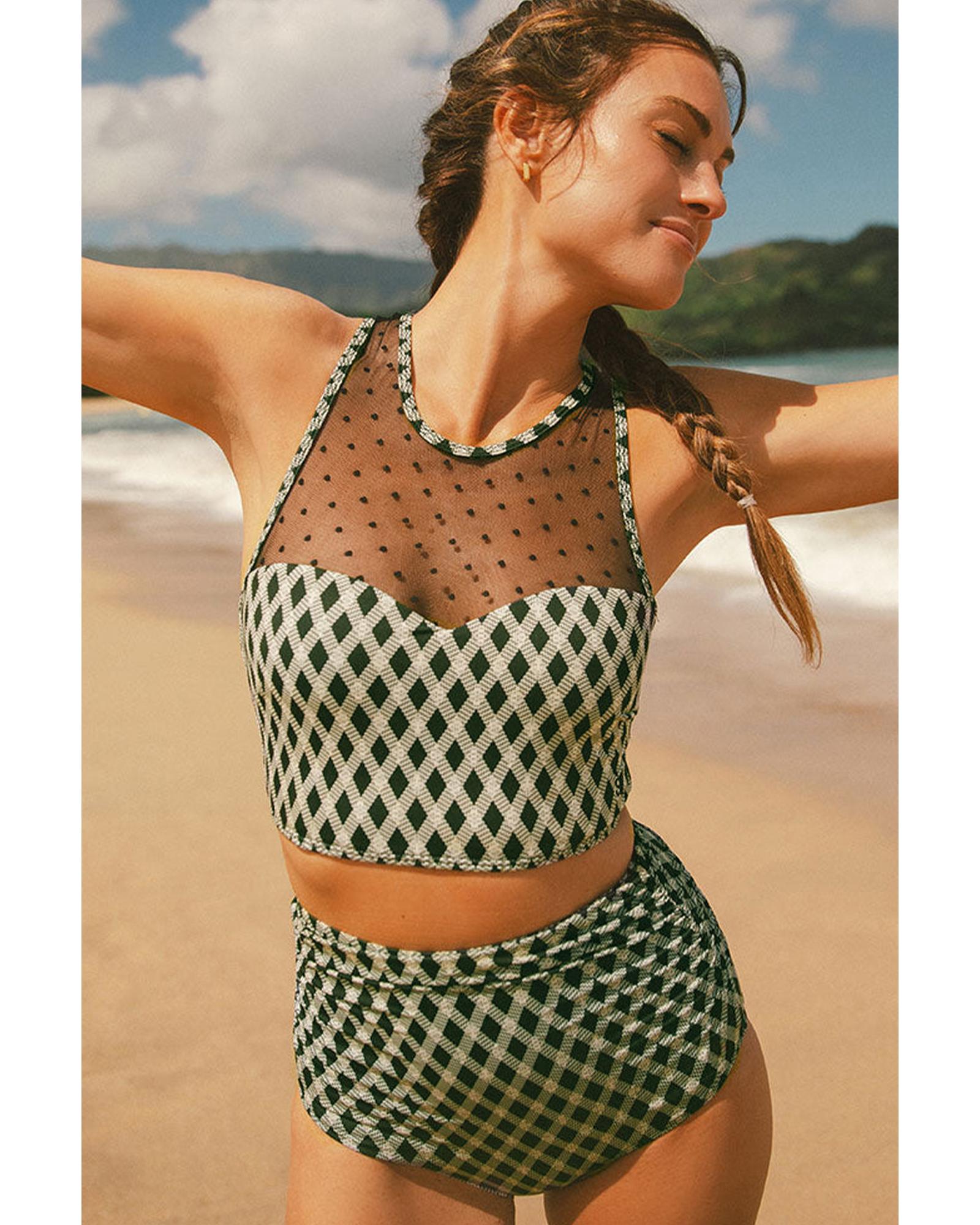 Green Dotted Mesh Plaid Patchwork High Waisted Bikini – L