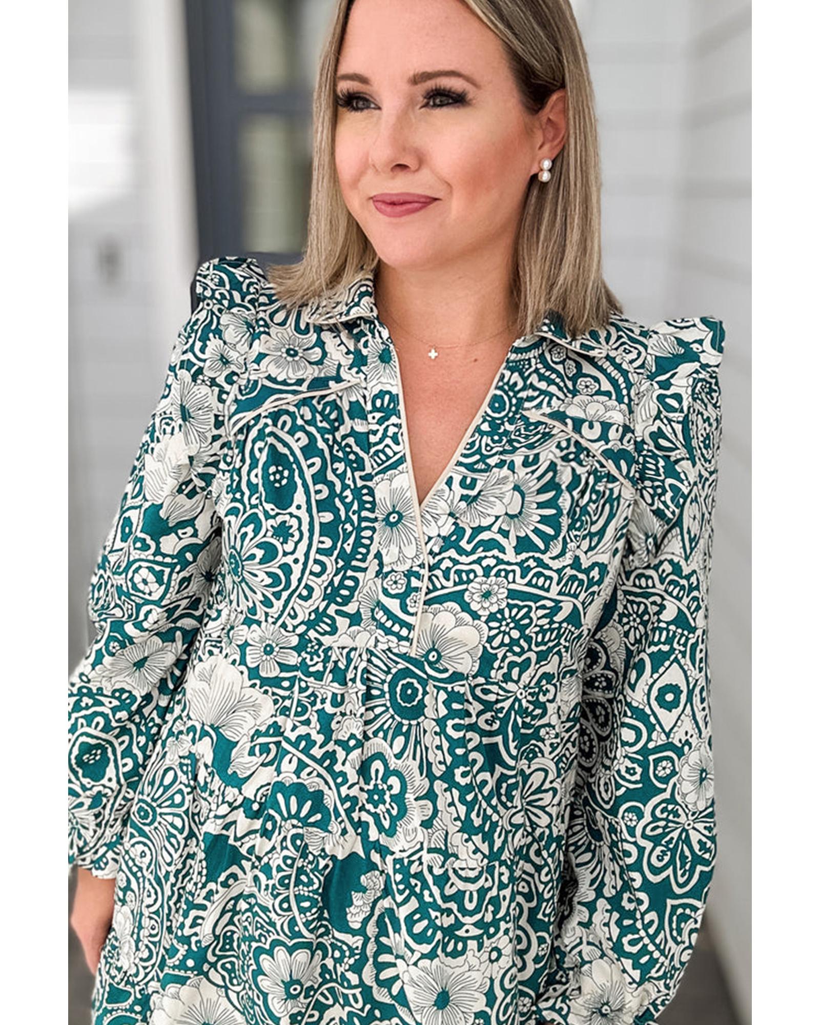 - Green Floral Flounce Sleeve Split Neck Plus Size Dress