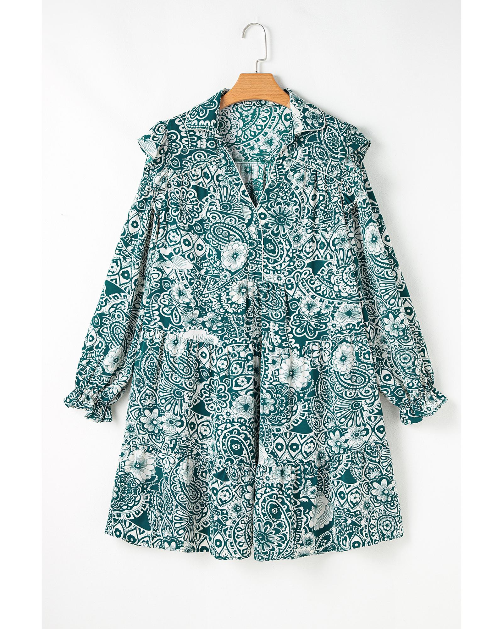 - Green Floral Flounce Sleeve Split Neck Plus Size Dress