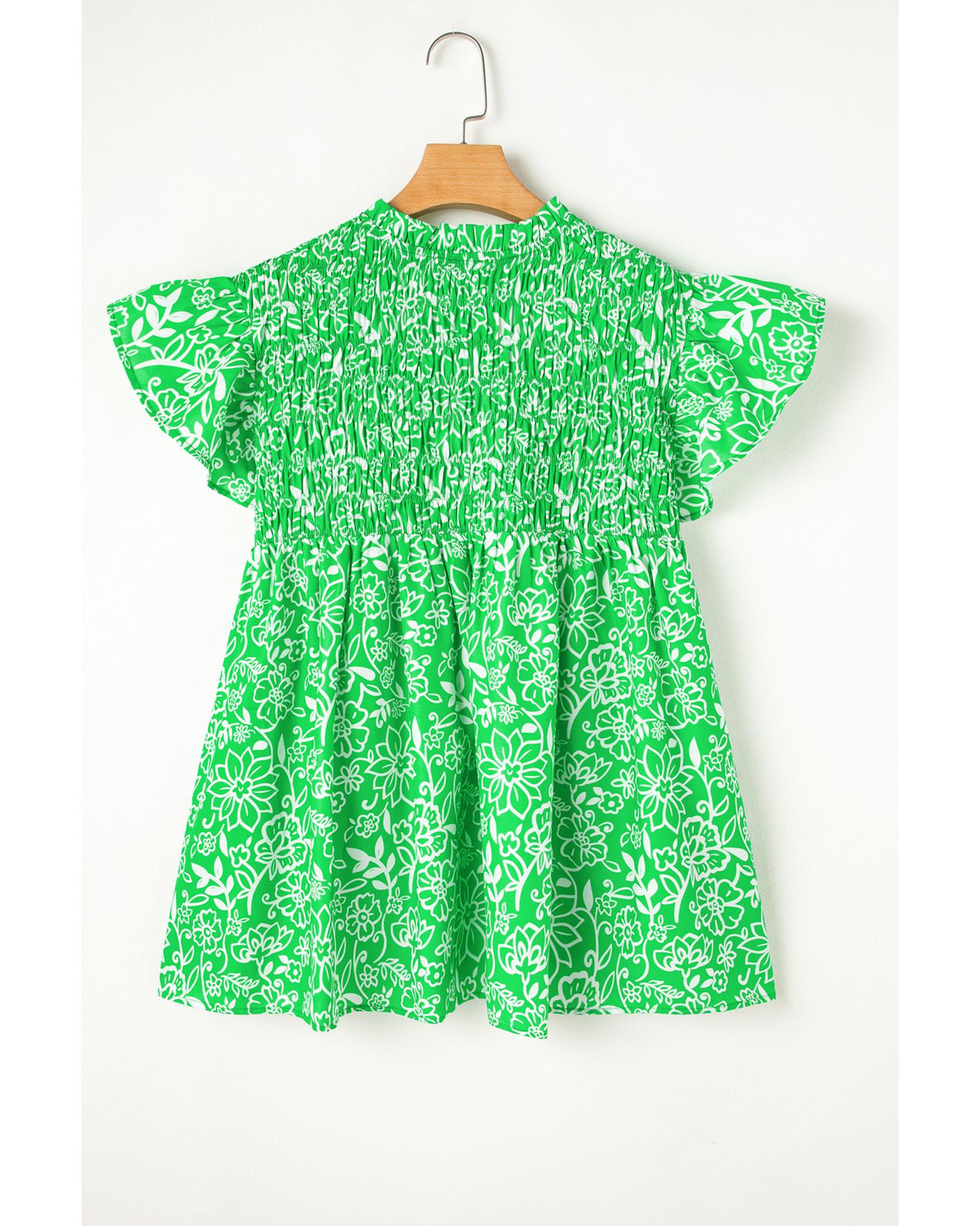 Green Floral Flutter Sleeve Shirred Notched Neck Plus Size Blouse – 4X