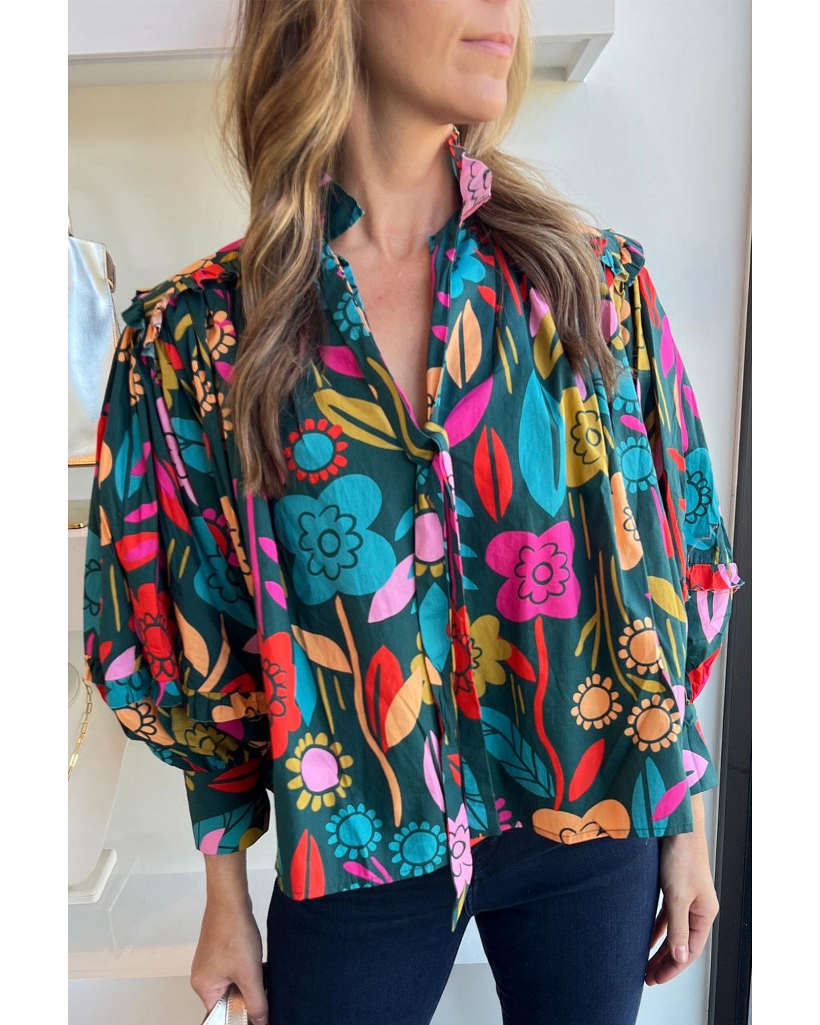 Green Floral Knot Split Neck Puff Sleeve Blouse – M