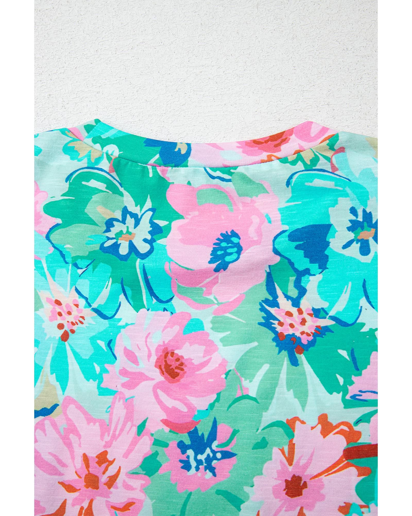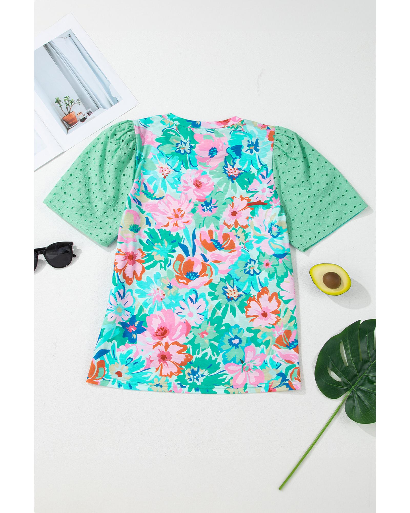 Green Floral Print Eyelet Embroidered Short Sleeve Crew Neck Top – S