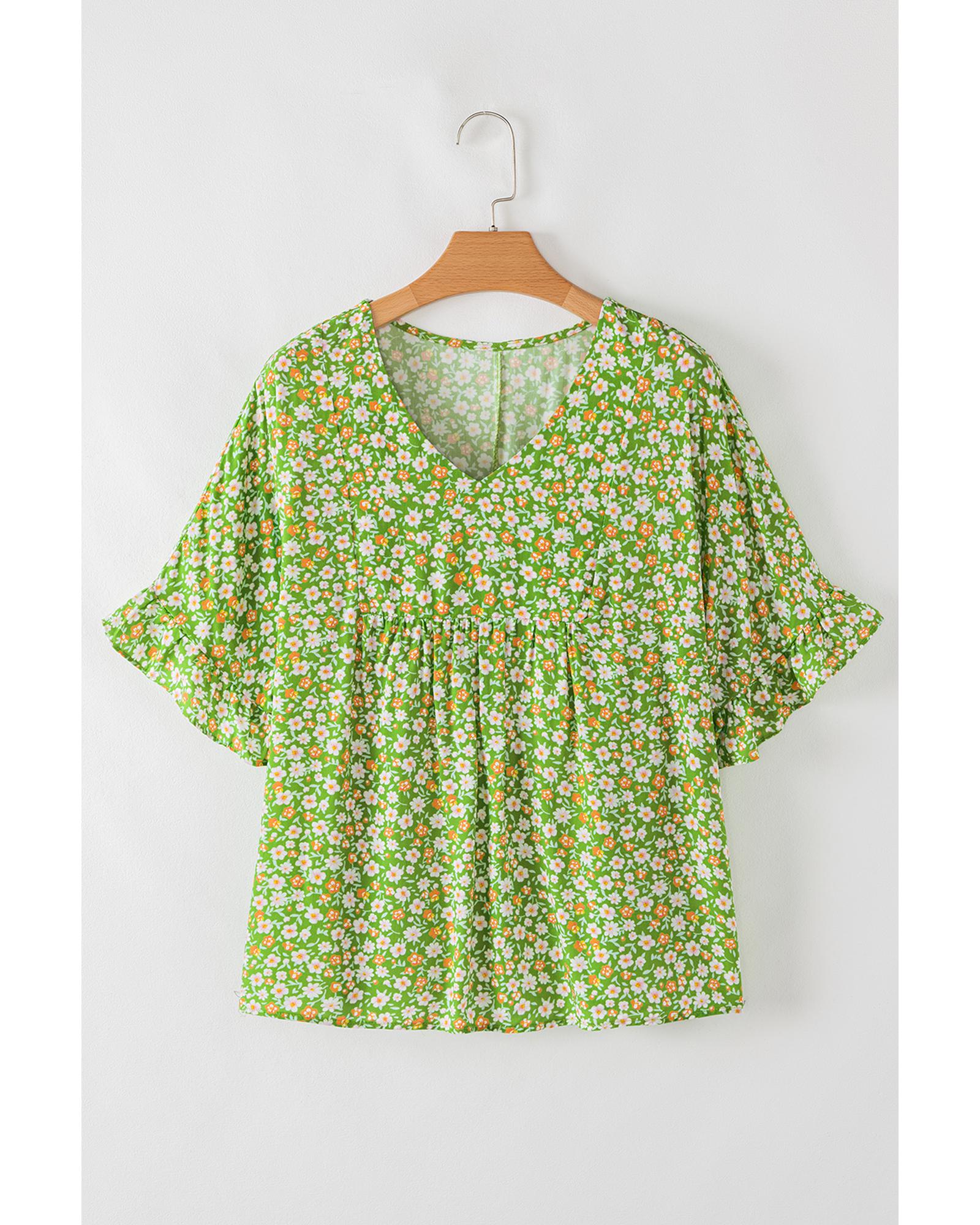 Green Floral Print Ruffle Sleeve V Neck Blouse Top – L