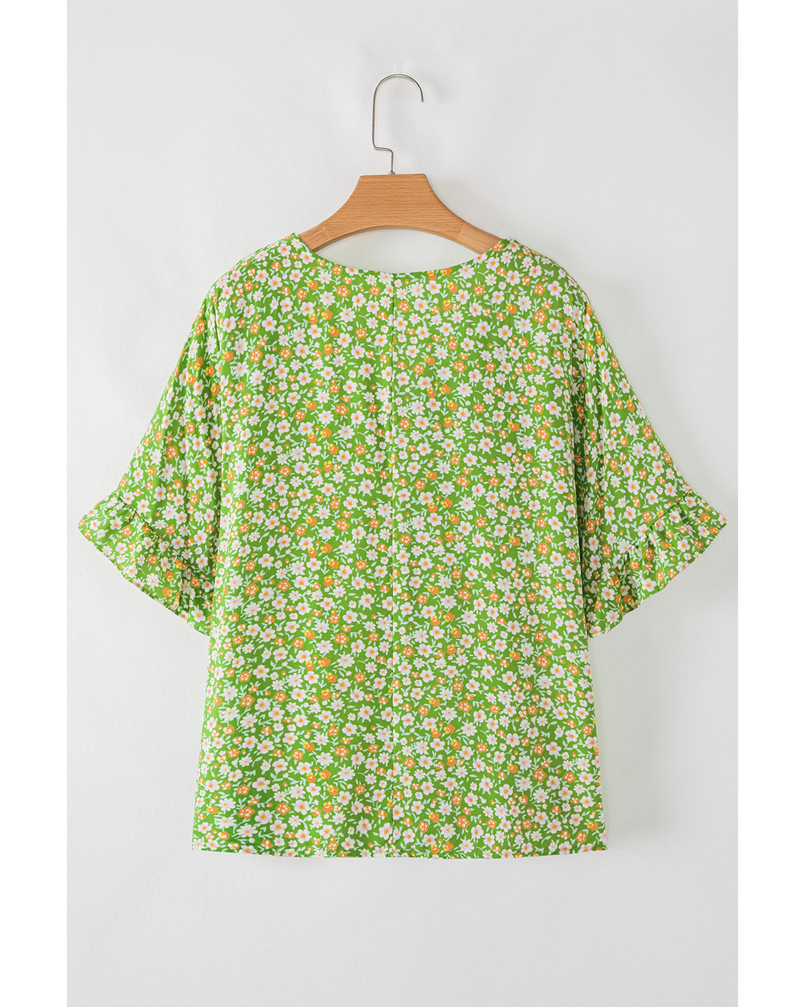 Green Floral Print Ruffle Sleeve V Neck Blouse Top – M