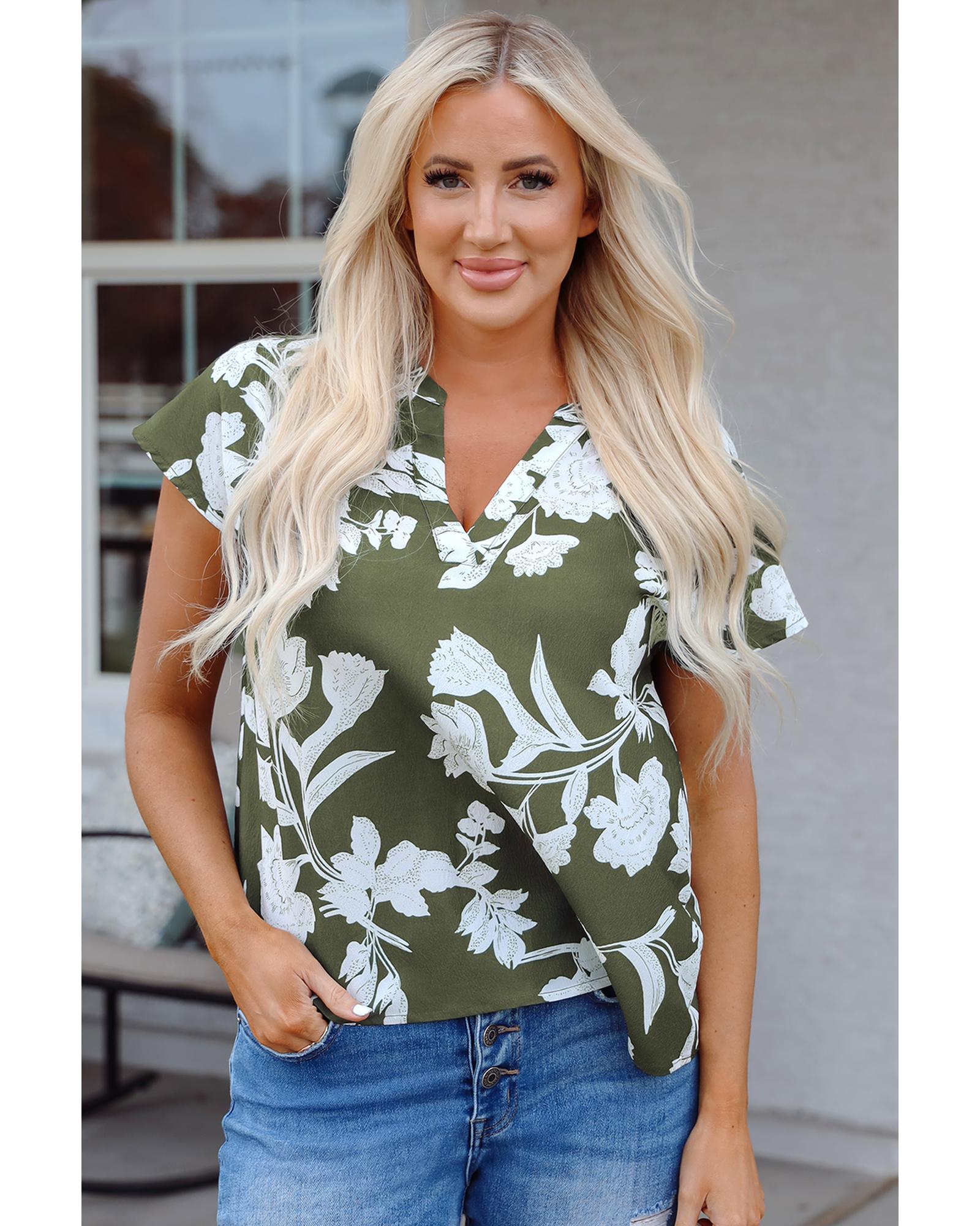 Green Floral Print Split Neck Short Sleeve Blouse – S
