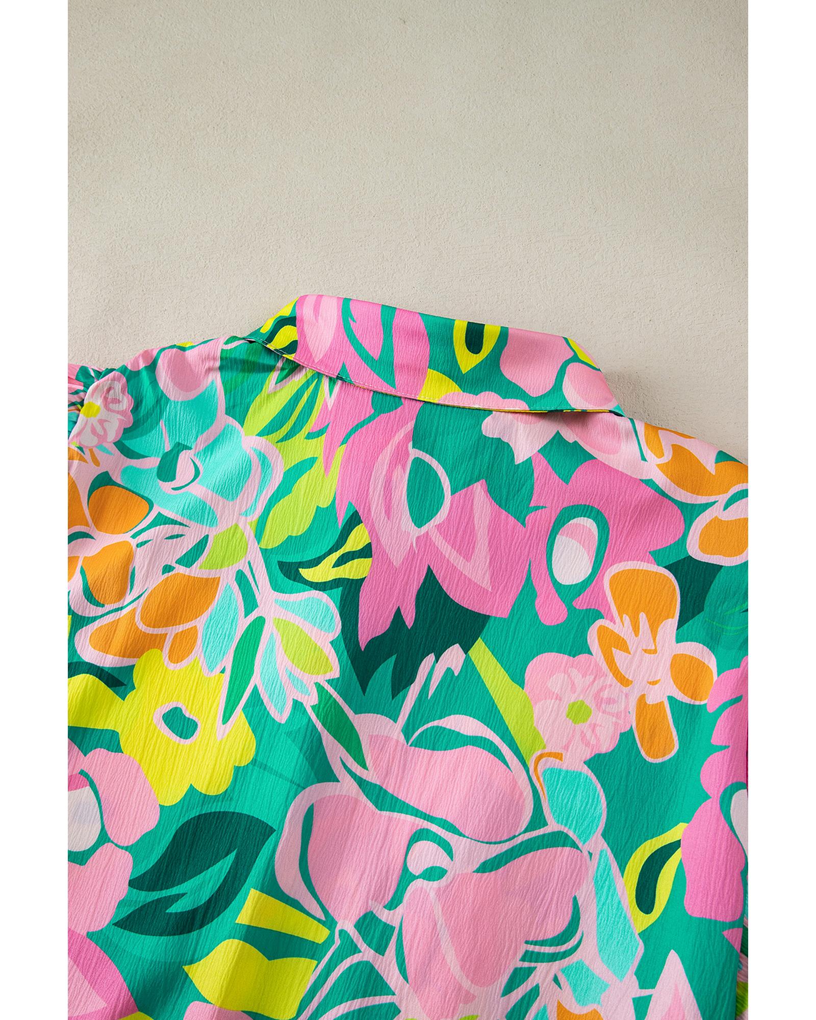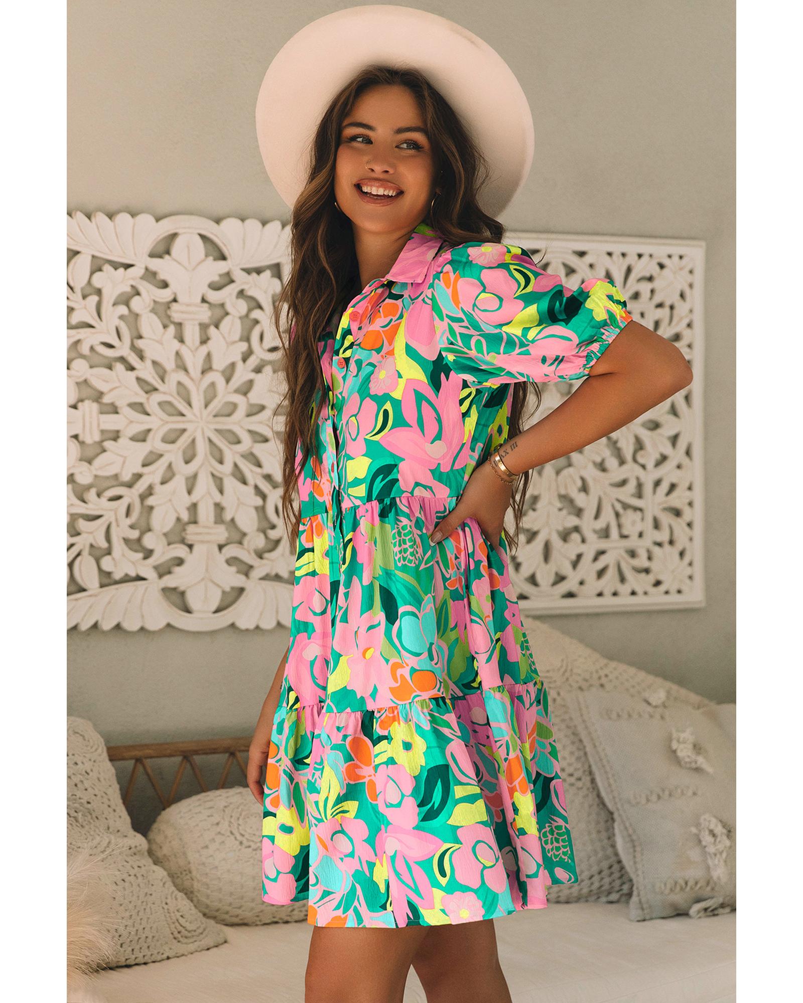 - Green Floral Puff Sleeve Collar Buttoned Babydoll Dress
