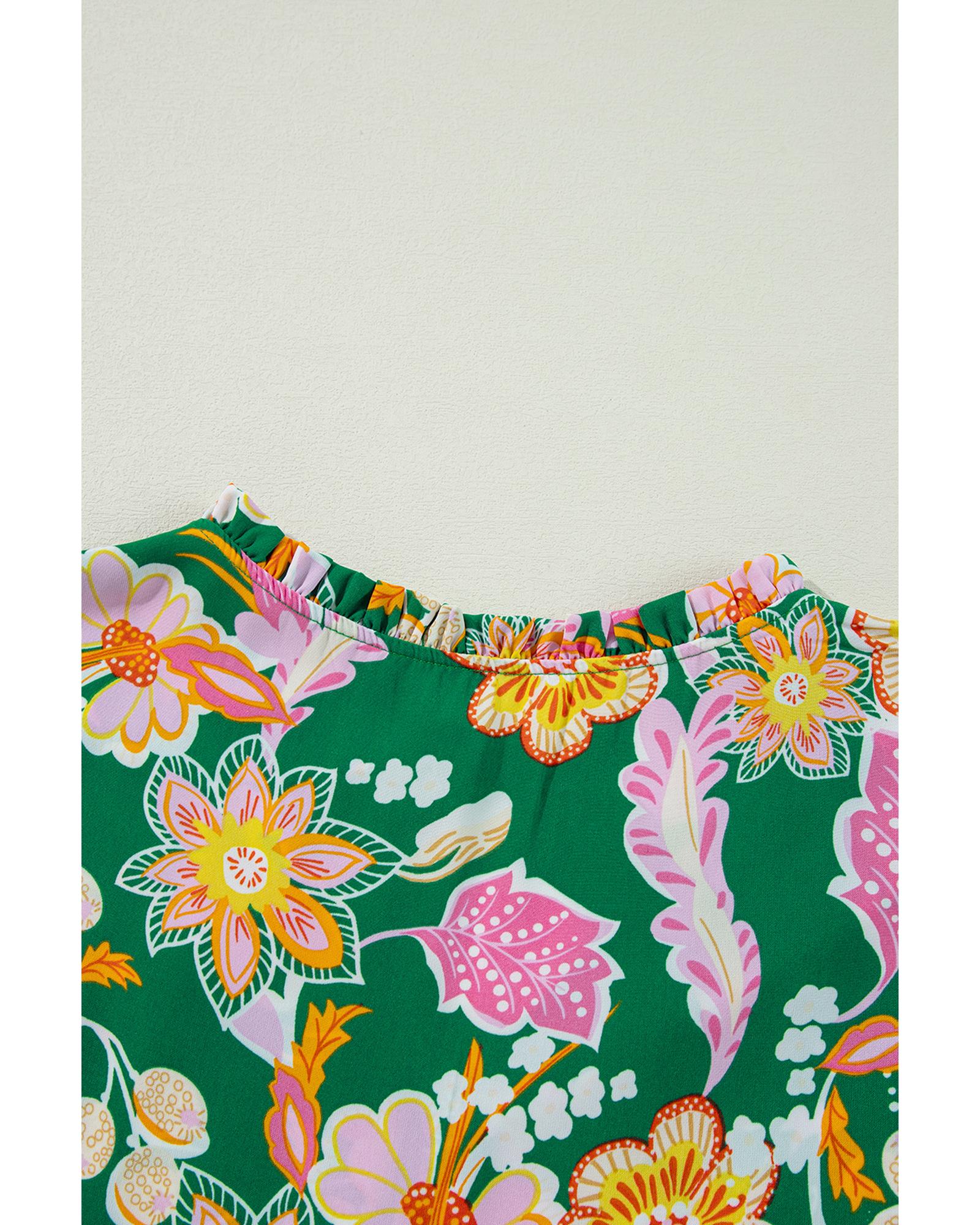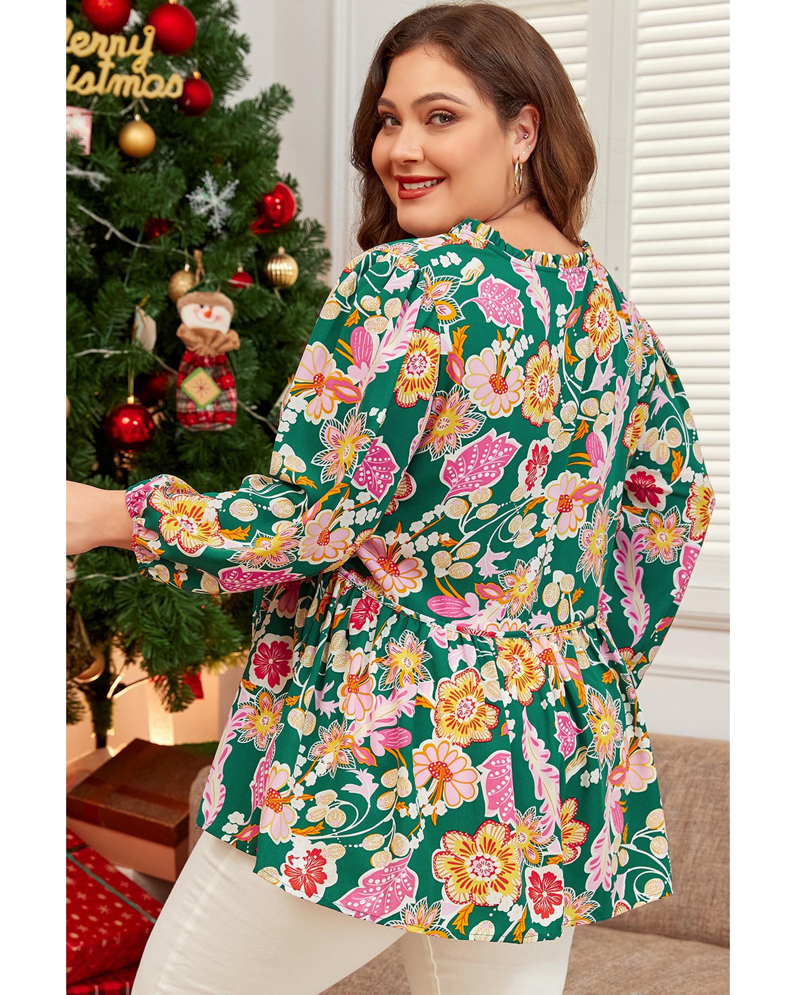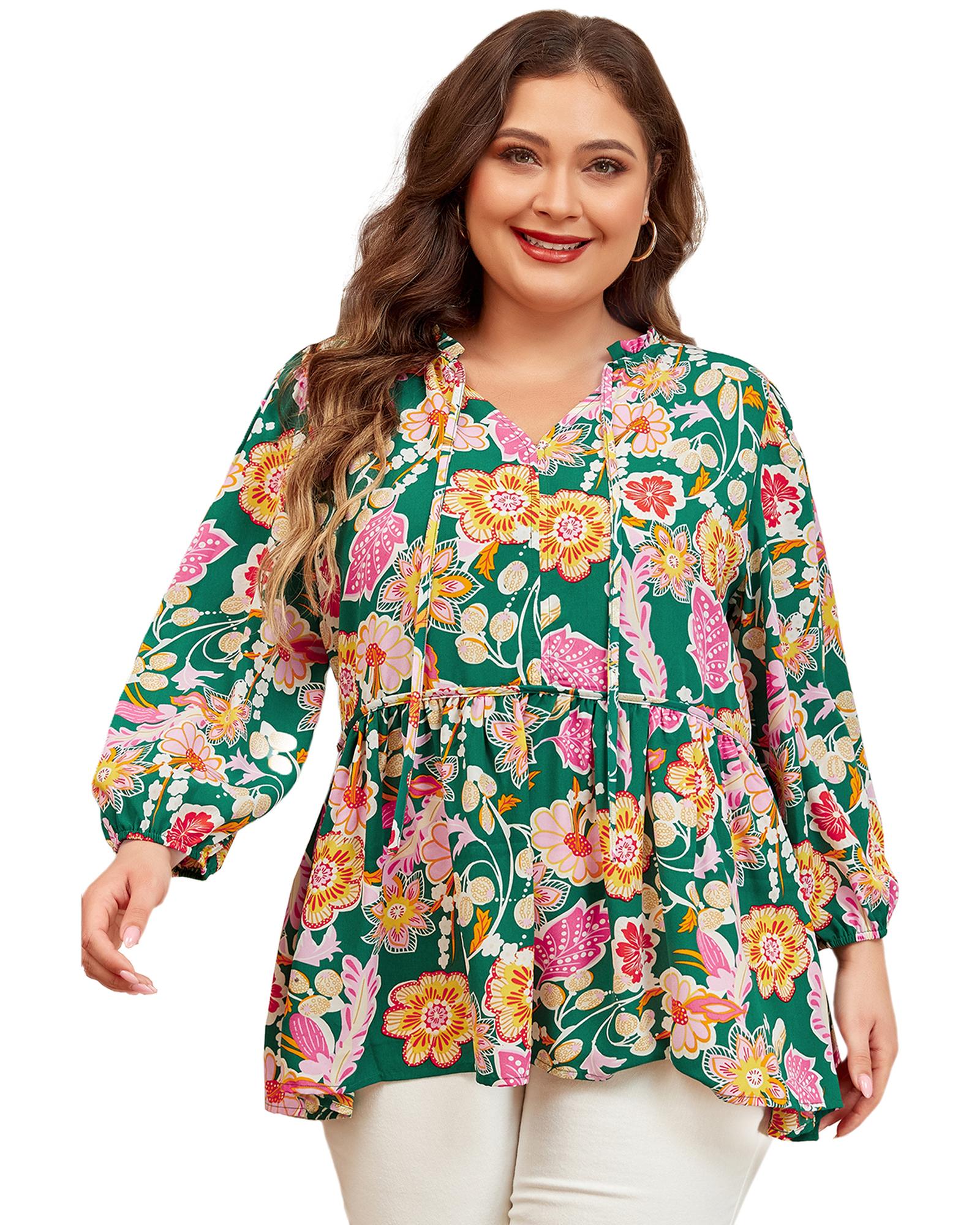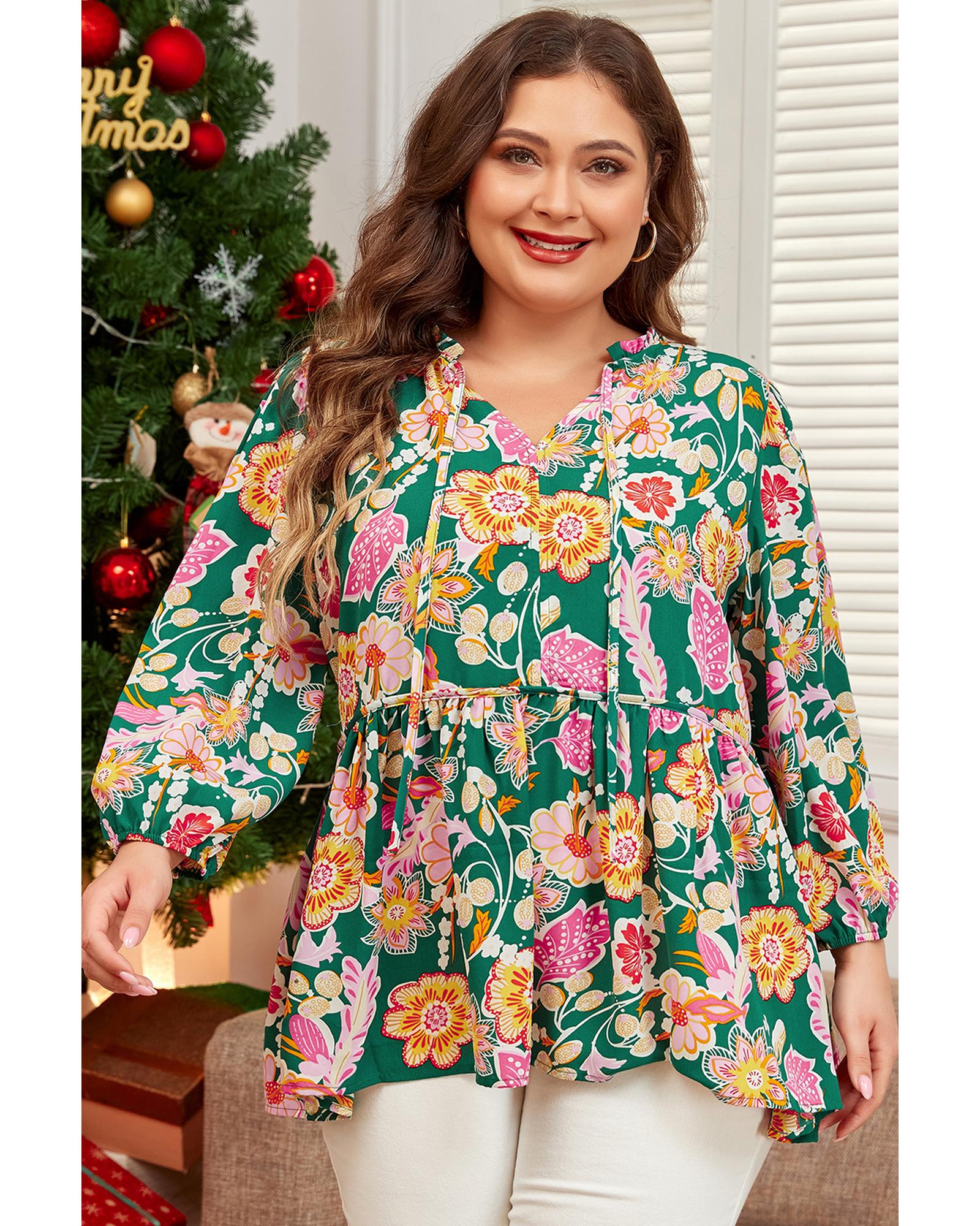 Green Floral Tied V Neck Long Sleeve Plus Size Babydoll Top – 3X