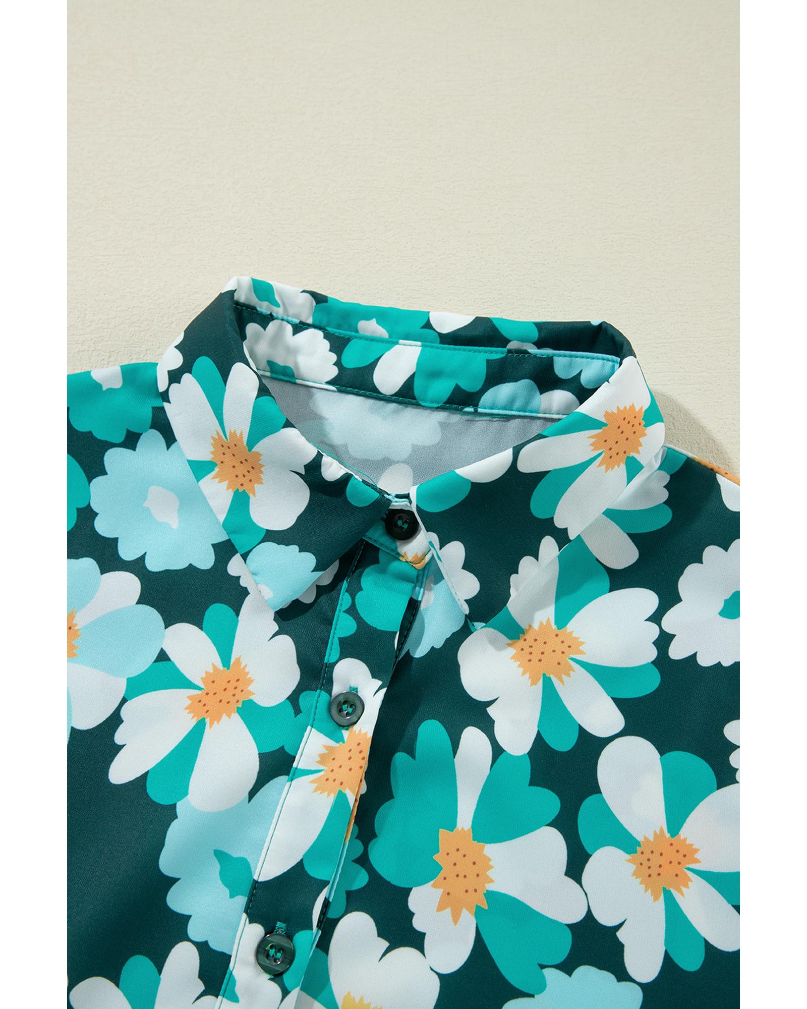 Green Floral Tiered Long Puff Sleeve Shirt Dress – L