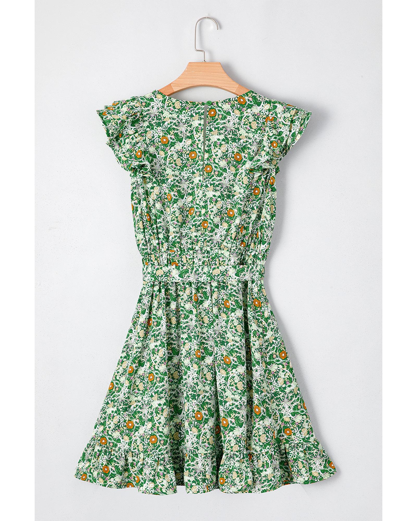Green Flower Print Flutter Sleeve V Neck Sashed Ruffled Mini Dress – XL