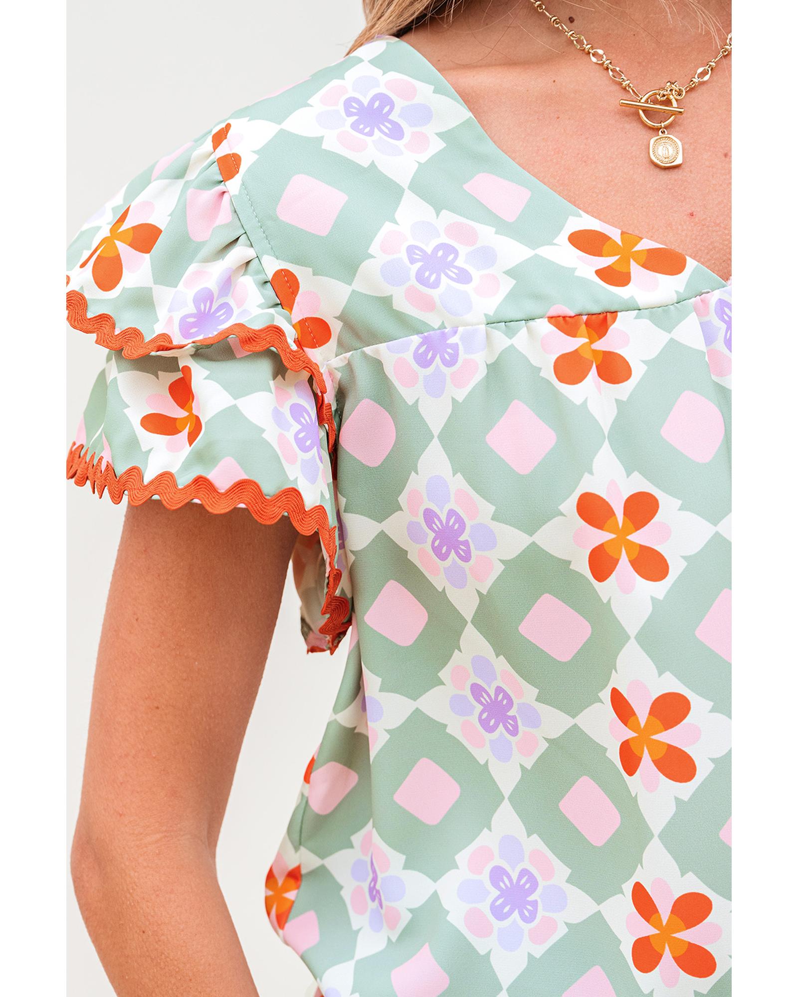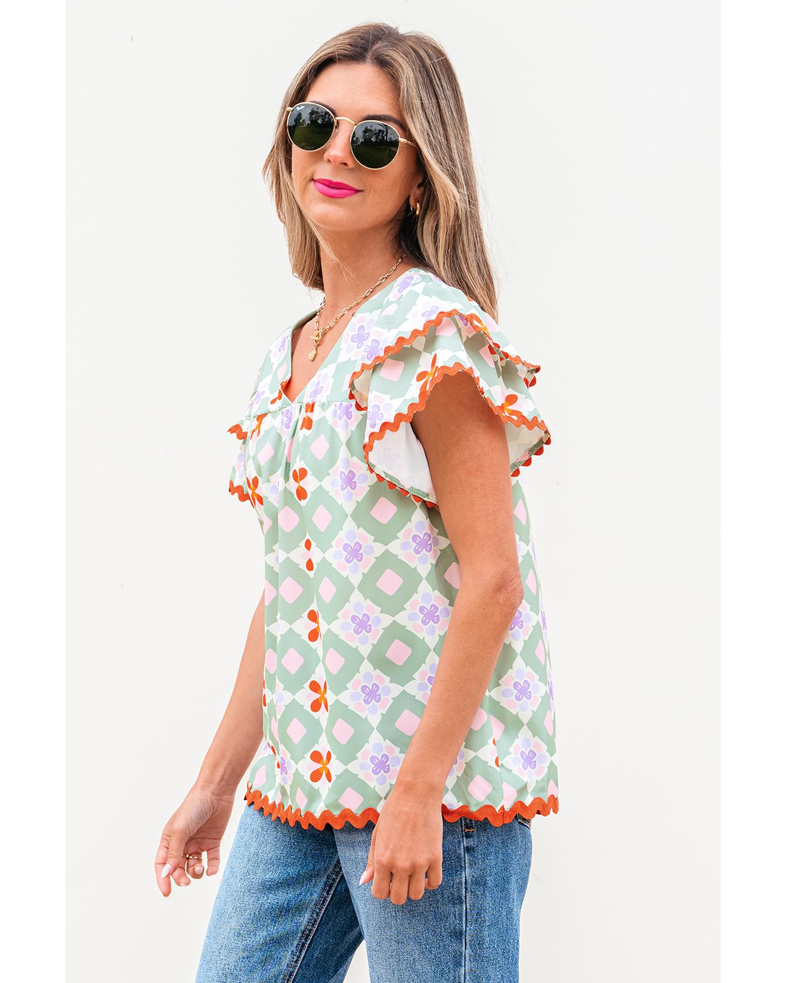 Green Geometric Floral Print Layered Flutter Sleeve V Neck Ric Rac Trim Blouse – XL