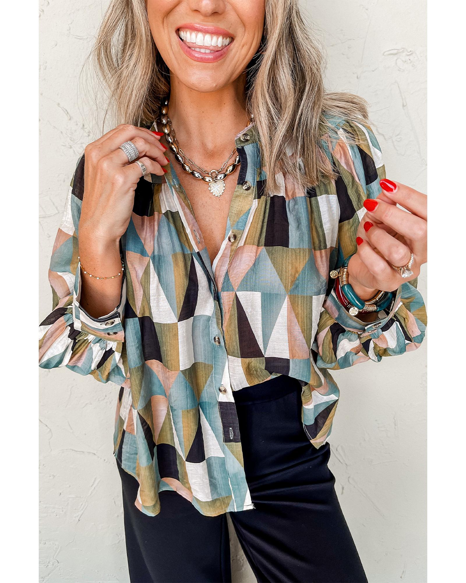 Green Geometric Print Buttoned Balloon Sleeve Loose Fit Shirt – M