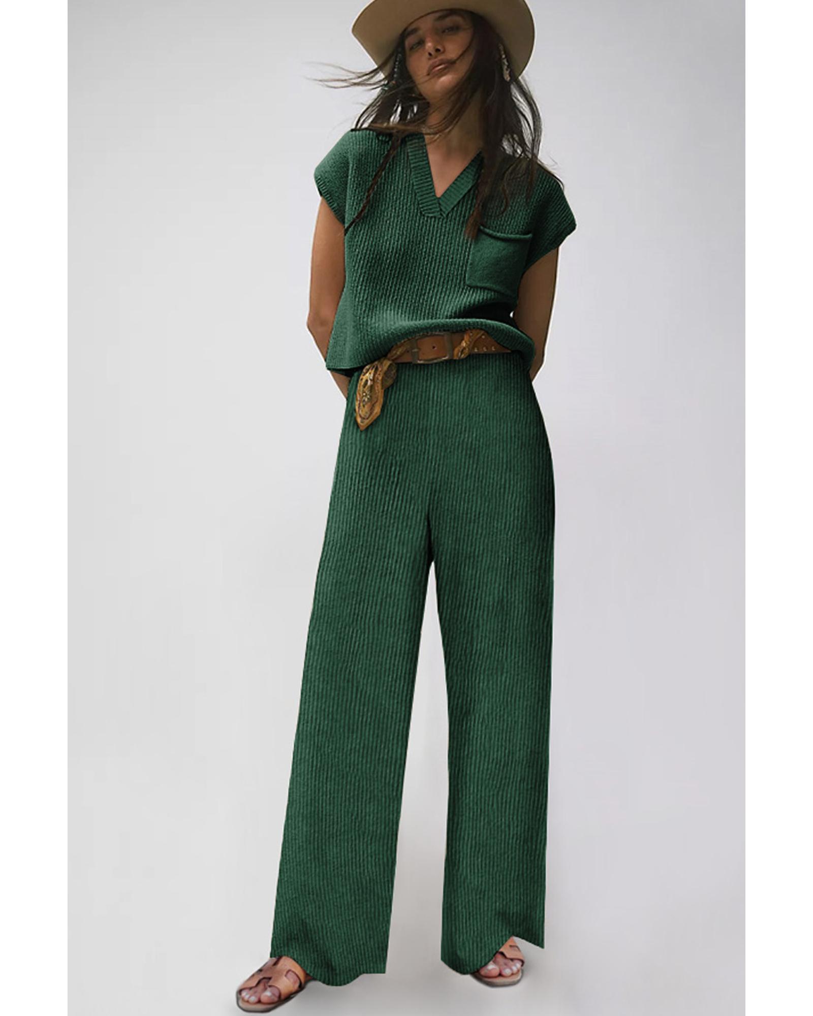 Stay stylish and comfortable with our Green Knitted V Neck Sweater and Casual Pants Set Perfect for fall and winter Cap sleeve sweater is perfect for layering or wearing alone Wide pants provide both comfort and style Made from knitted material for warmth and softness Fashionable two - piece set to update your wardrobe