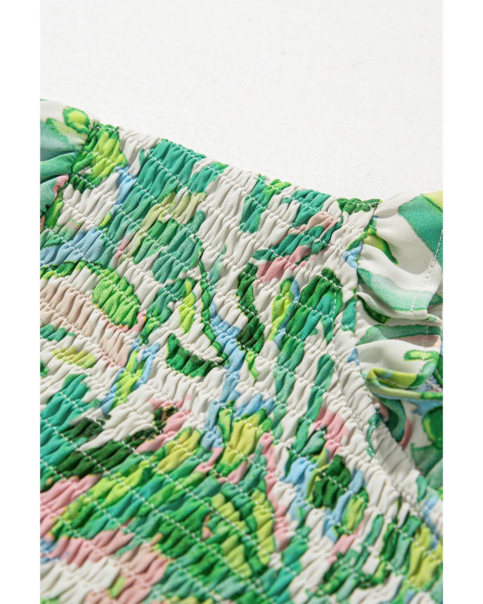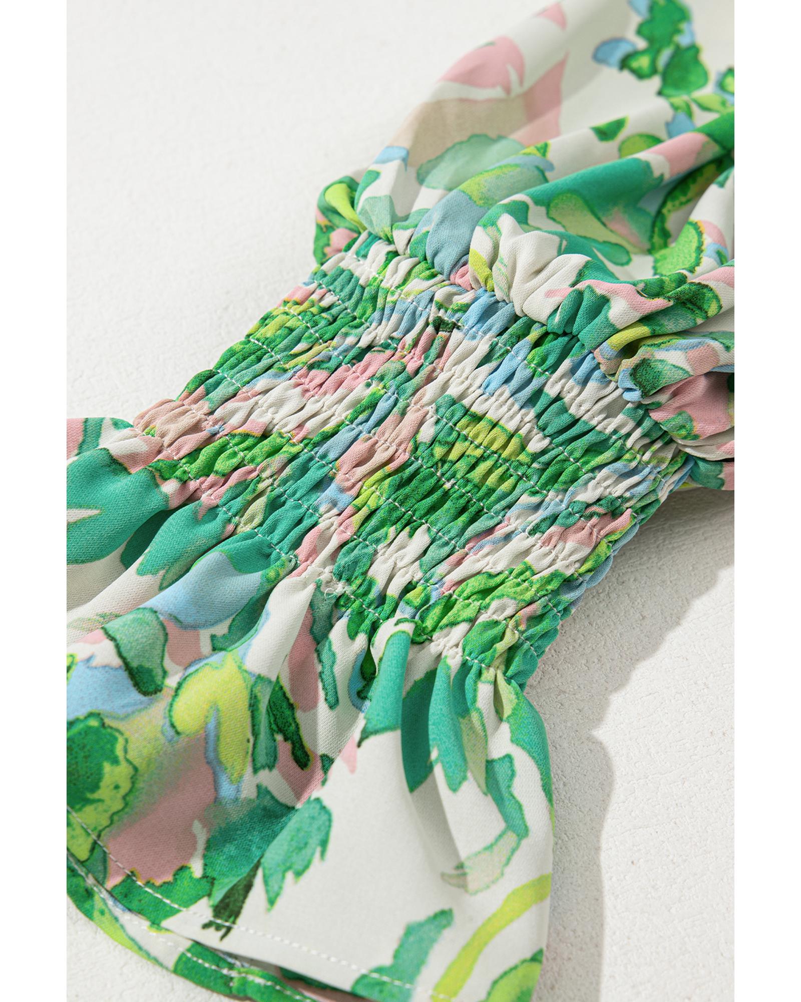 Green Leafy Printed Flounce Sleeve Shirred Mock Neck Blouse – L