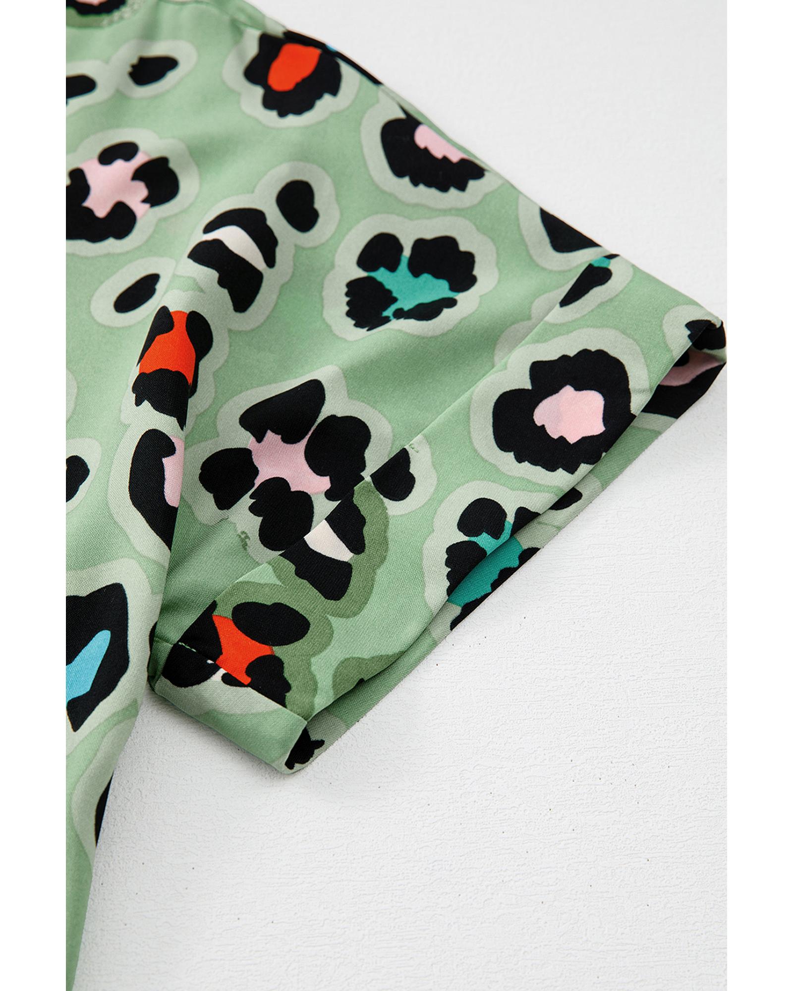 - Green Leopard Print Short Sleeve Shirt and Wide Leg Pants Set