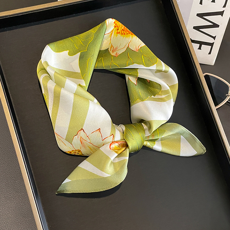 Green Lotus 53cm Silk Scarf – 100% Mulberry Silk, Floral Print, Women’s Square Scarf Shawl (Style 1)
