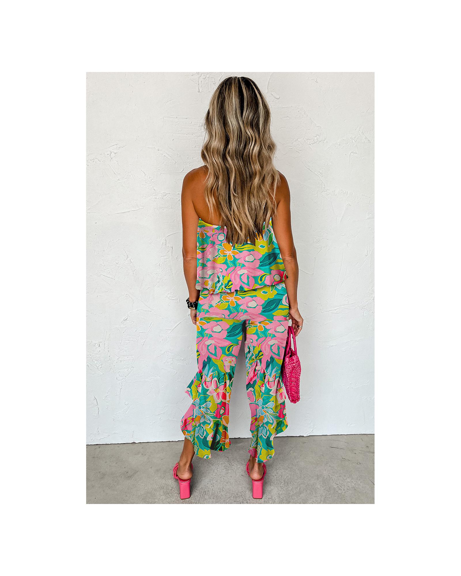 Green Mix Tropical Print Strapless Ruffled Jumpsuit – XL