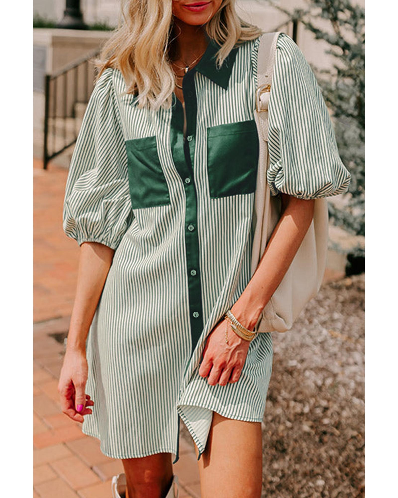 - Green Patch Pockets Button Down Short Puff Sleeve Dress