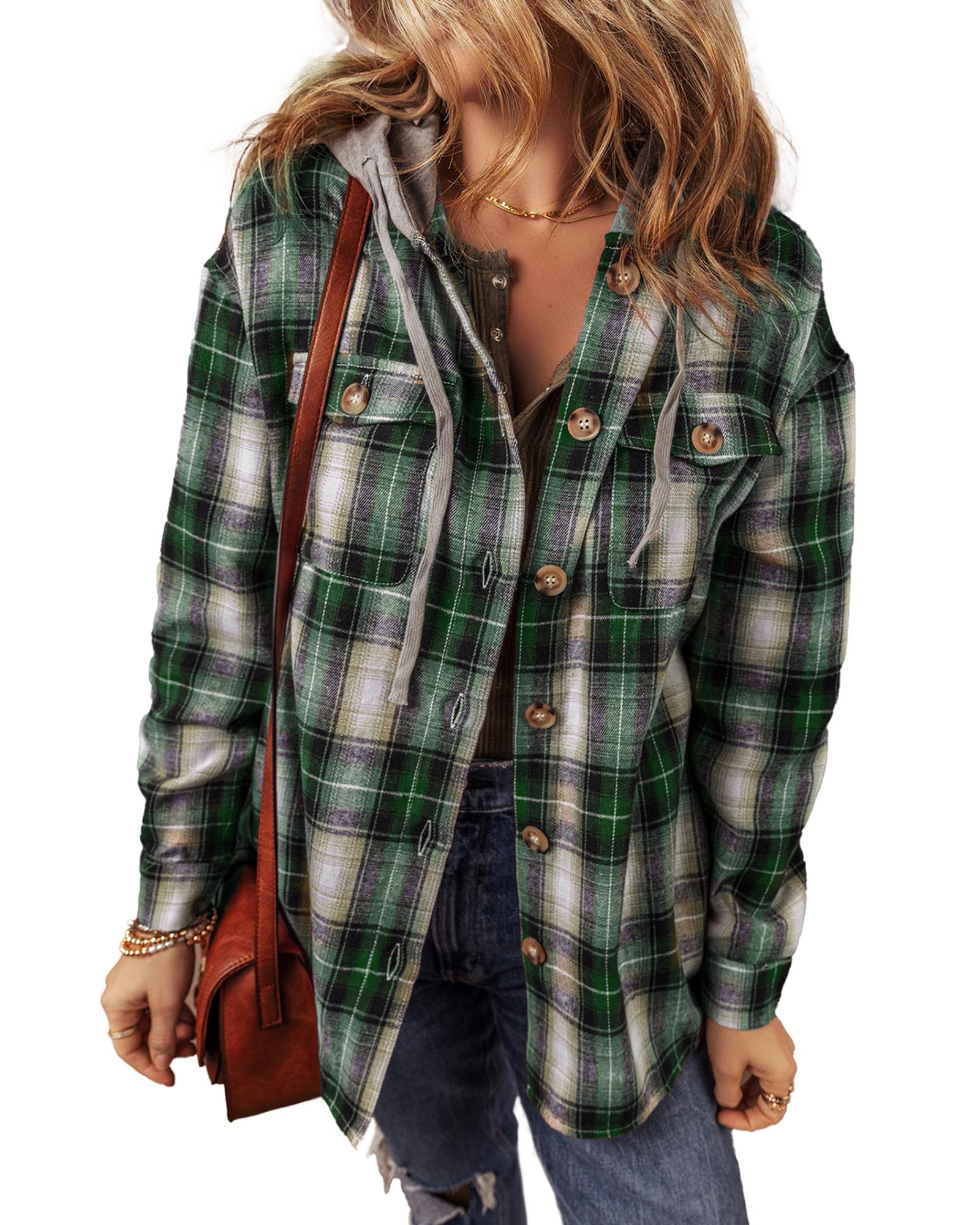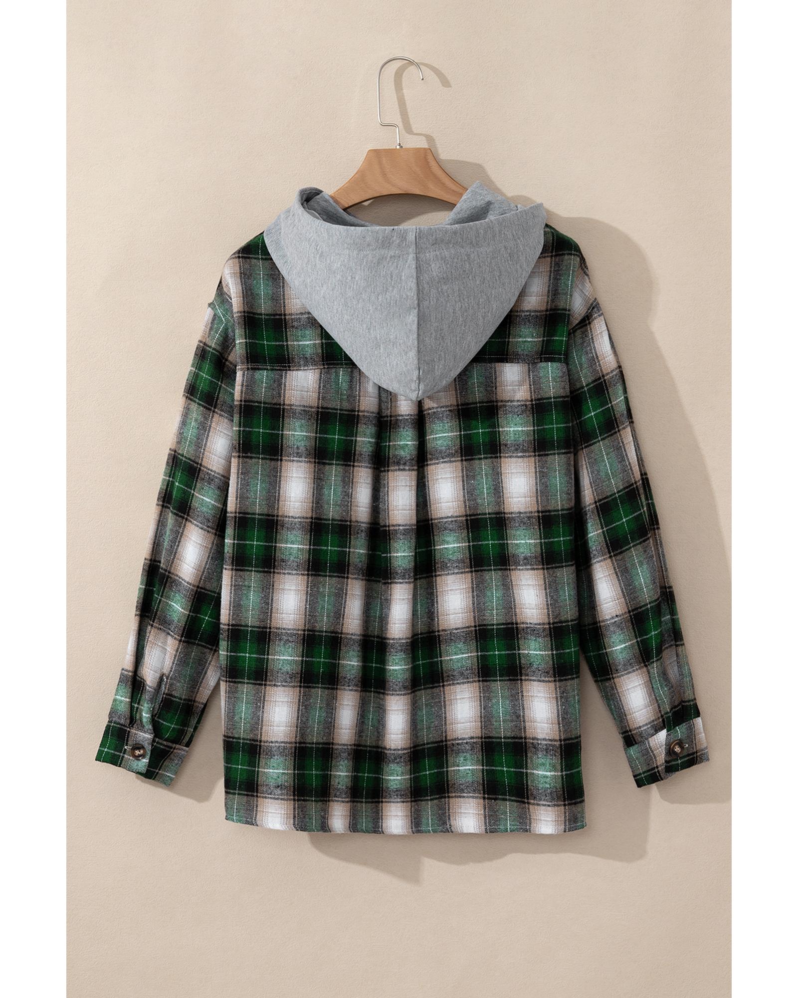 Green Plaid Print Chest Pocket Buttoned Hooded Shacket – 2XL