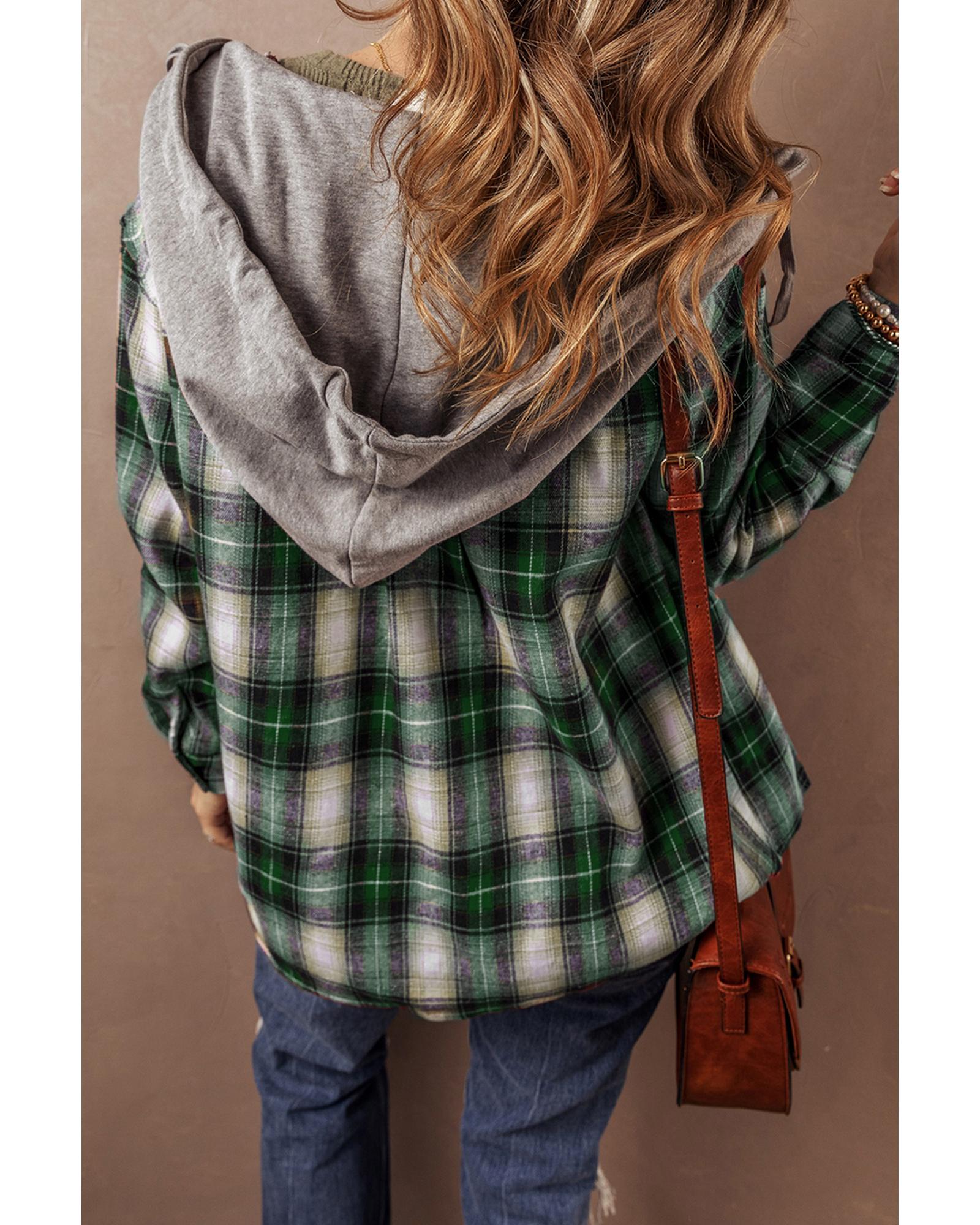 Green Plaid Print Chest Pocket Buttoned Hooded Shacket – M