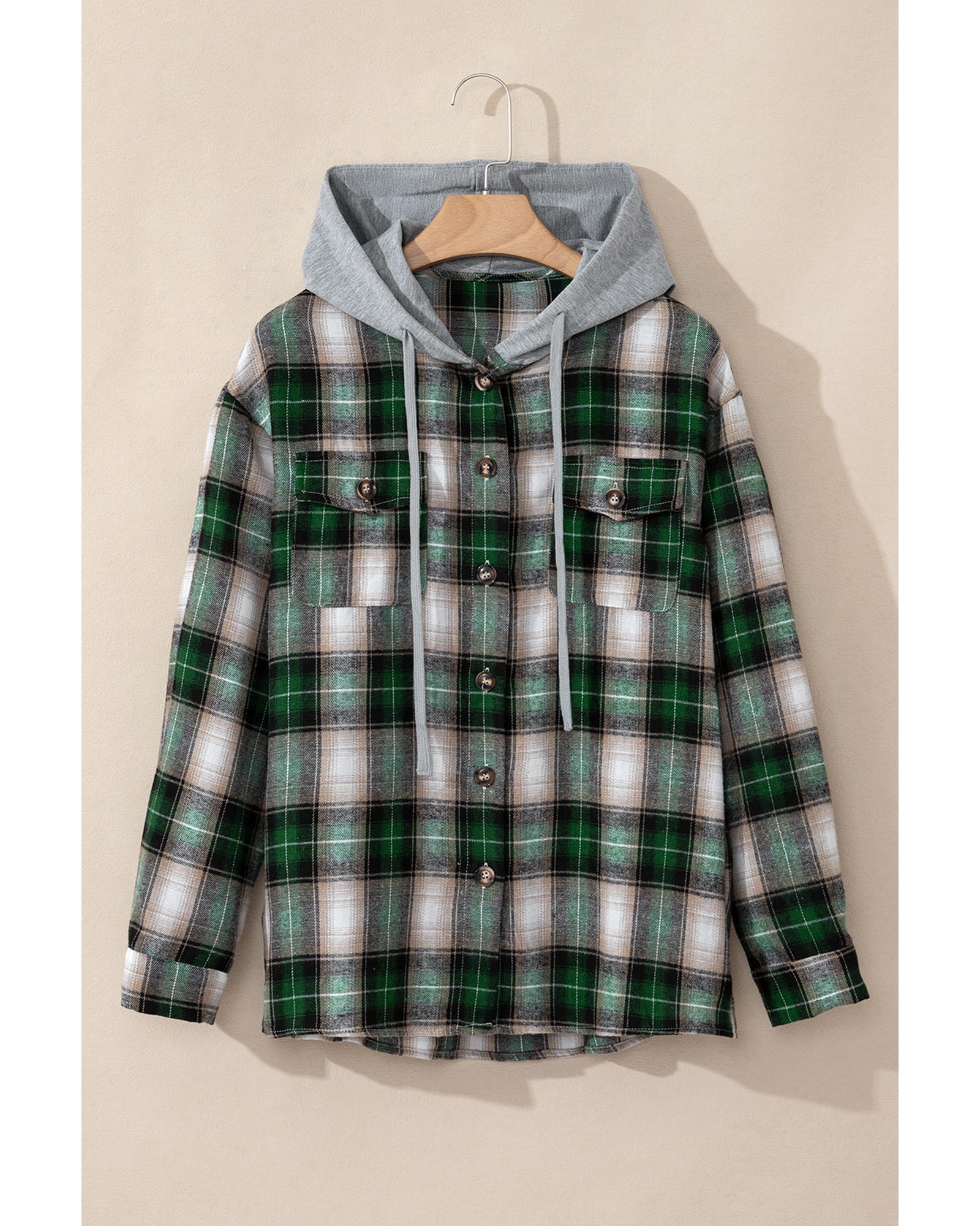 Green Plaid Print Chest Pocket Buttoned Hooded Shacket – S