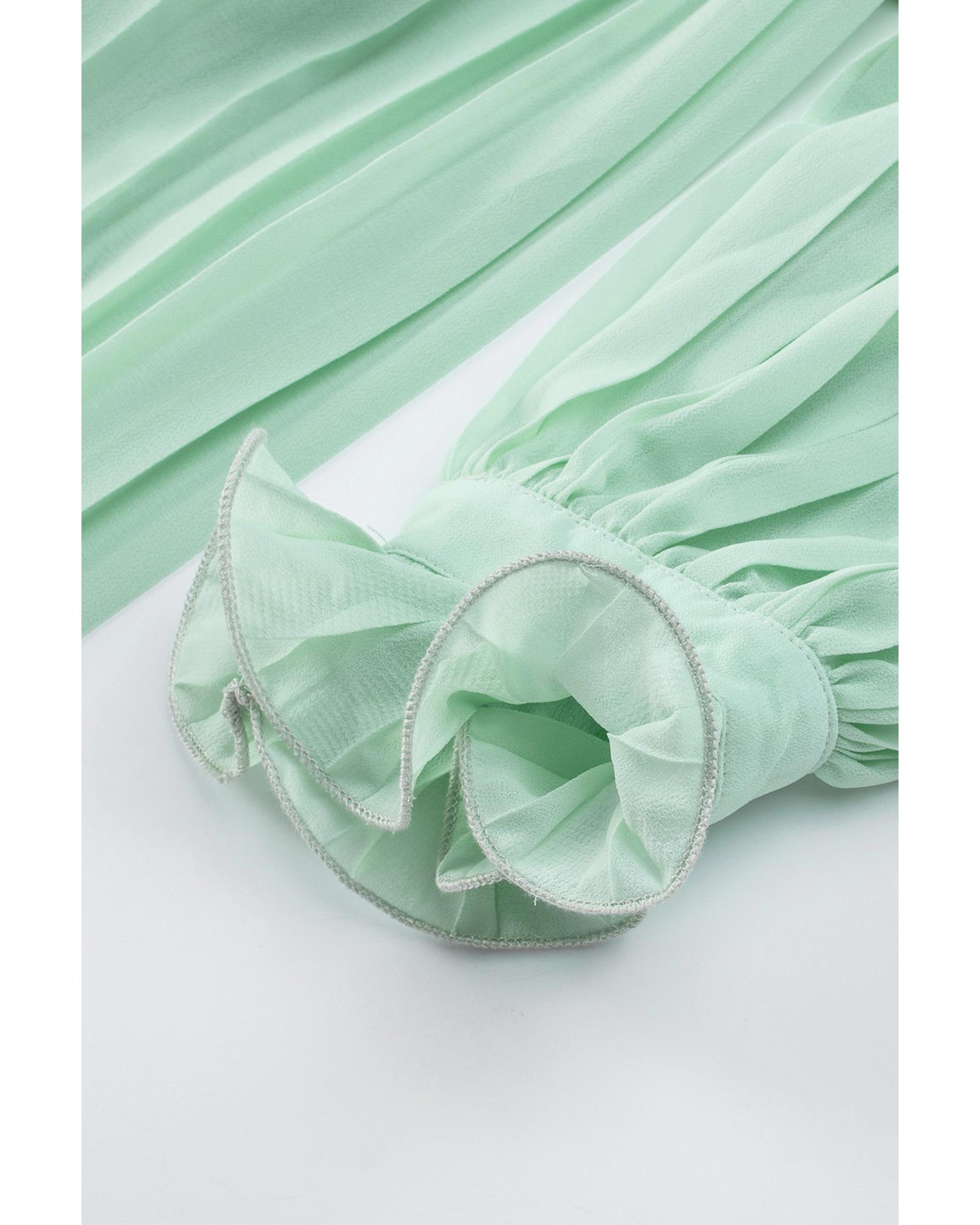 Green Pleated Ruffled Tie Waist Buttons V Neck Romper – S