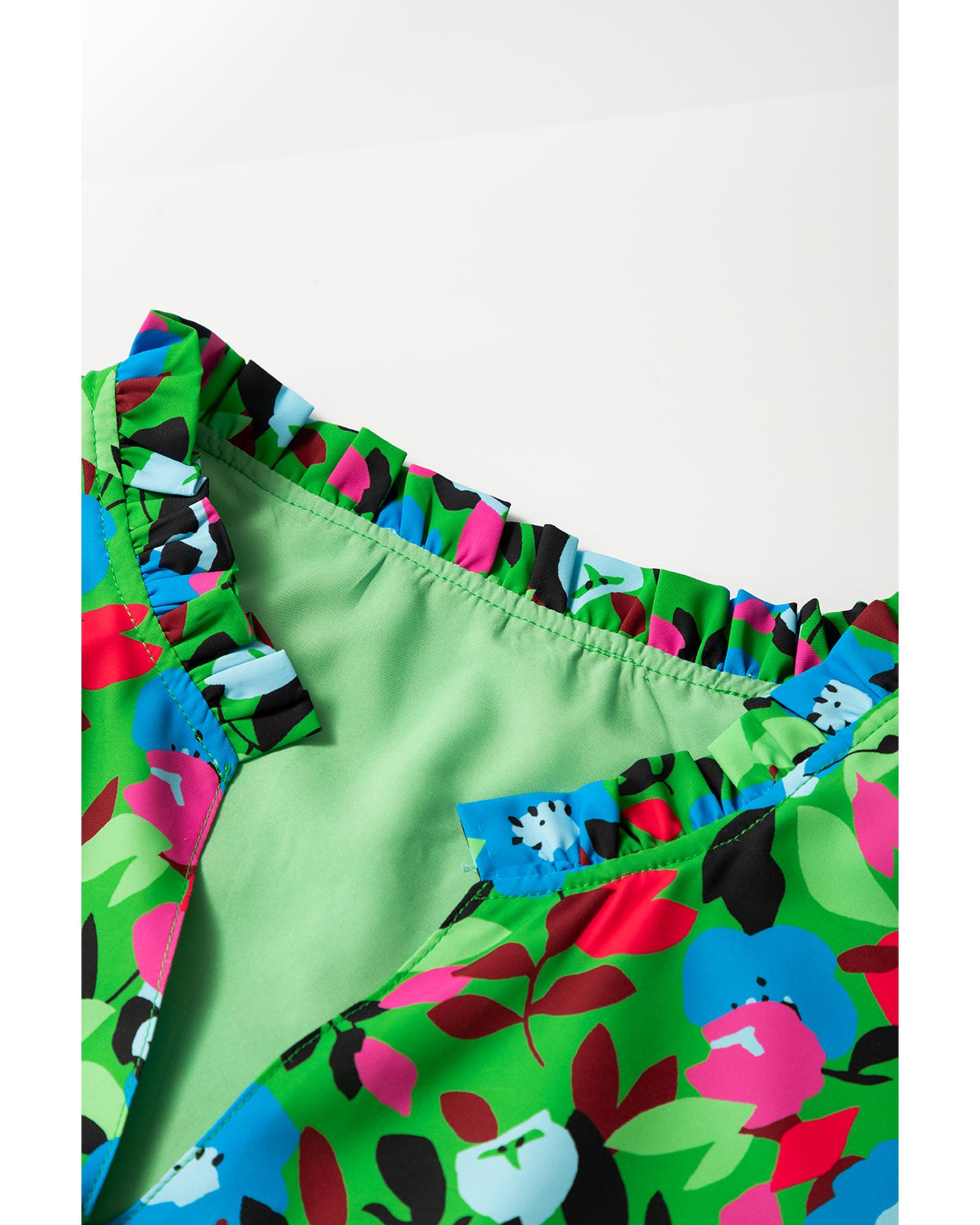 Green Plus Size Floral Bubble Sleeve V Neck Blouse – 1X