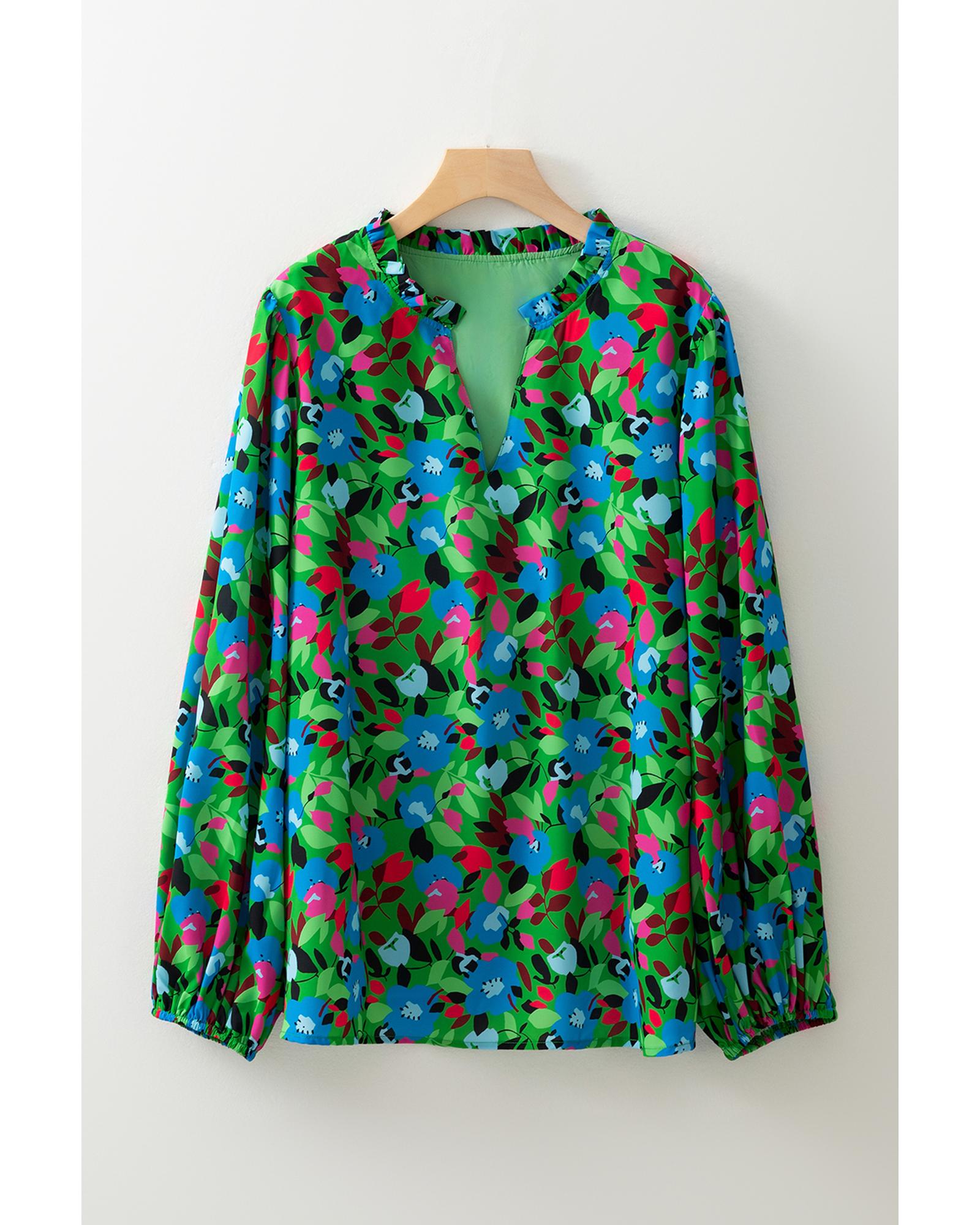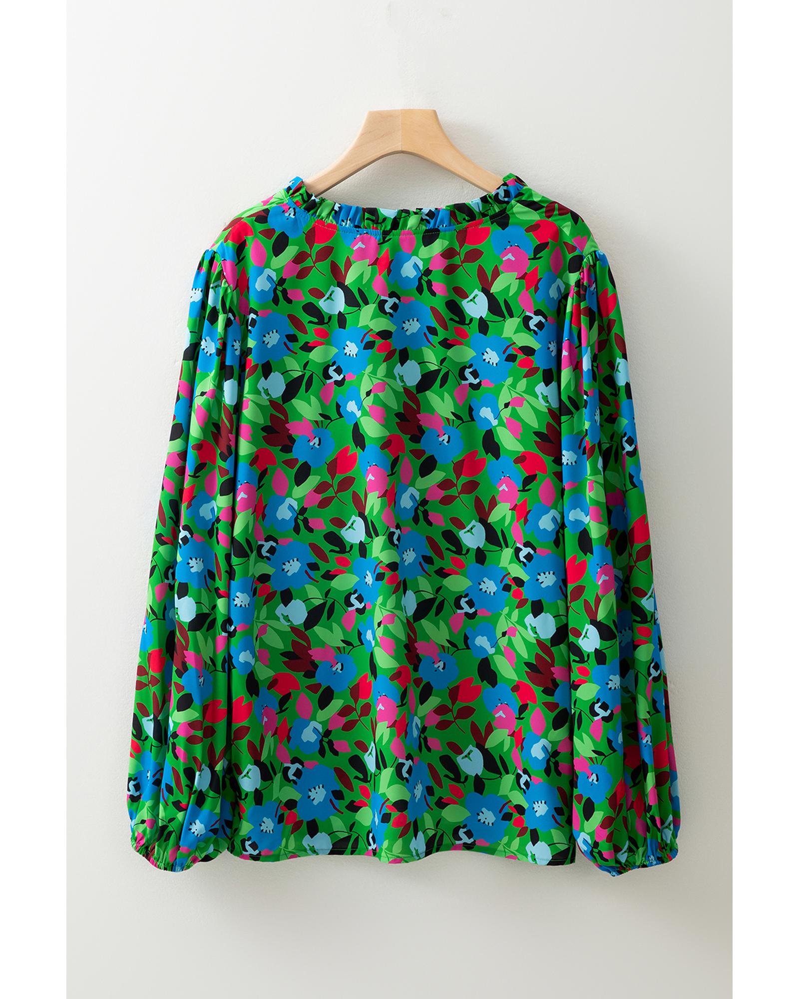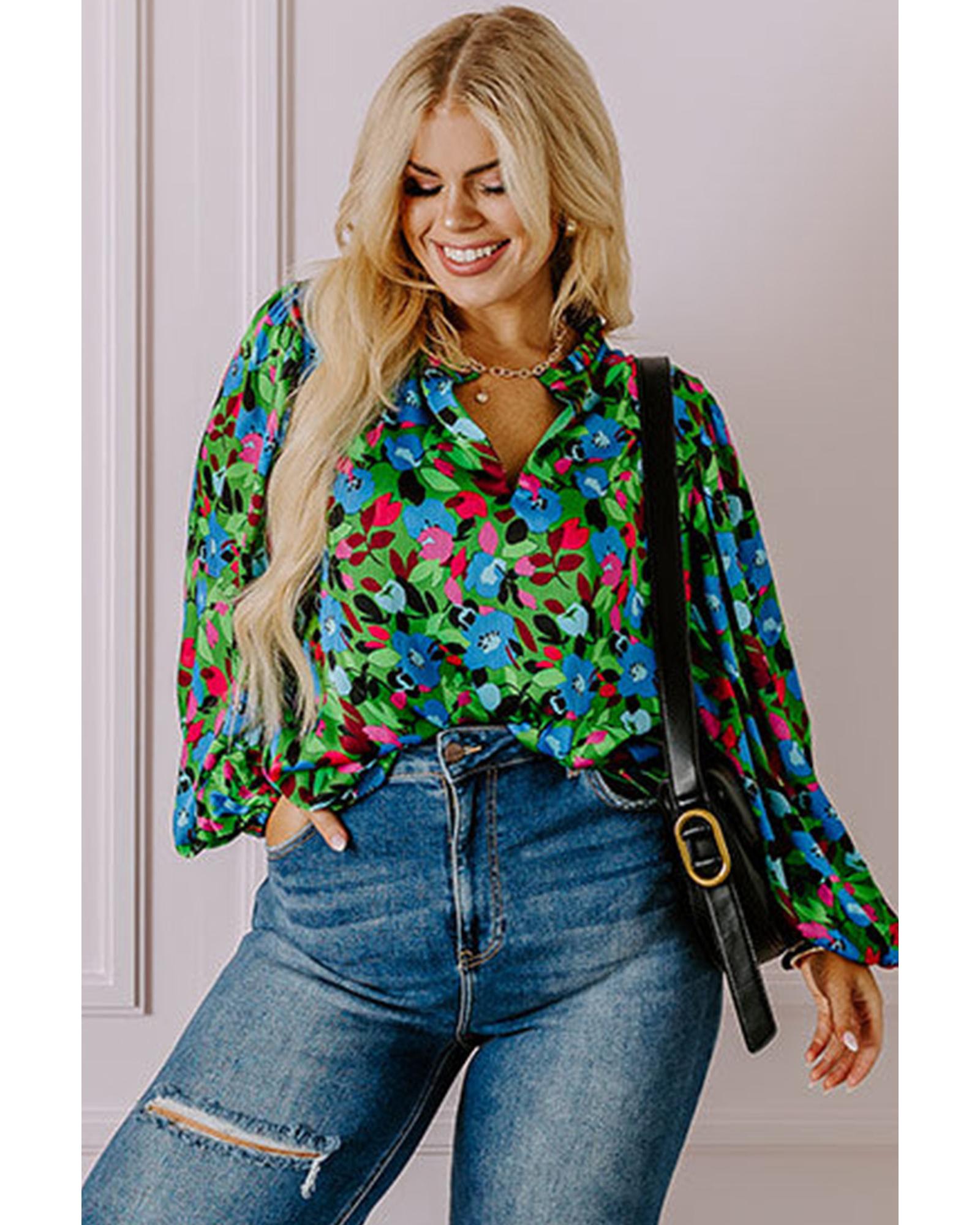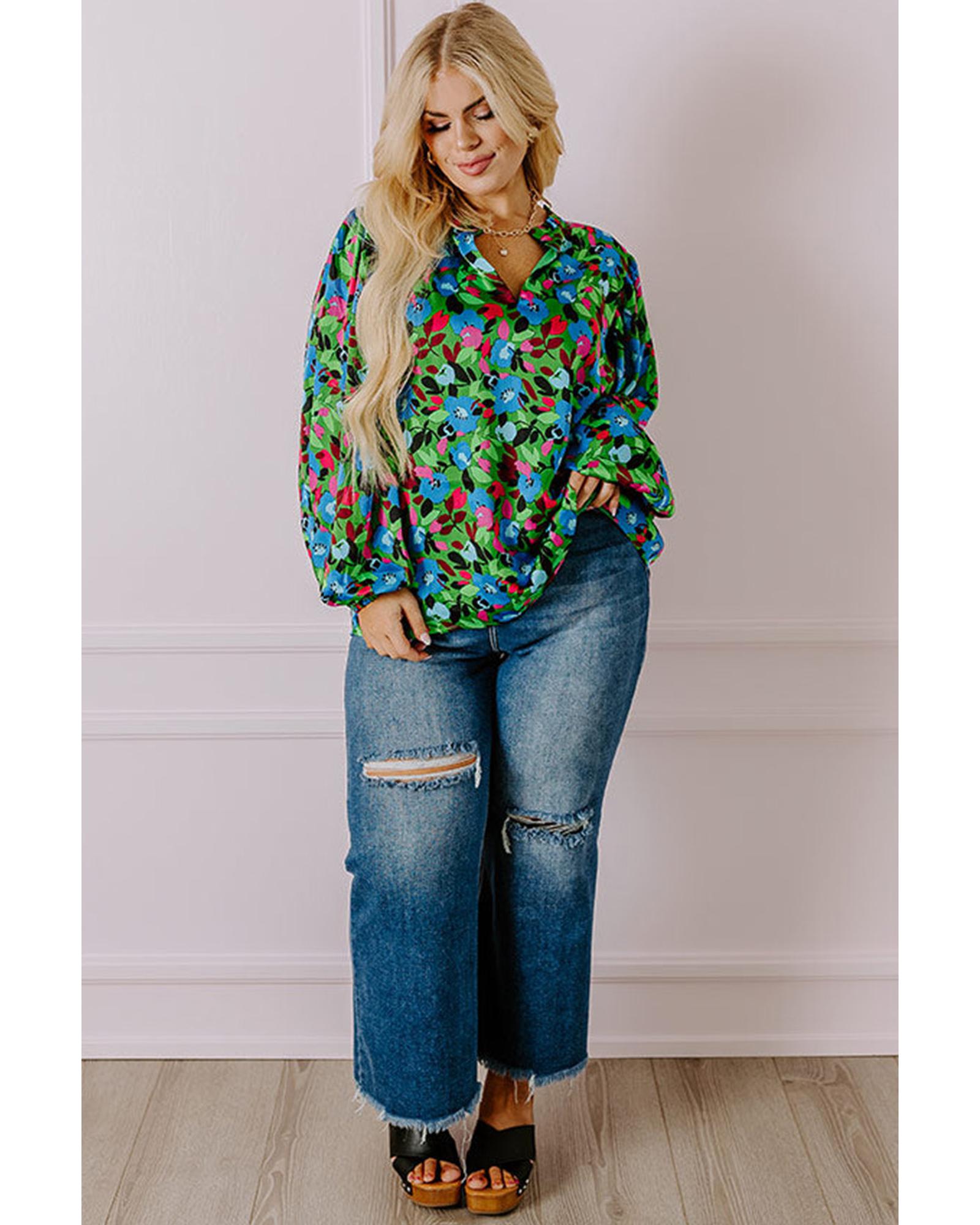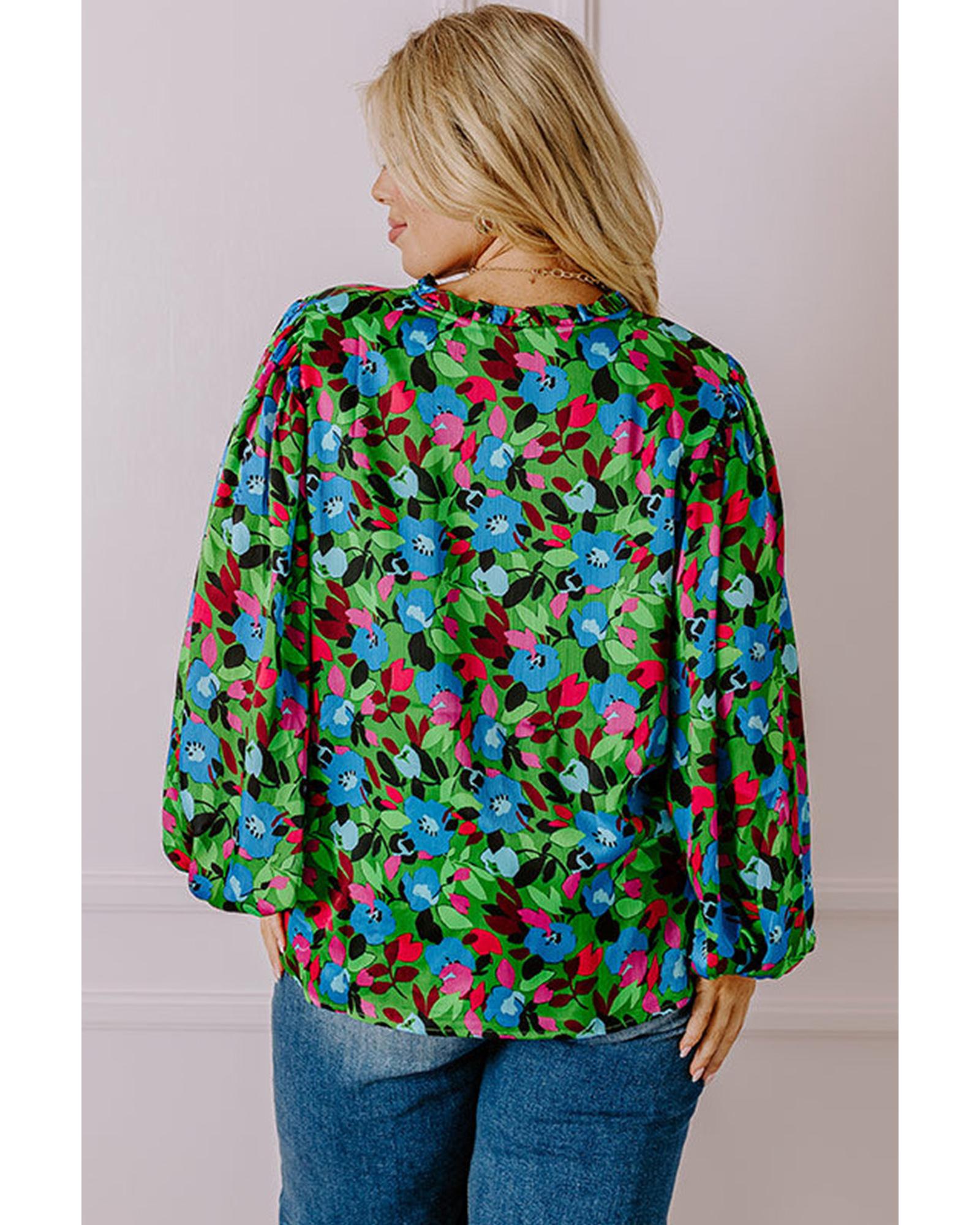 Green Plus Size Floral Bubble Sleeve V Neck Blouse – 2X