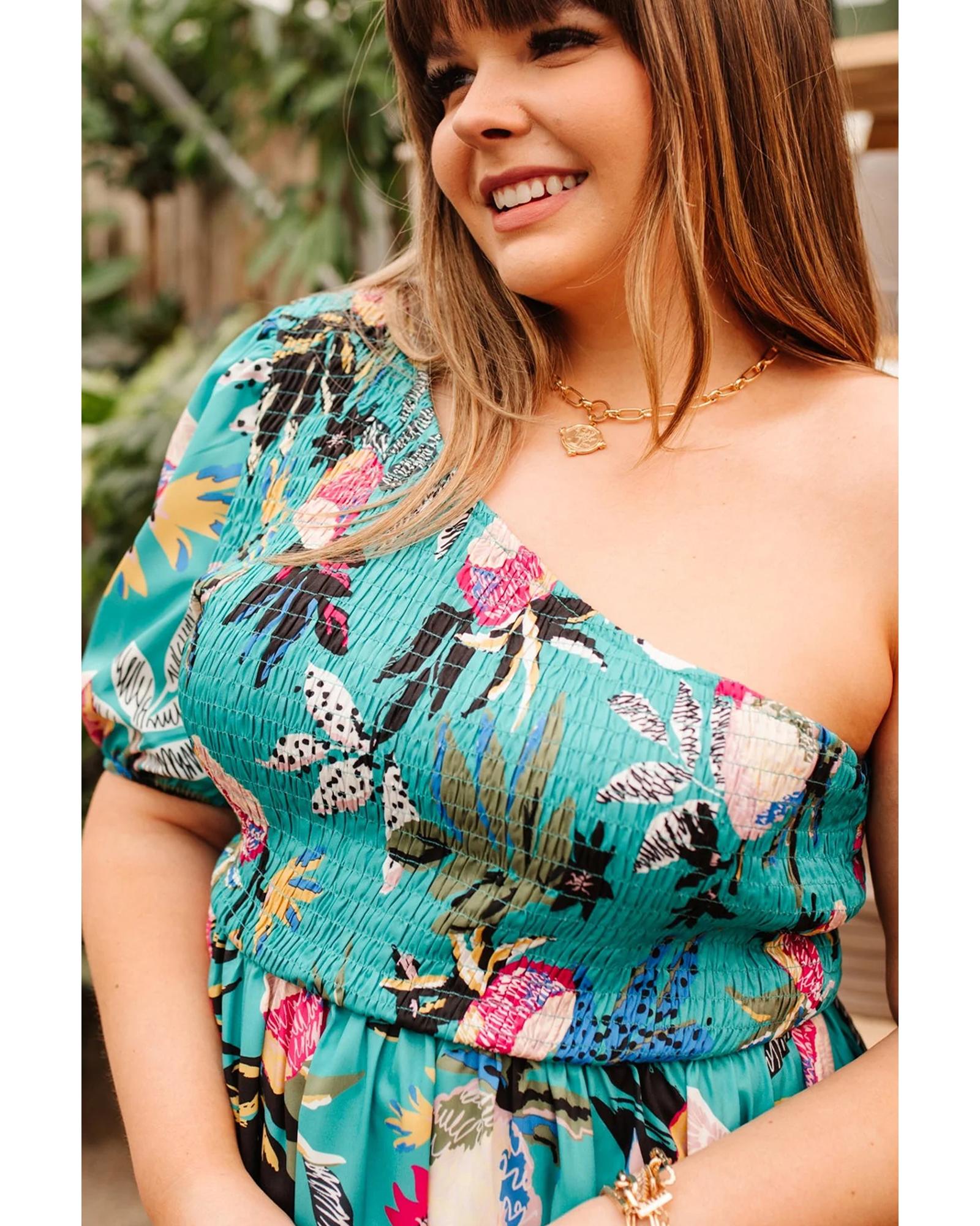 Green Plus Size Floral Smocked Bodice Single Puff Short Sleeve Babydoll Blouse – 2X