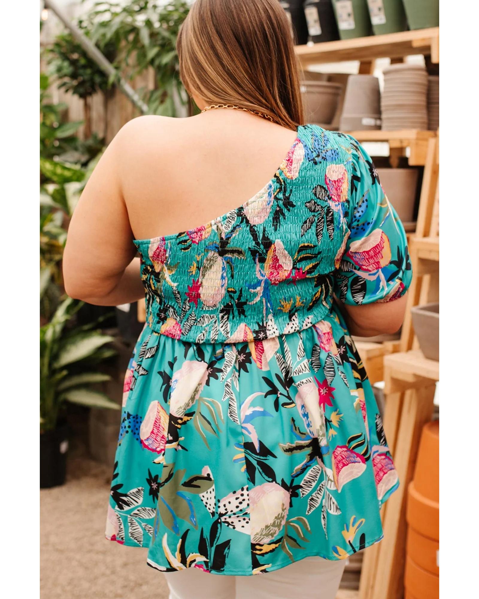 Green Plus Size Floral Smocked Bodice Single Puff Short Sleeve Babydoll Blouse – 3X