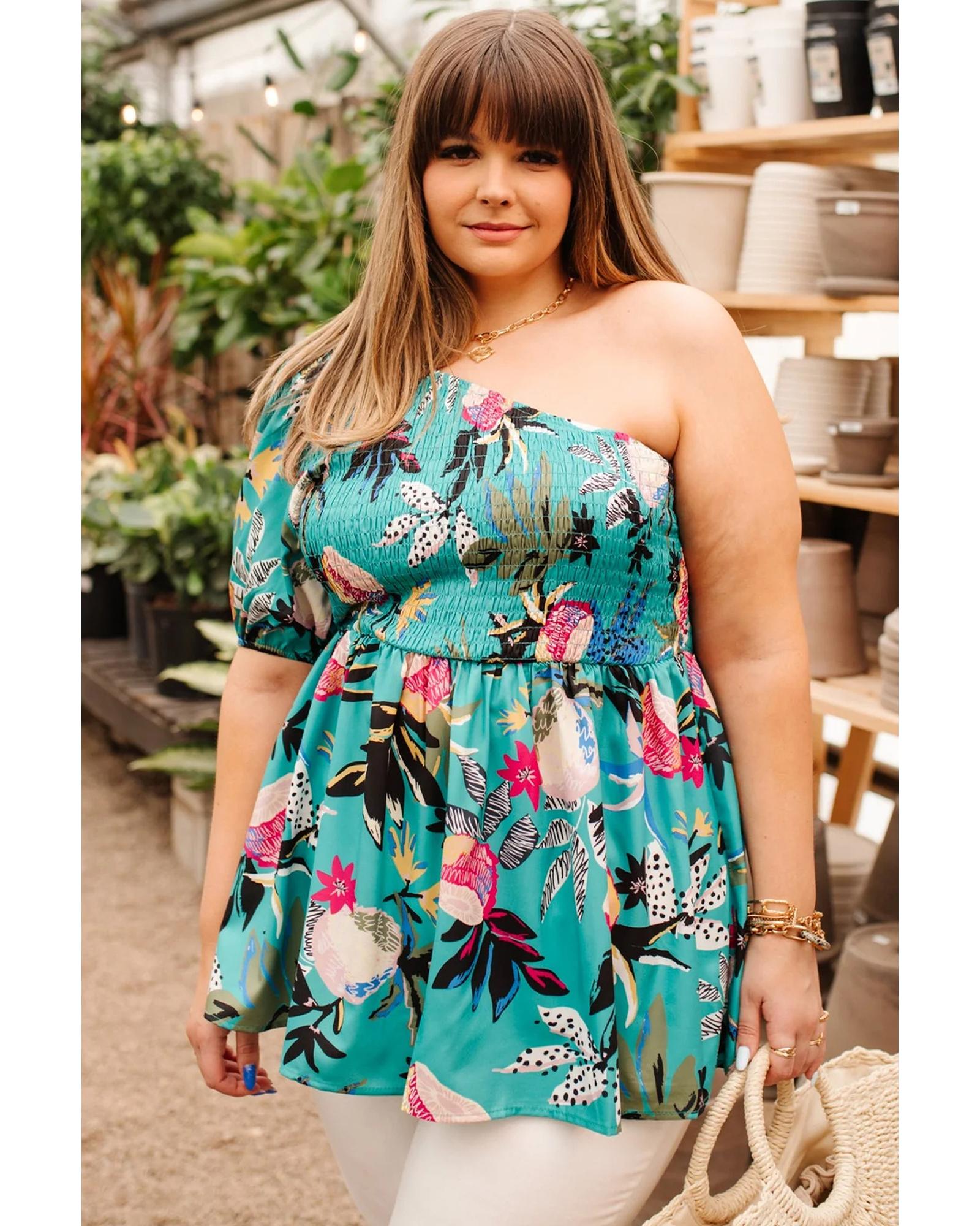 Green Plus Size Floral Smocked Bodice Single Puff Short Sleeve Babydoll Blouse – 4X