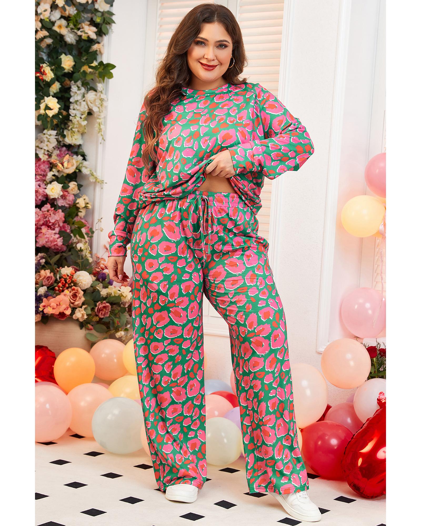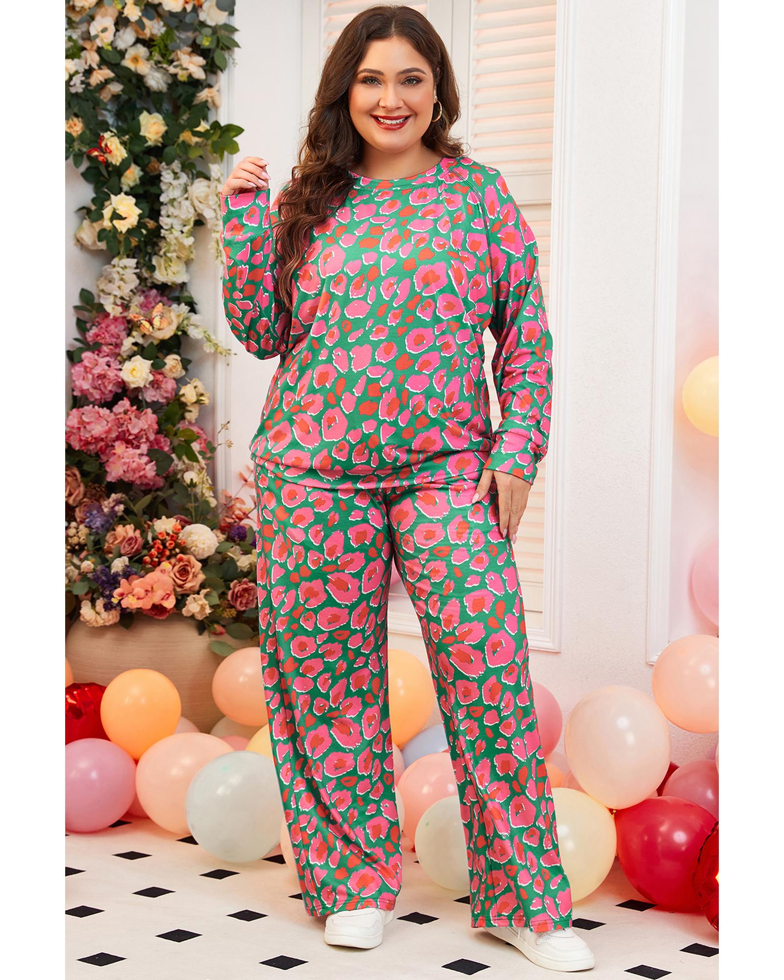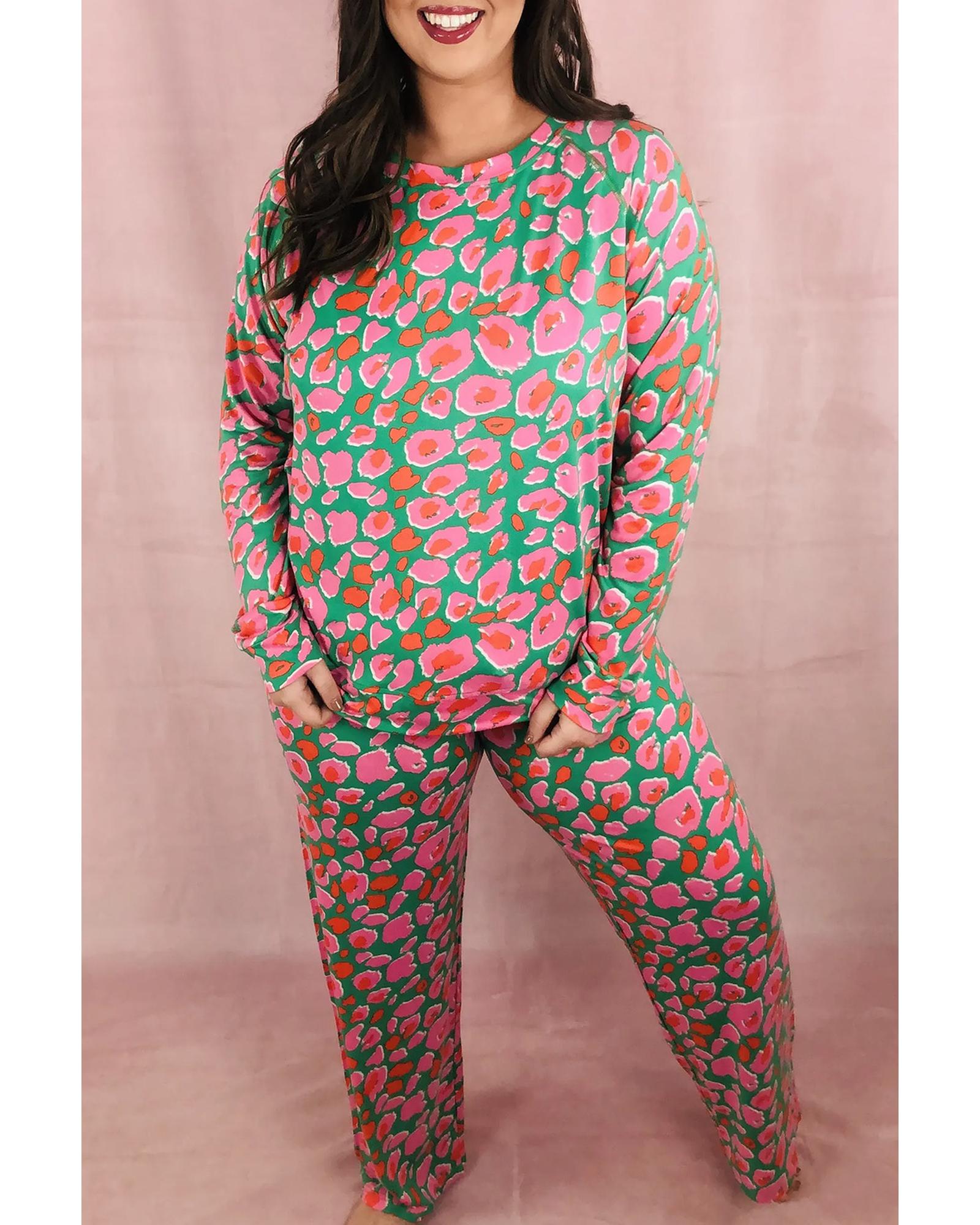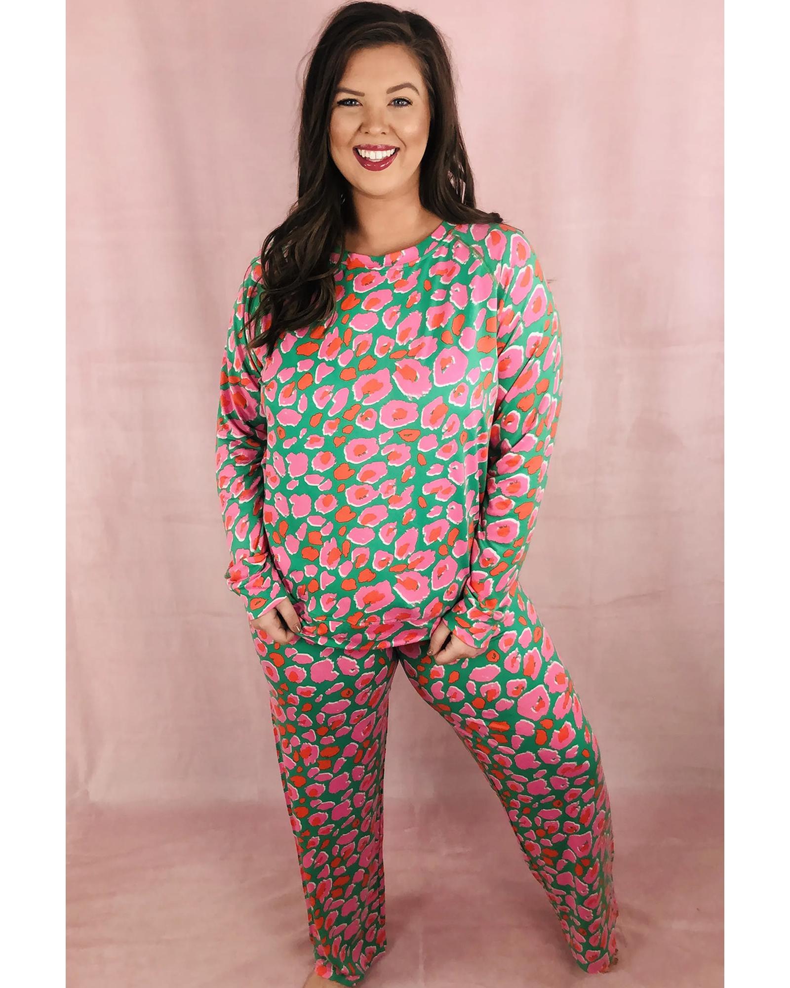 Green Plus Size Printed Long Sleeve and Pants Lounge Set – 4X