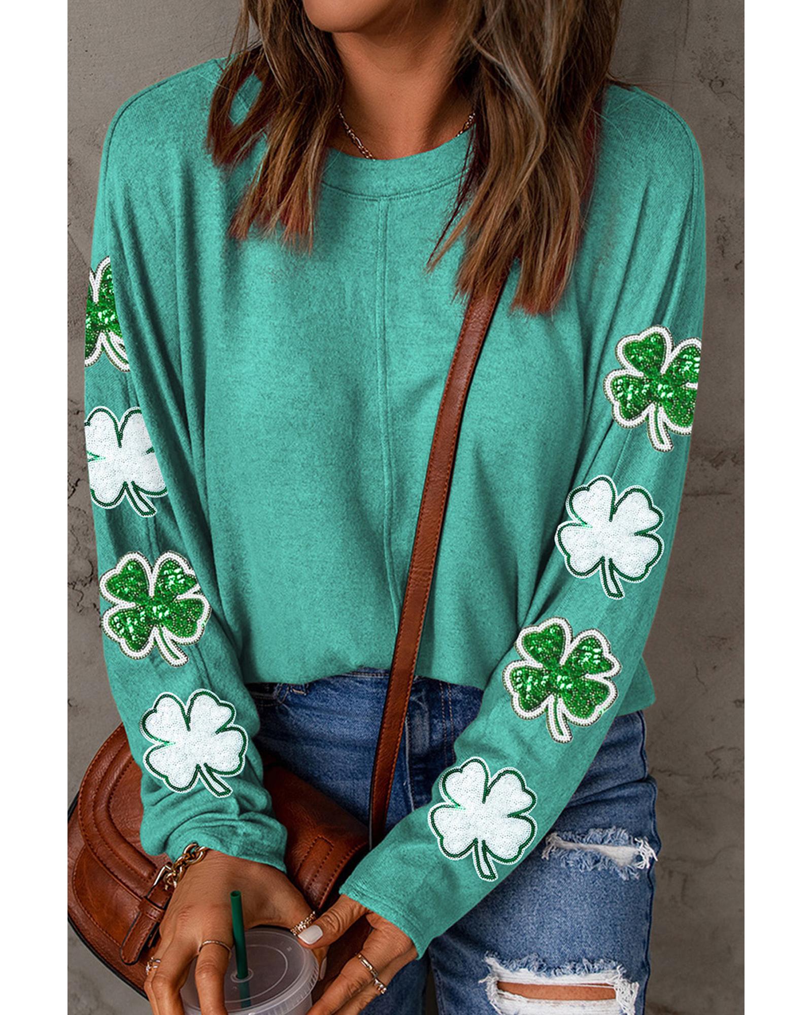 Green Sequined St Patrick Clover Patched Long Sleeve Top – XL