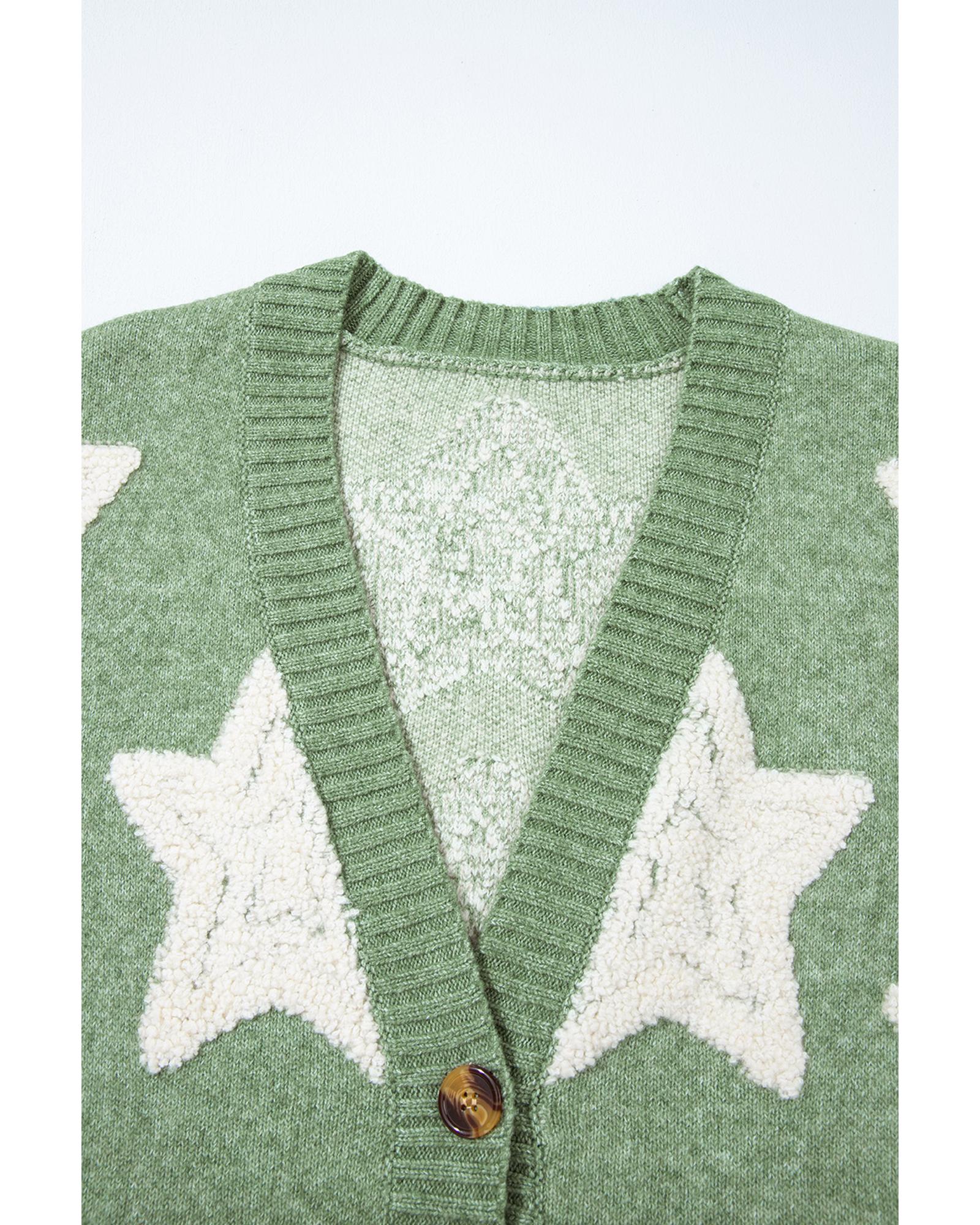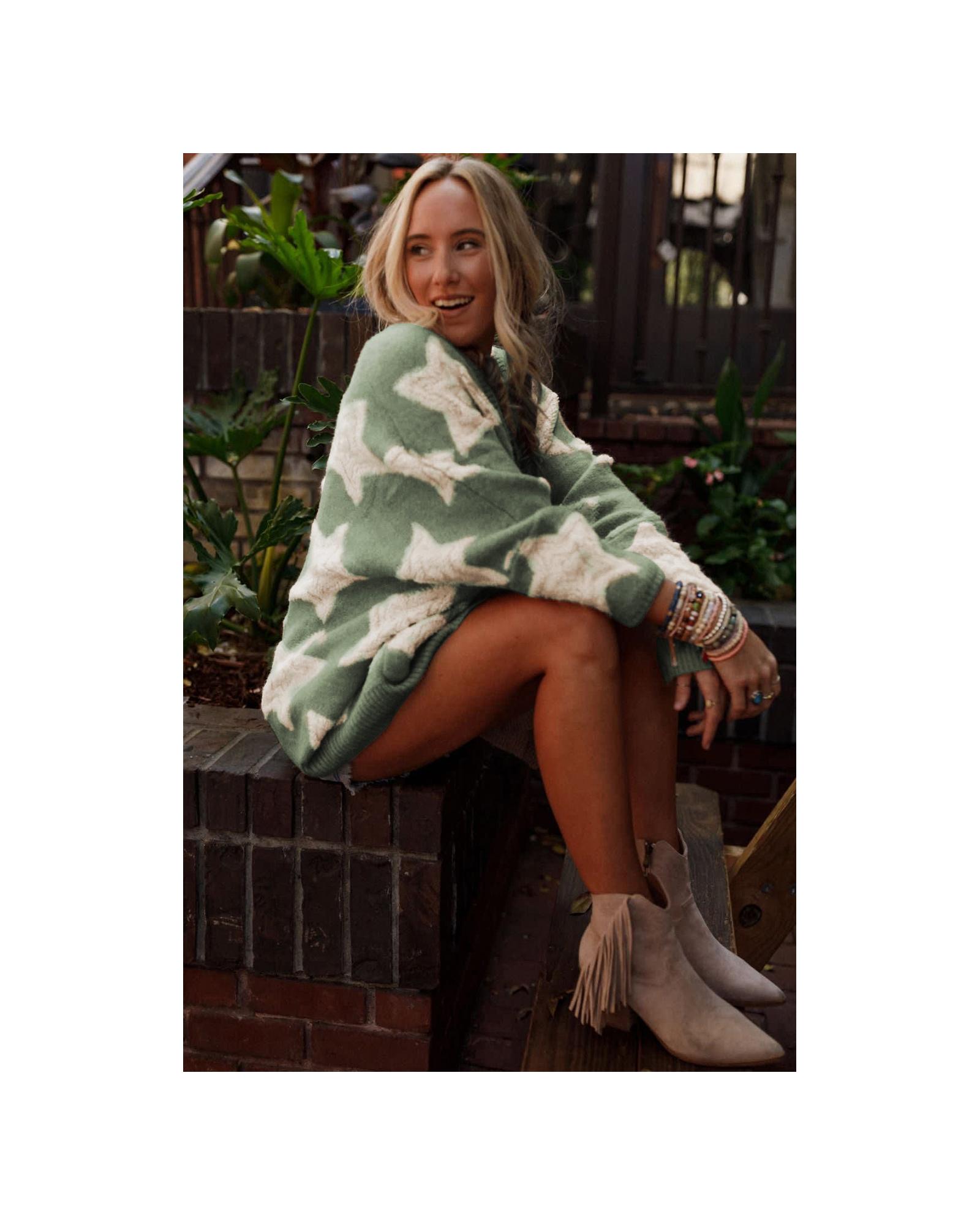 - Green Sherpa Star Pattern Textured Sweater Cardigan with Pockets
