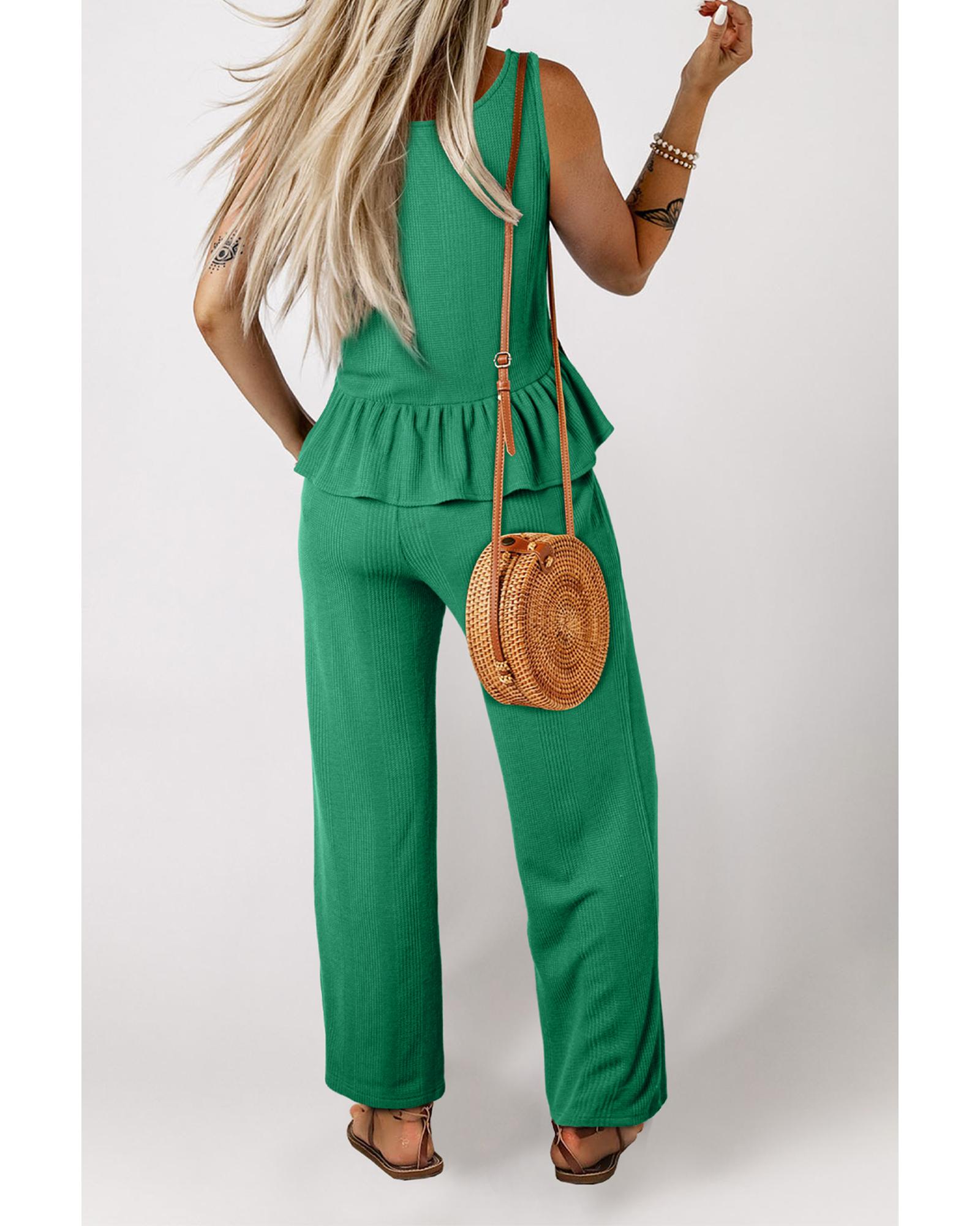 Green Solid Color Ribbed Ruffle Tank Top and Pants Set – M