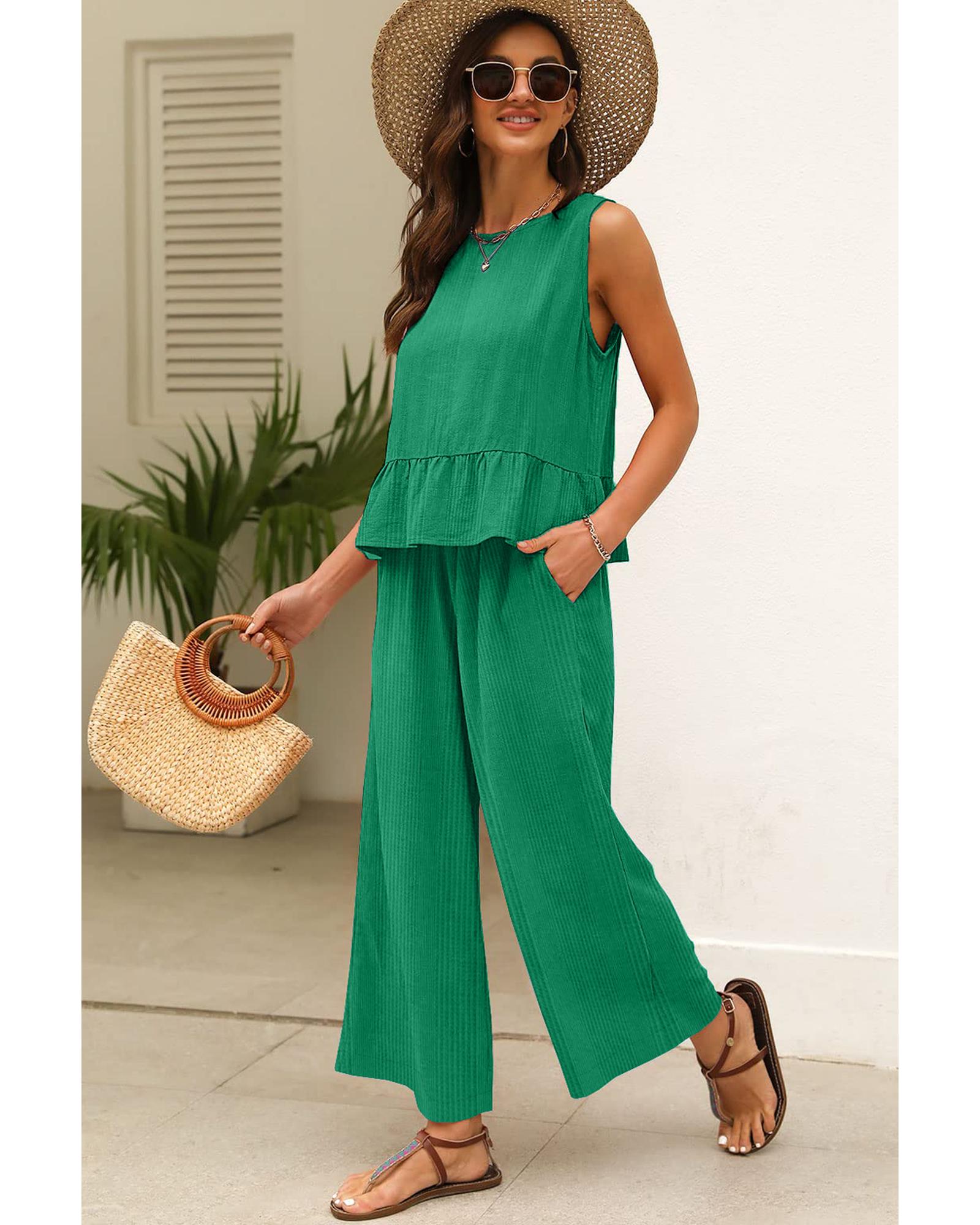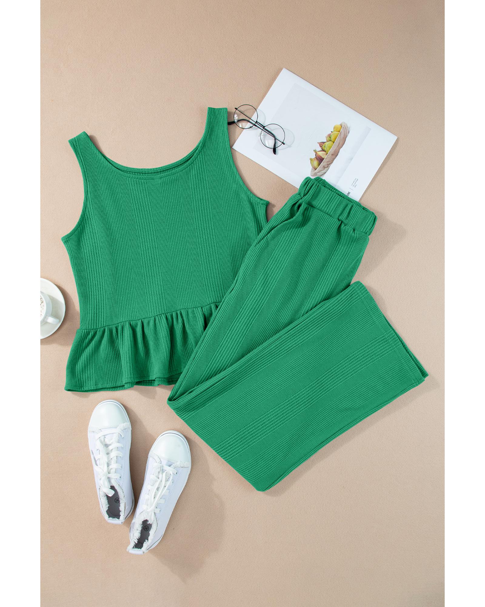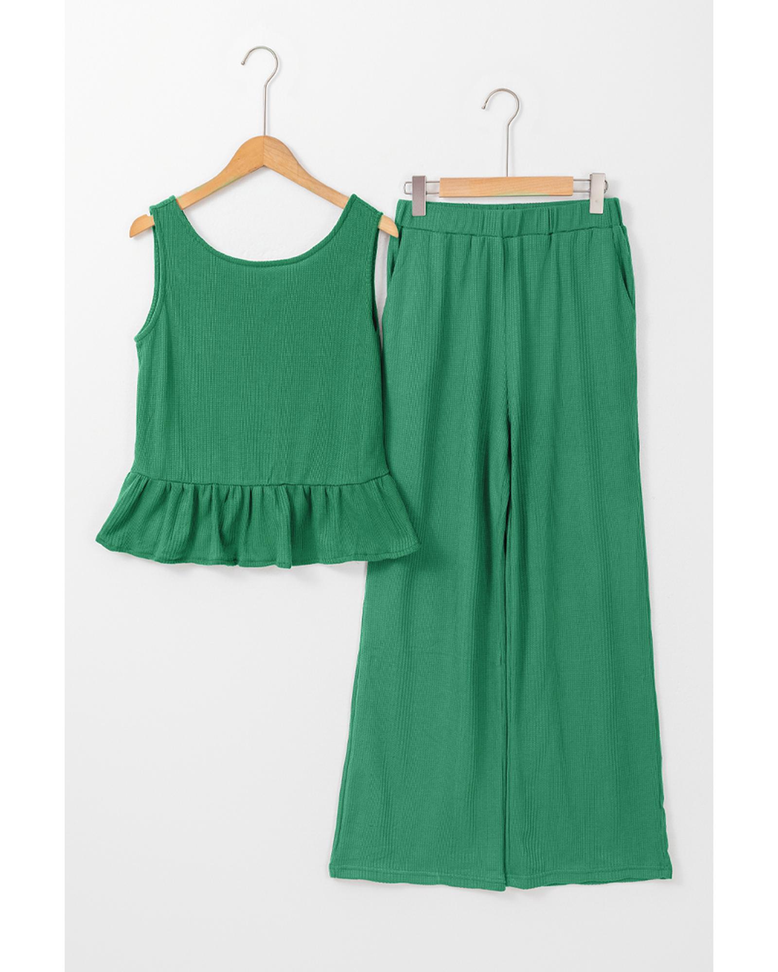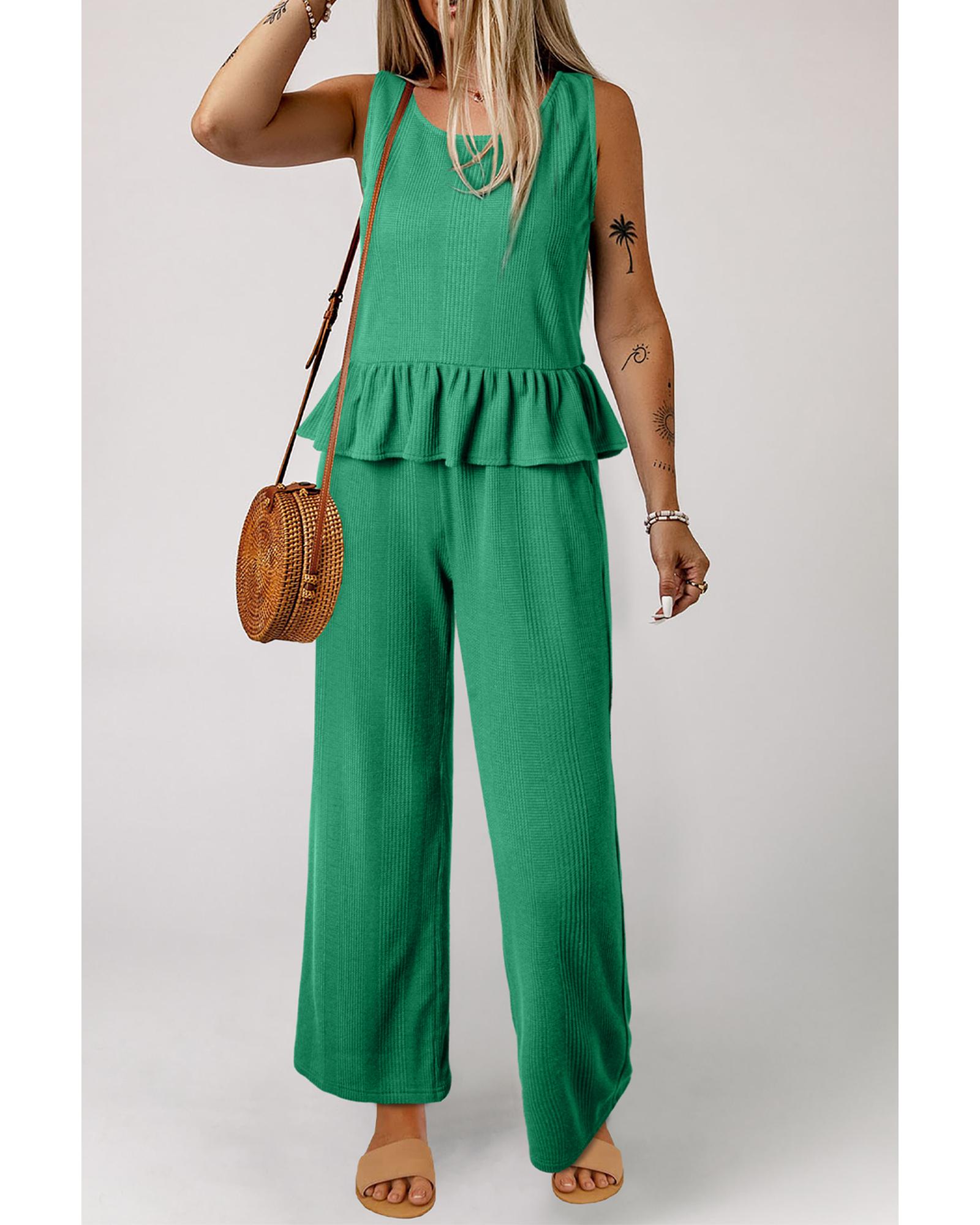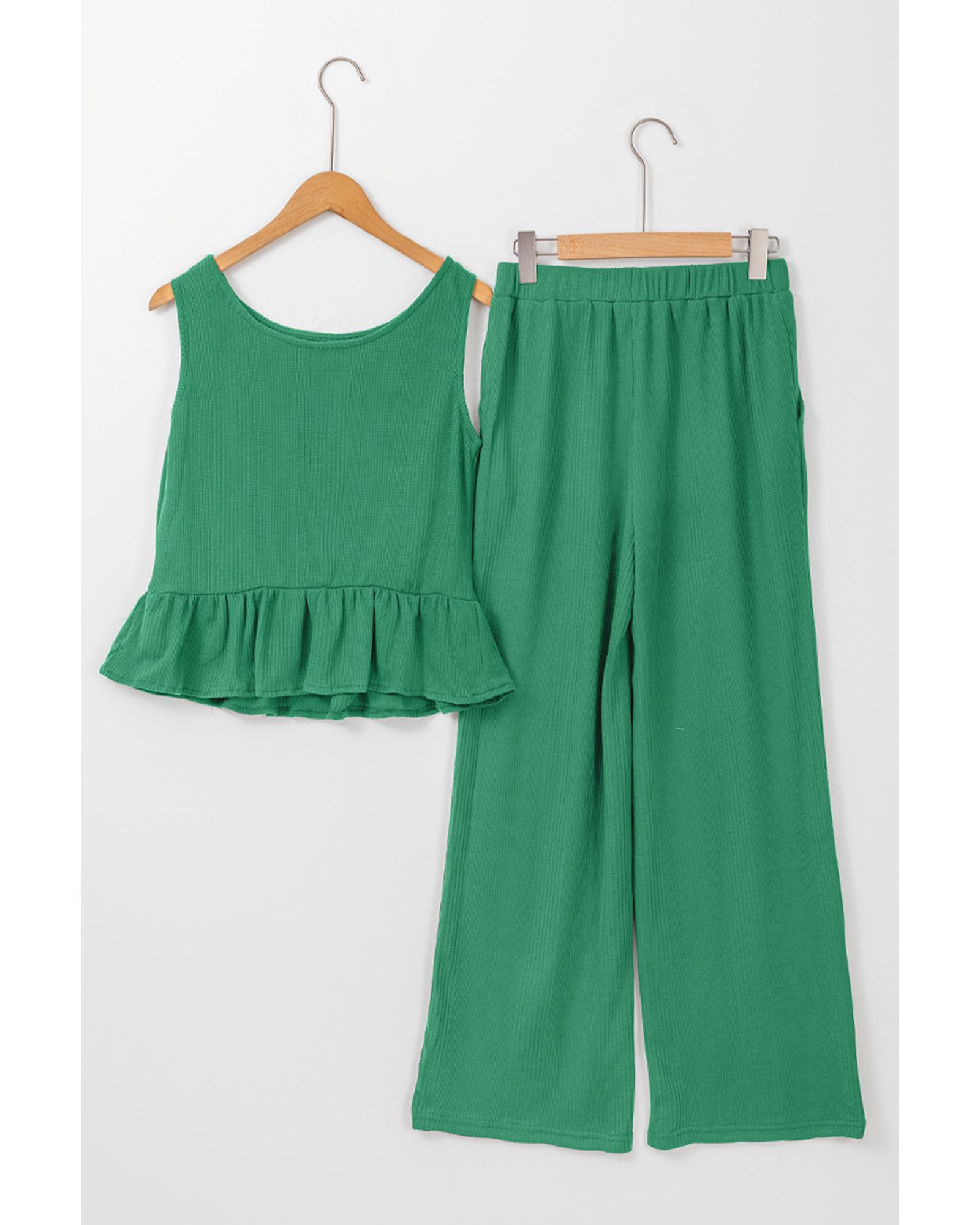 Green Solid Color Ribbed Ruffle Tank Top and Pants Set – S