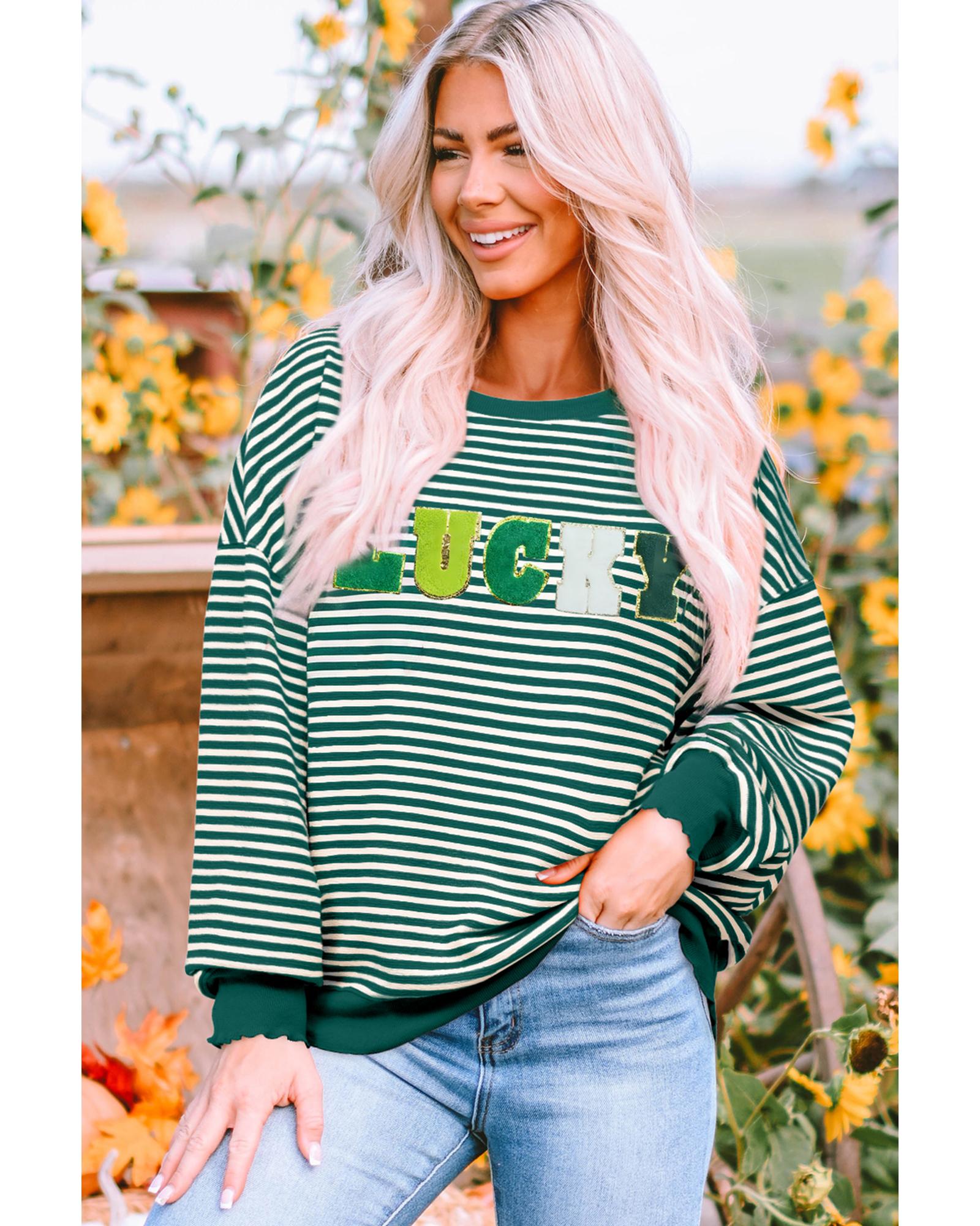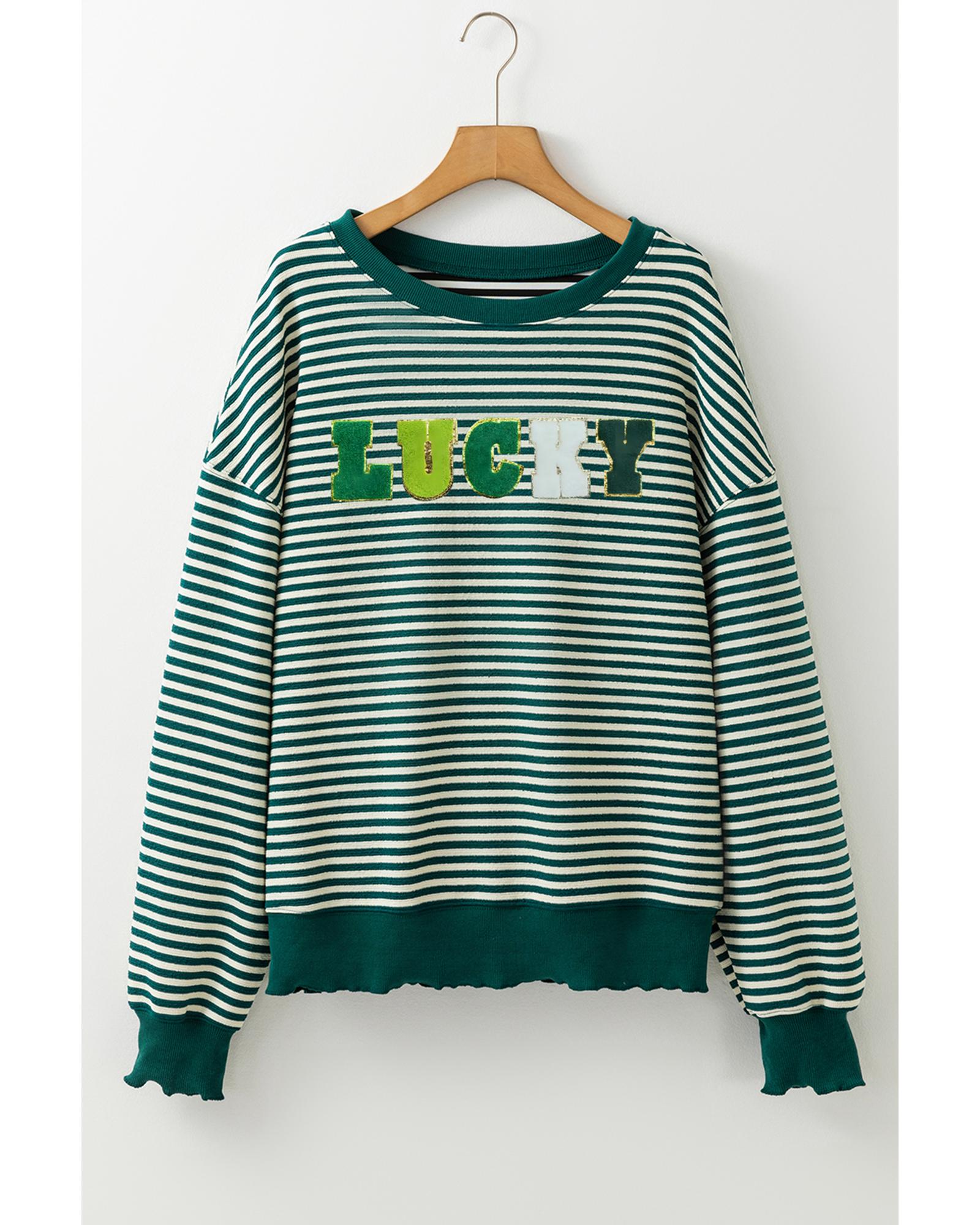 Green Stripe Chenille LUCKY Patched Pattern St Patrick Long Sleeve Top – L