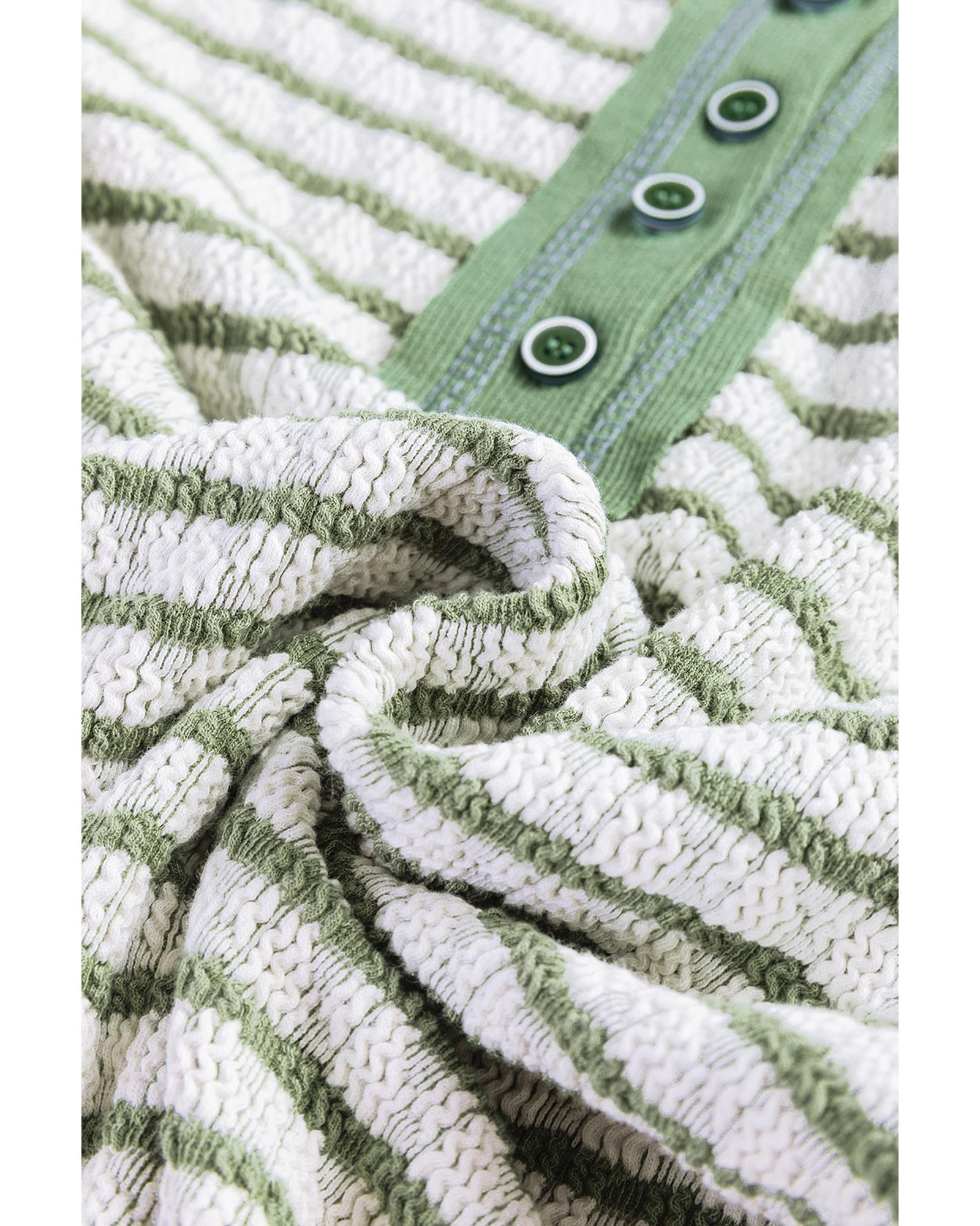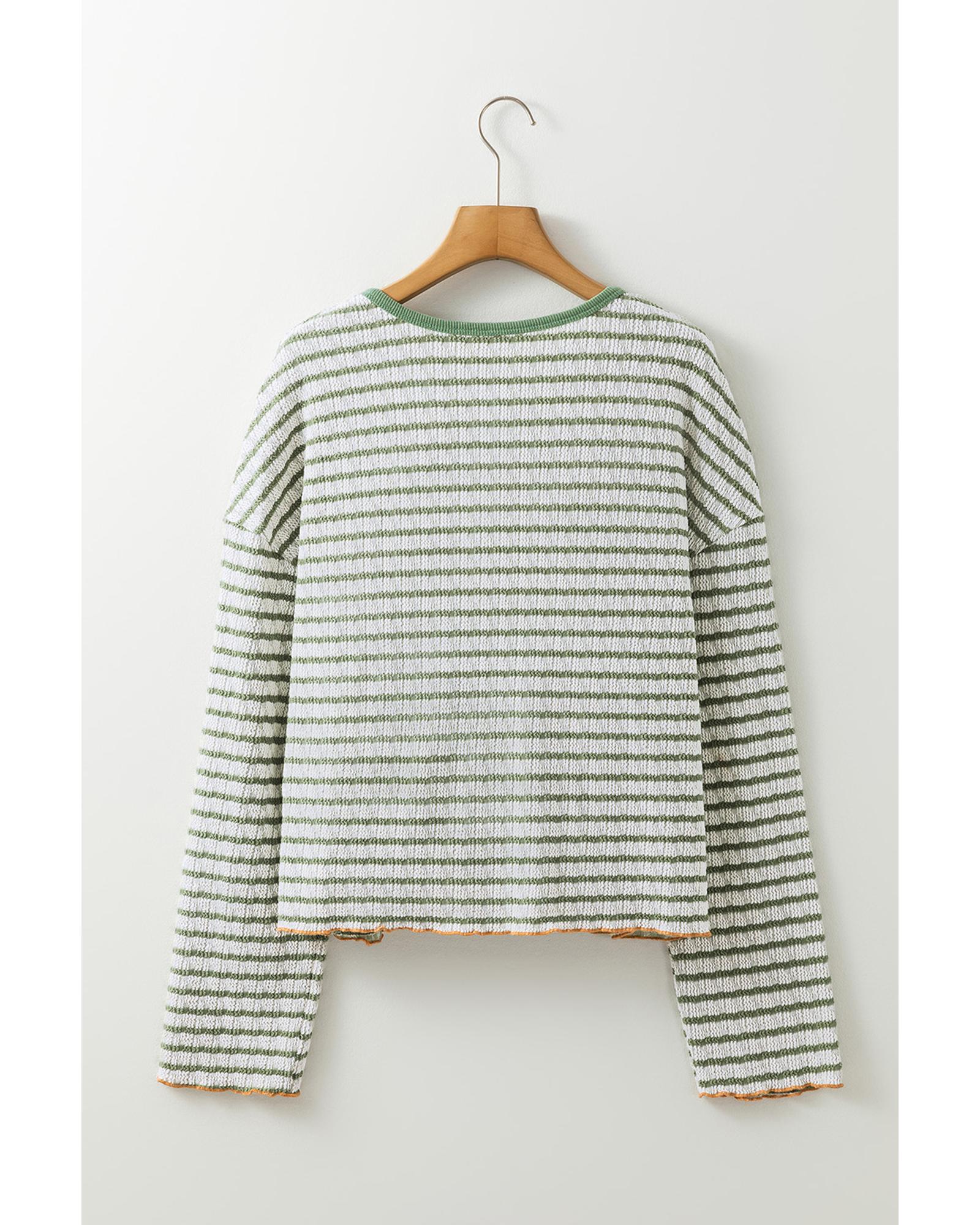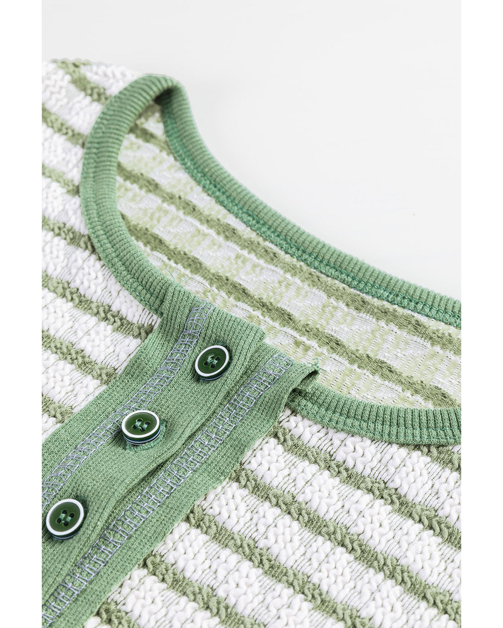 - Green Stripe Textured Frilly Trim Buttons Henley Long Sleeve Top