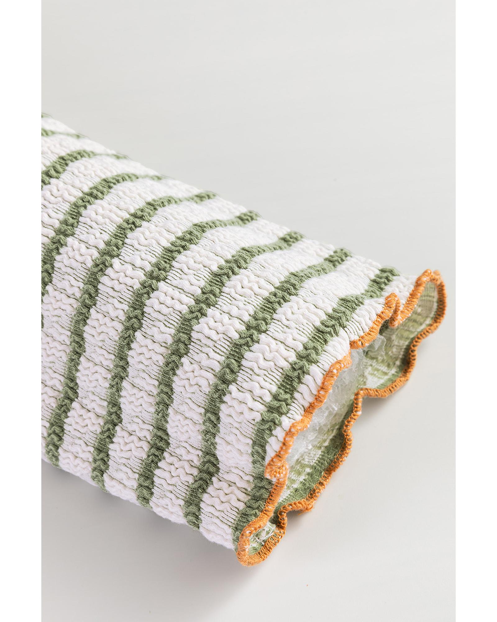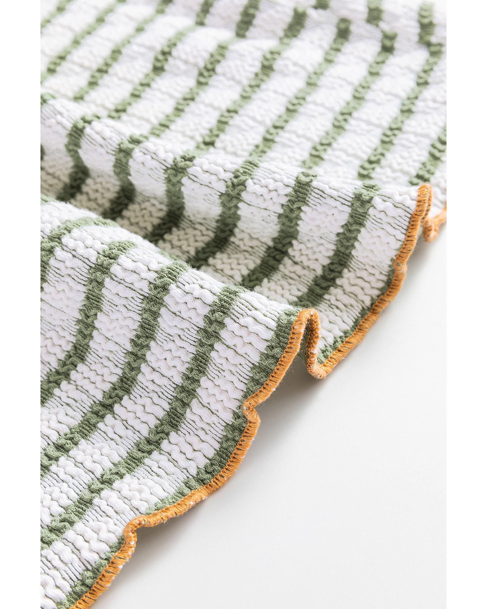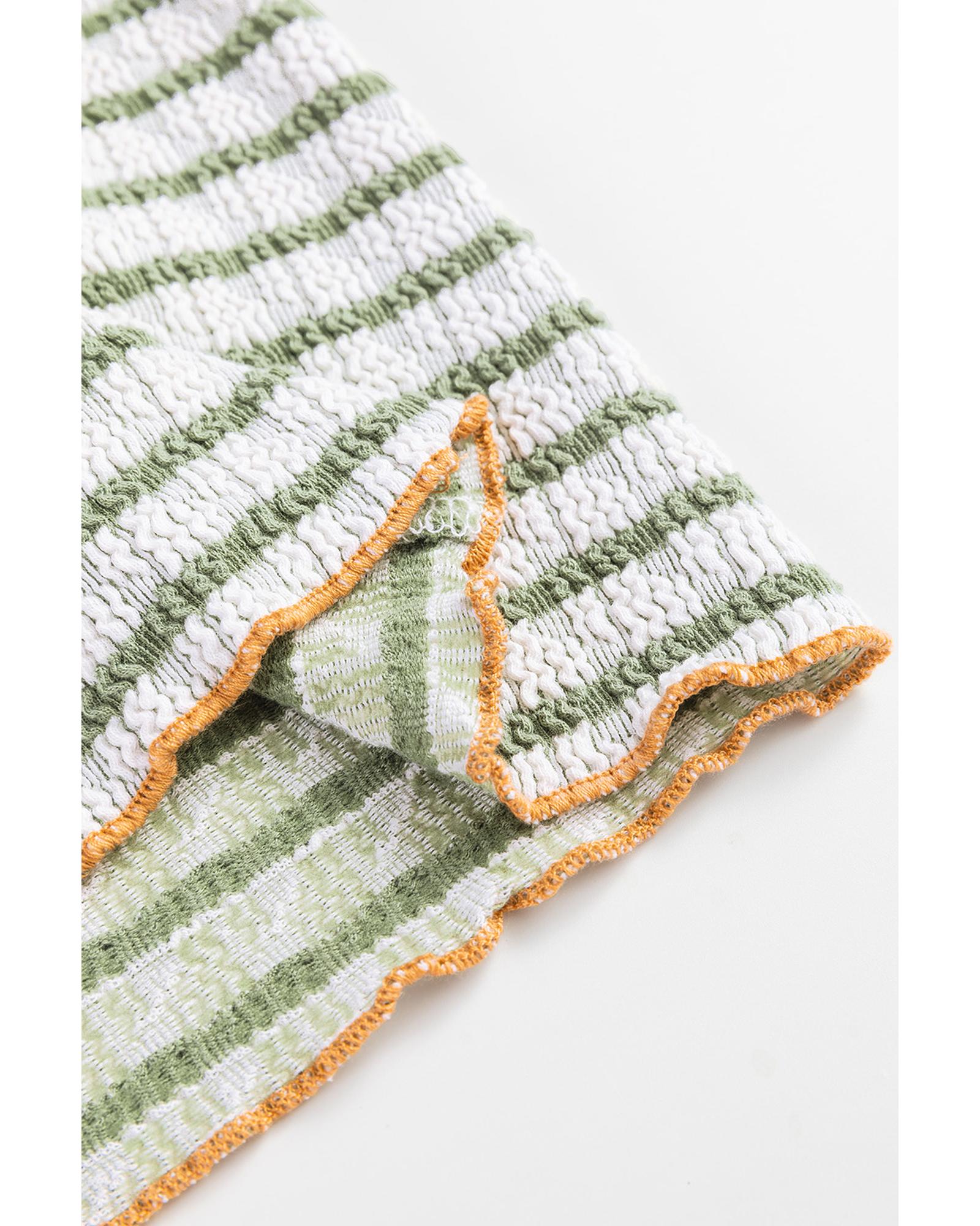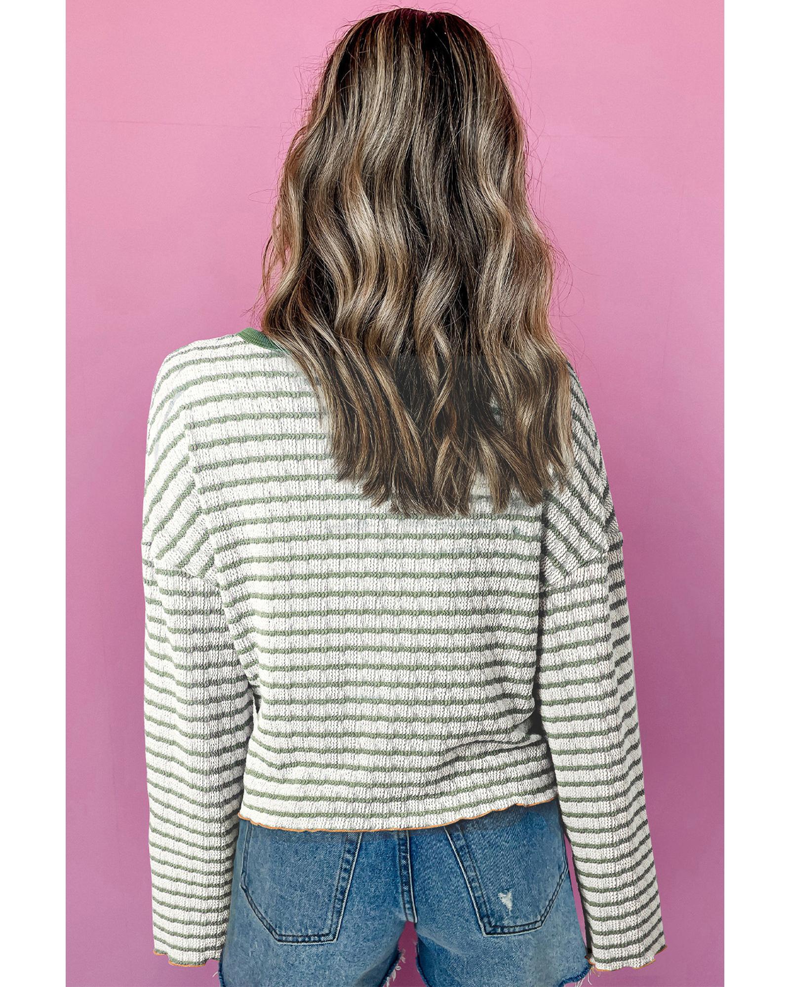 - Green Stripe Textured Frilly Trim Buttons Henley Long Sleeve Top