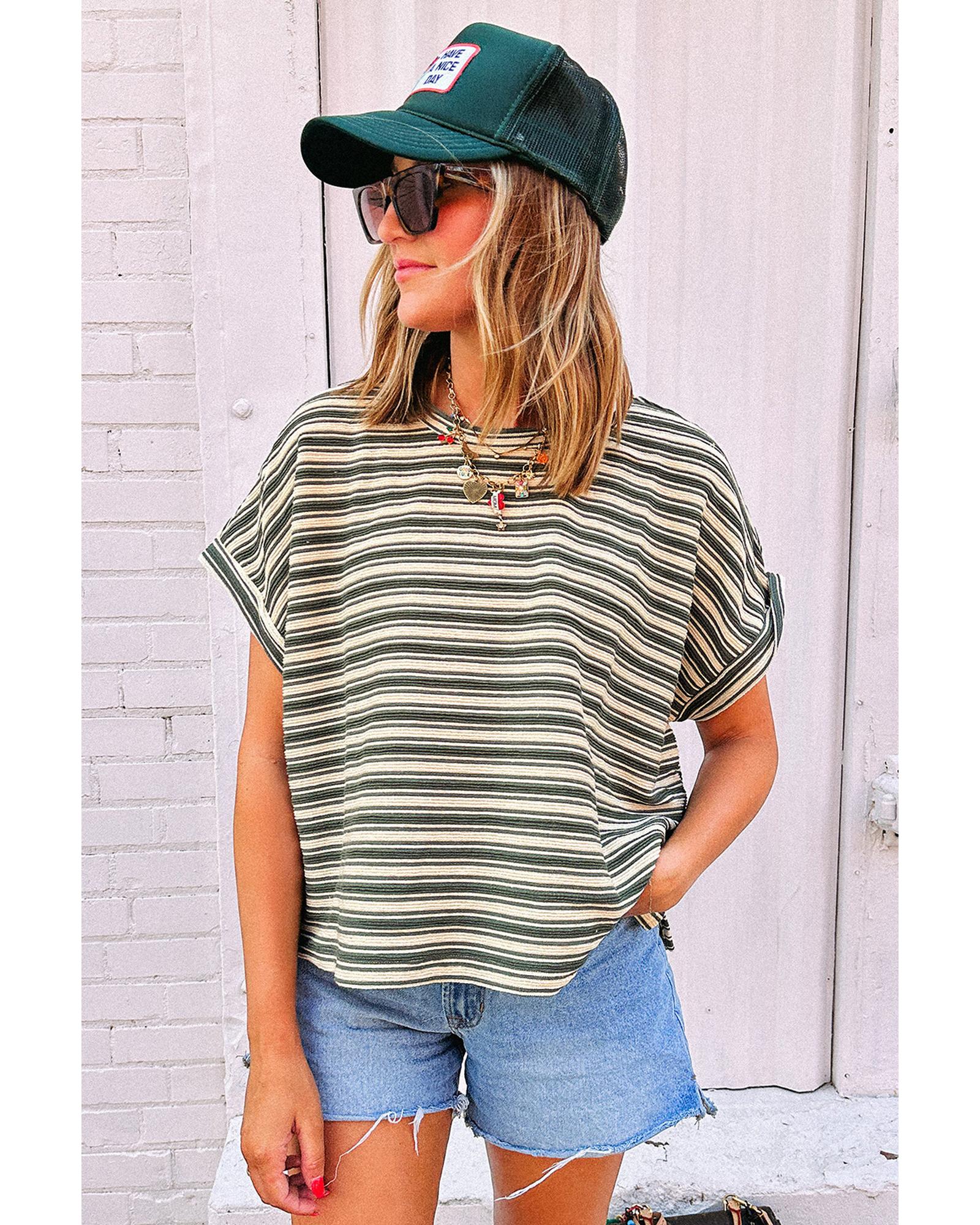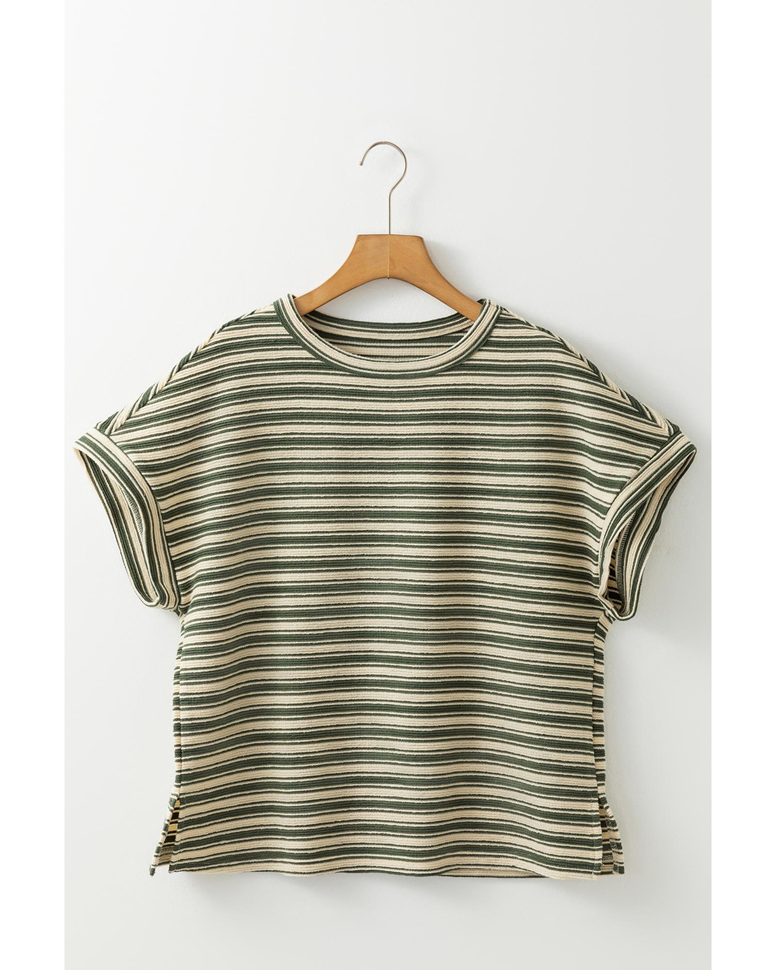 Green Stripe Textured Side Slits Crew Neck T Shirt – XL