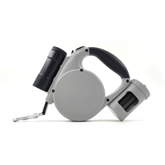 Grey 3-in-1 Retractable Dog Leash with LED Flashlight & Poop Bag Dispenser | Heavy Duty Tangle-Free Leash for Safe Night Walks