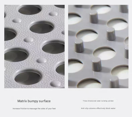 • Rapid-Drainage Design: Engineered with large drainage holes and elevated by sturdy support columns, these mats allow water to flow through and away quickly. This prevents water from pooling, reduces soap scum buildup, and helps keep your floors dry and clean.