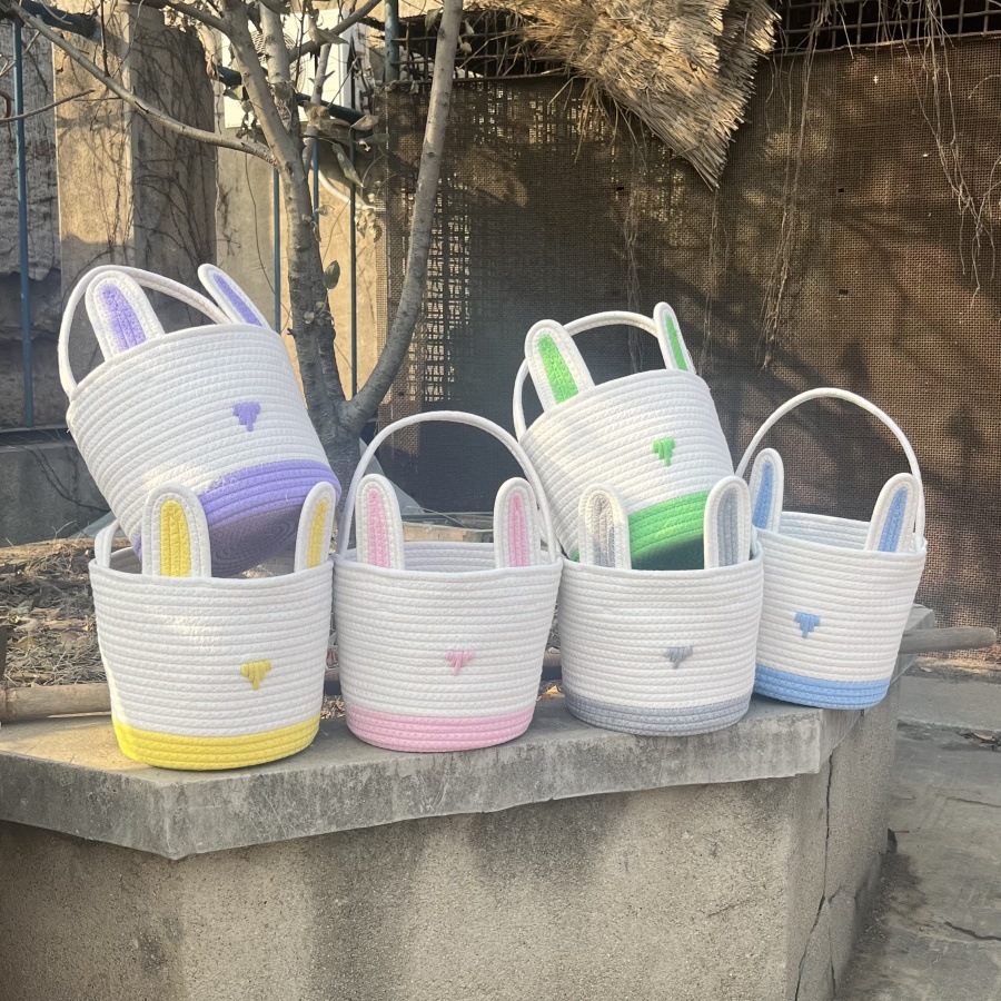 Grey And White Stitching Charming Easter Egg Tote Basket – Cute Rabbit-Themed Handwoven Cotton Rope Candy Holder